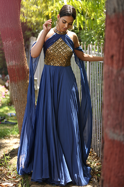 Halter pleated geometric boxes metallic sequins embellished gown with flowy cape sleeves and net inserts at the back.