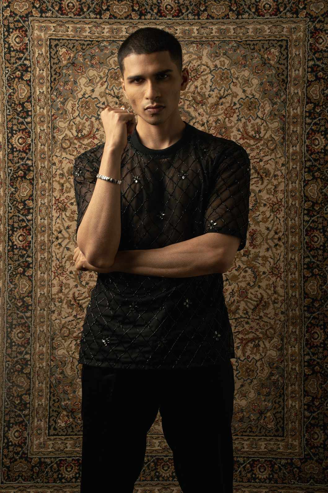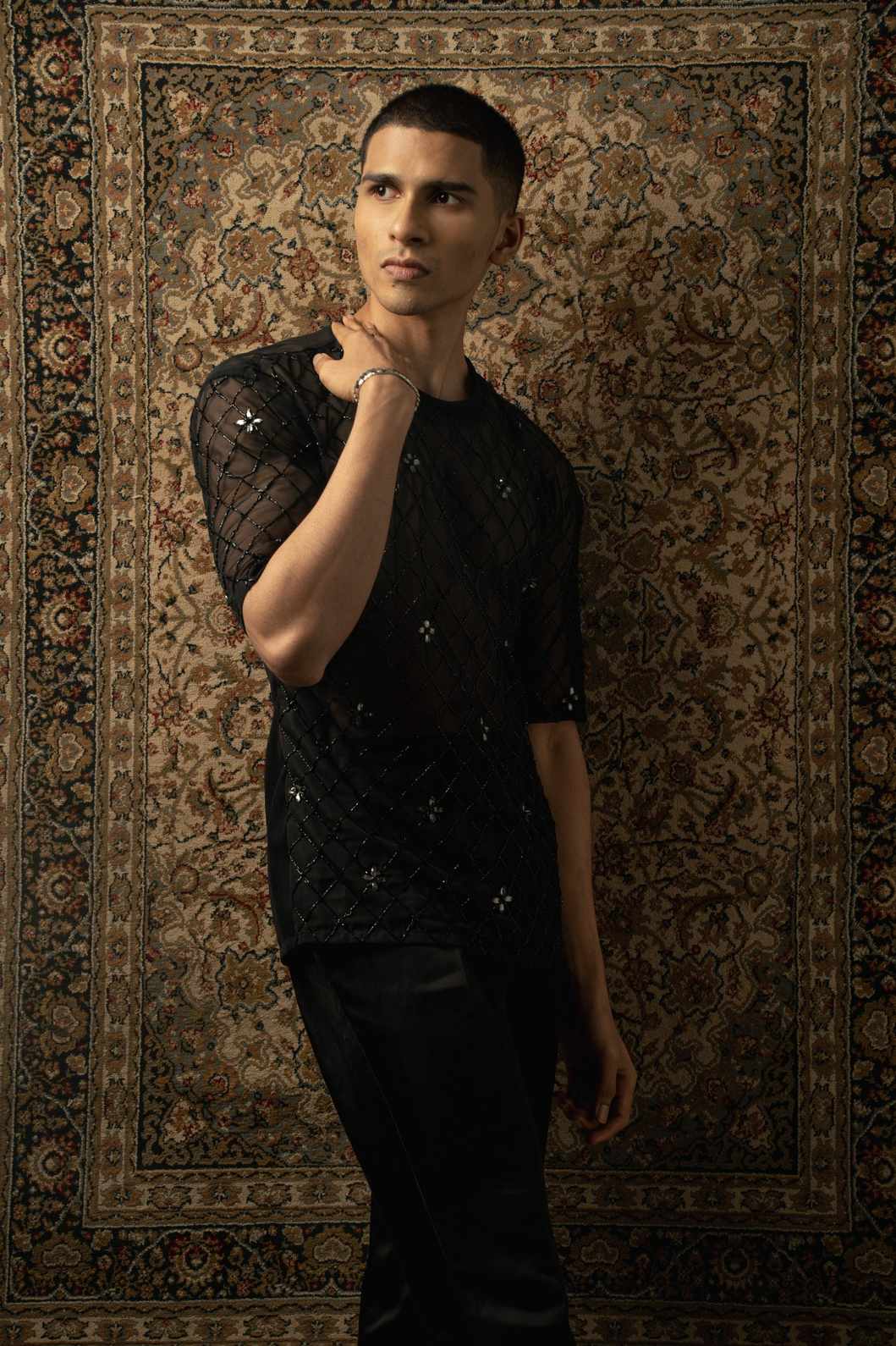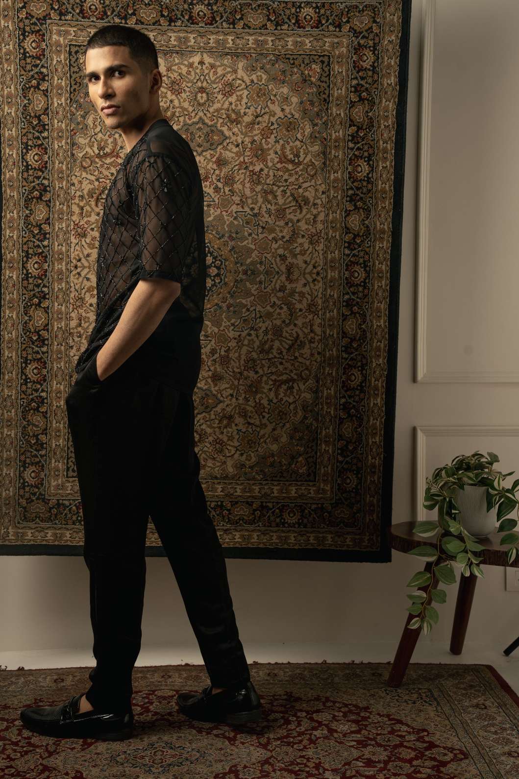 This black set exudes a classy appeal, blending regal sophistication with elegance. The t-shirt, crafted from the finest net, features tonal hand embroidery that adds a touch of luxury and refinement. Perfect for those seeking to make a statement with a hint of rebellion, this ensemble strikes the perfect balance between ruggedness and elegance, making it a standout choice for any occasion.