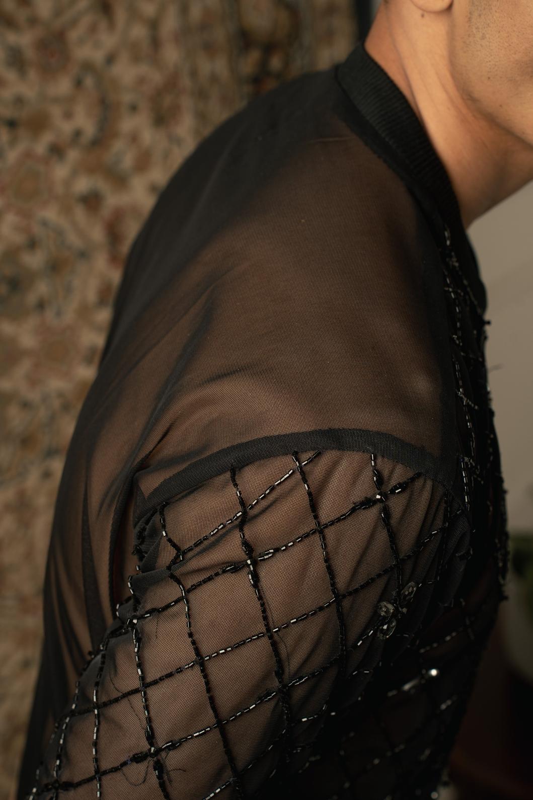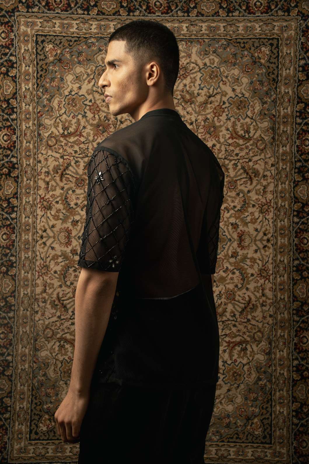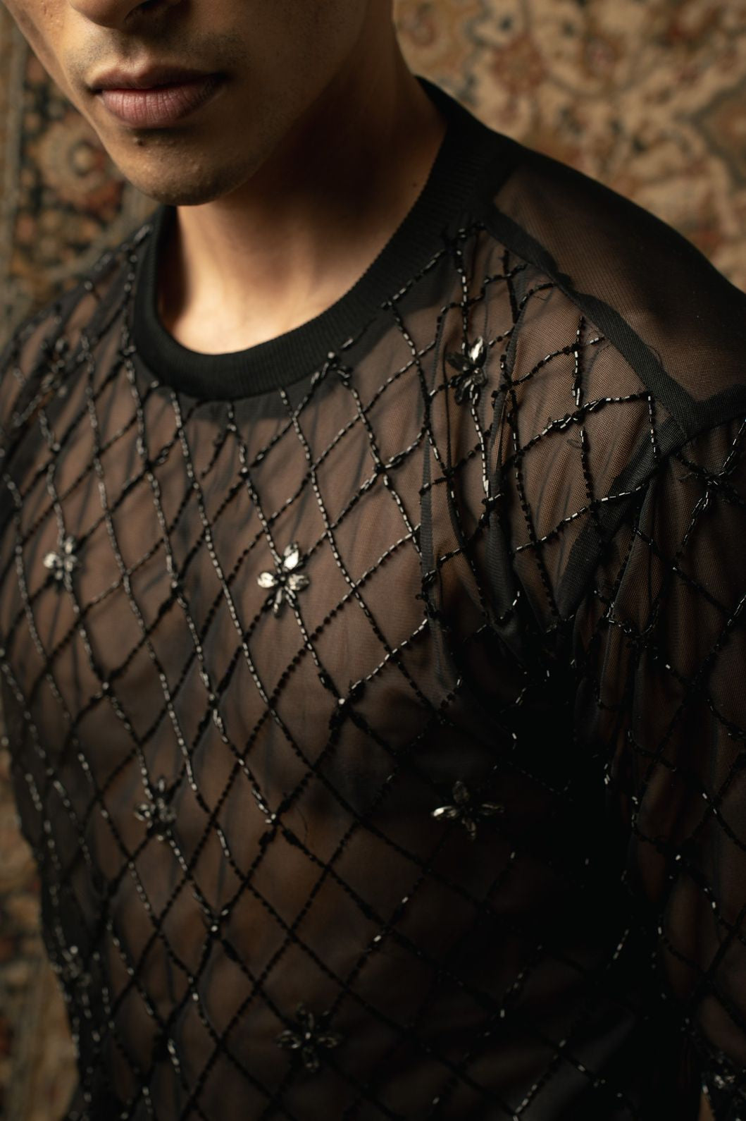 This black set exudes a classy appeal, blending regal sophistication with elegance. The t-shirt, crafted from the finest net, features tonal hand embroidery that adds a touch of luxury and refinement. Perfect for those seeking to make a statement with a hint of rebellion, this ensemble strikes the perfect balance between ruggedness and elegance, making it a standout choice for any occasion.