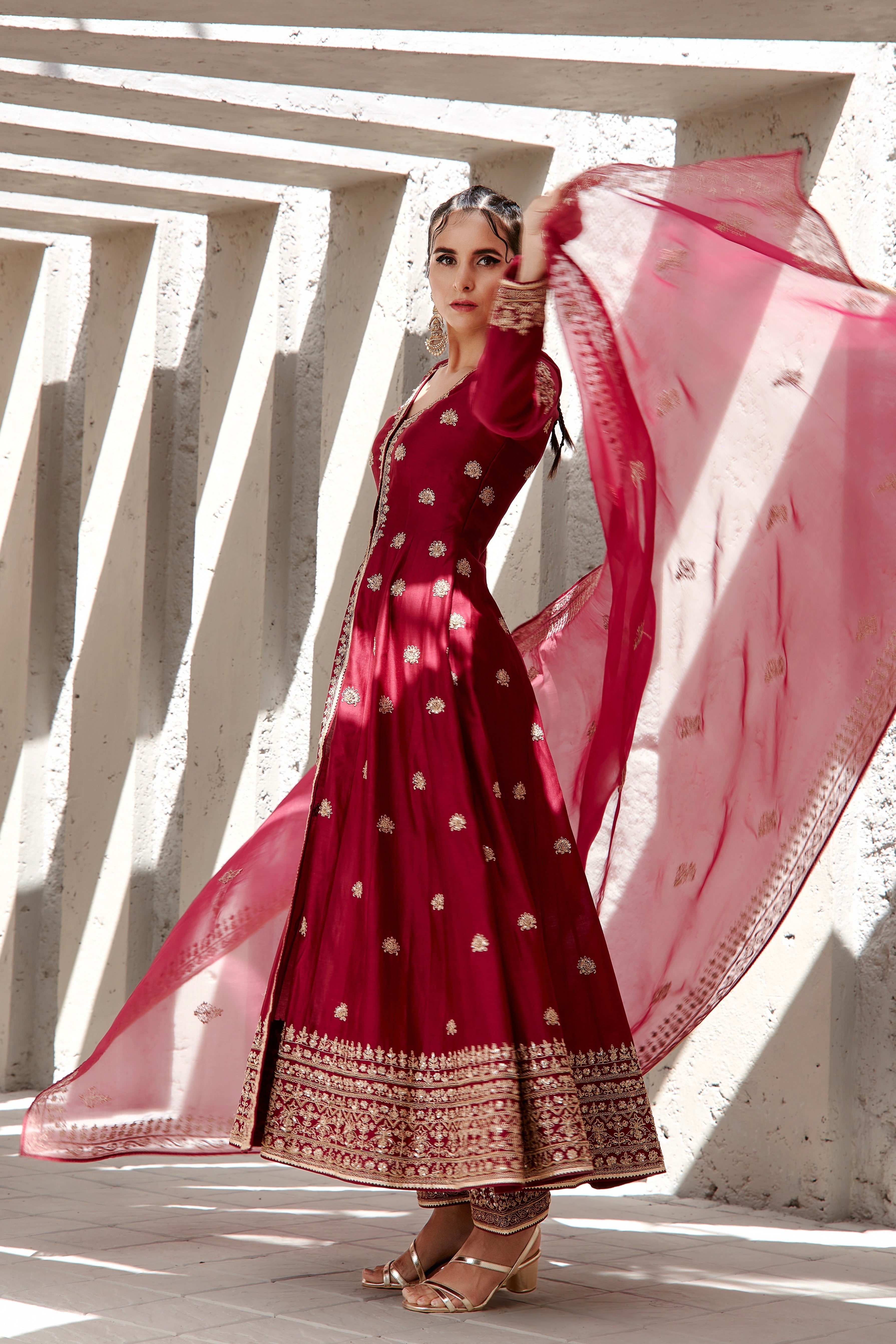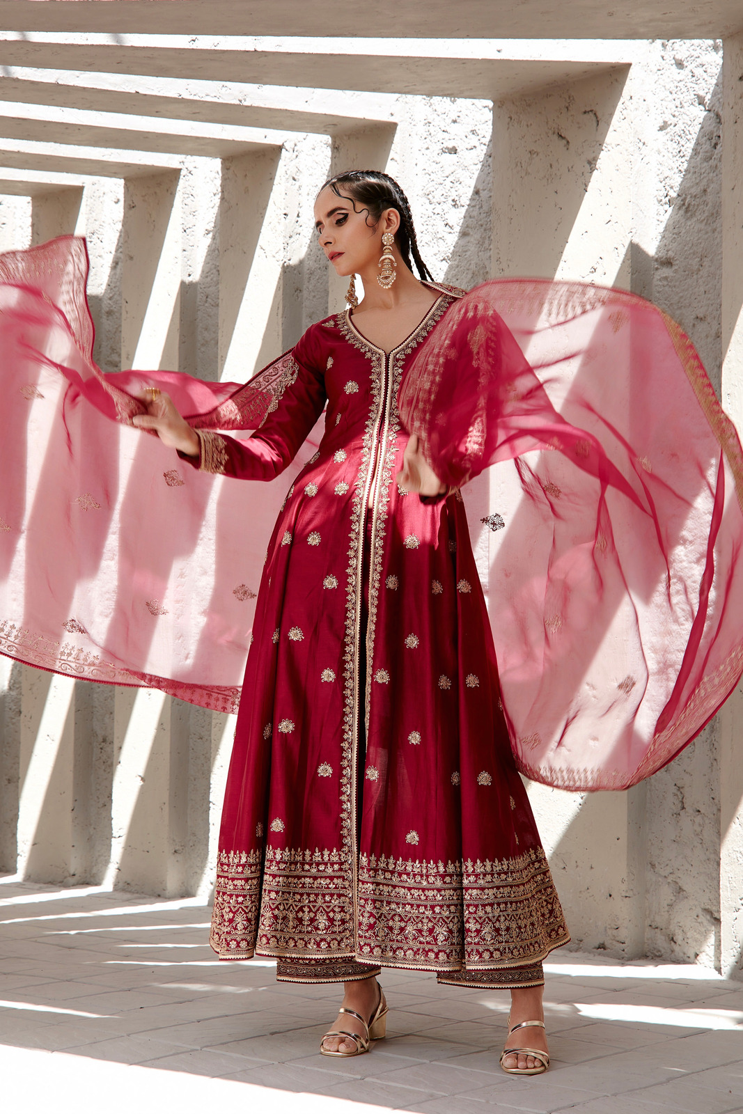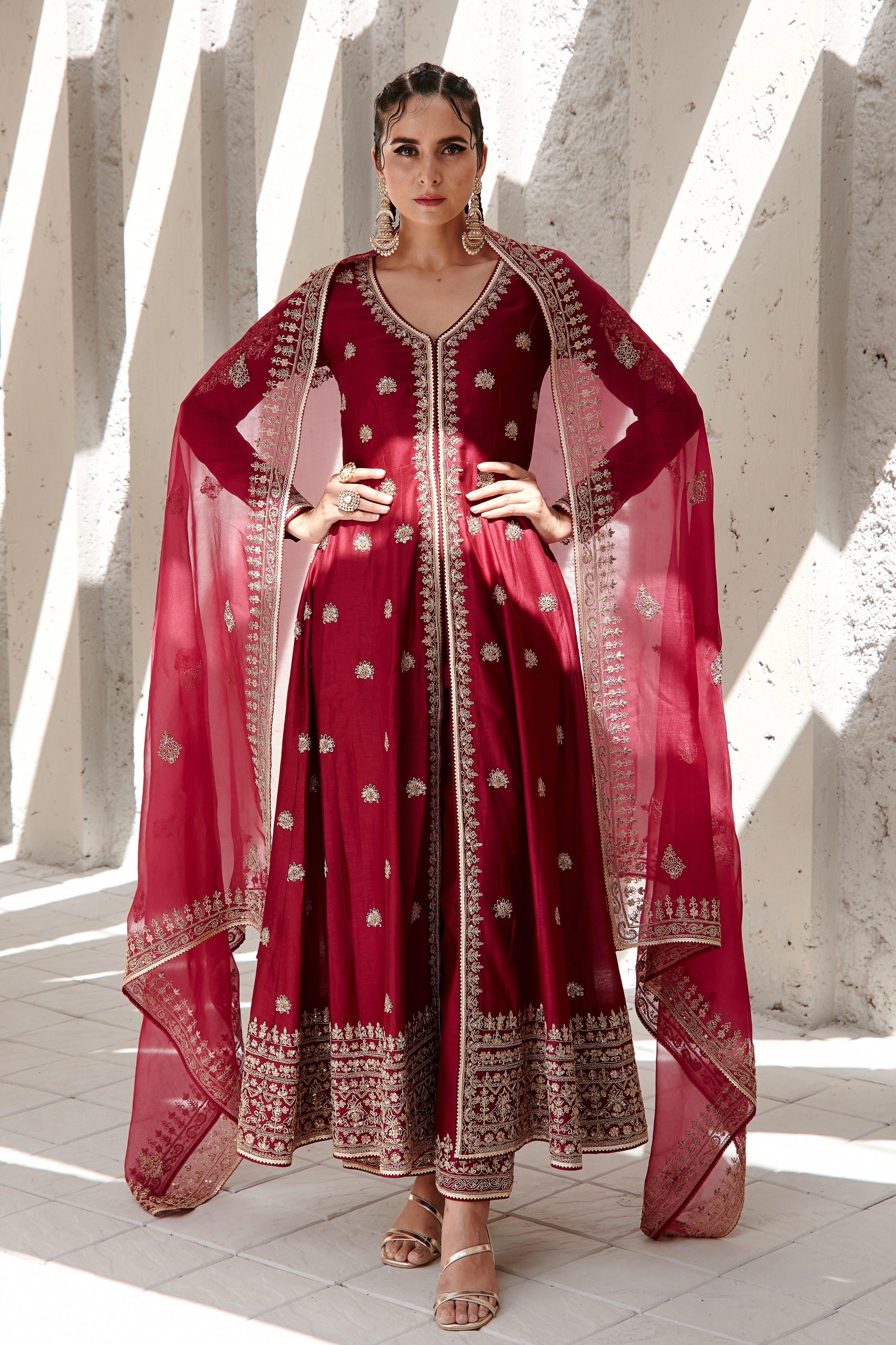 Featuring a wine jacket in a Chanderi base with dori work and sequins embroidery. It is paired with matching embroidered pants and an organza dupatta