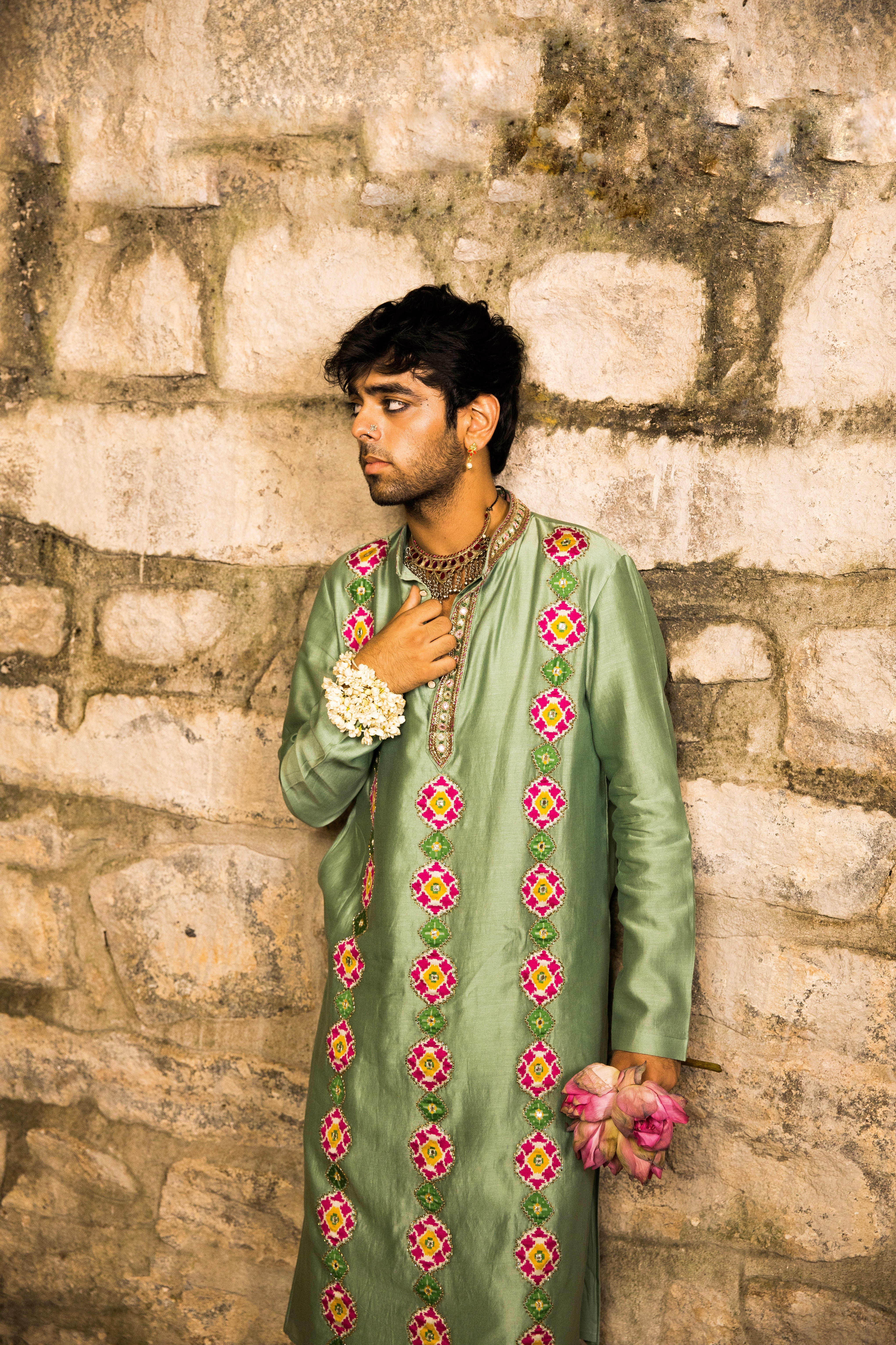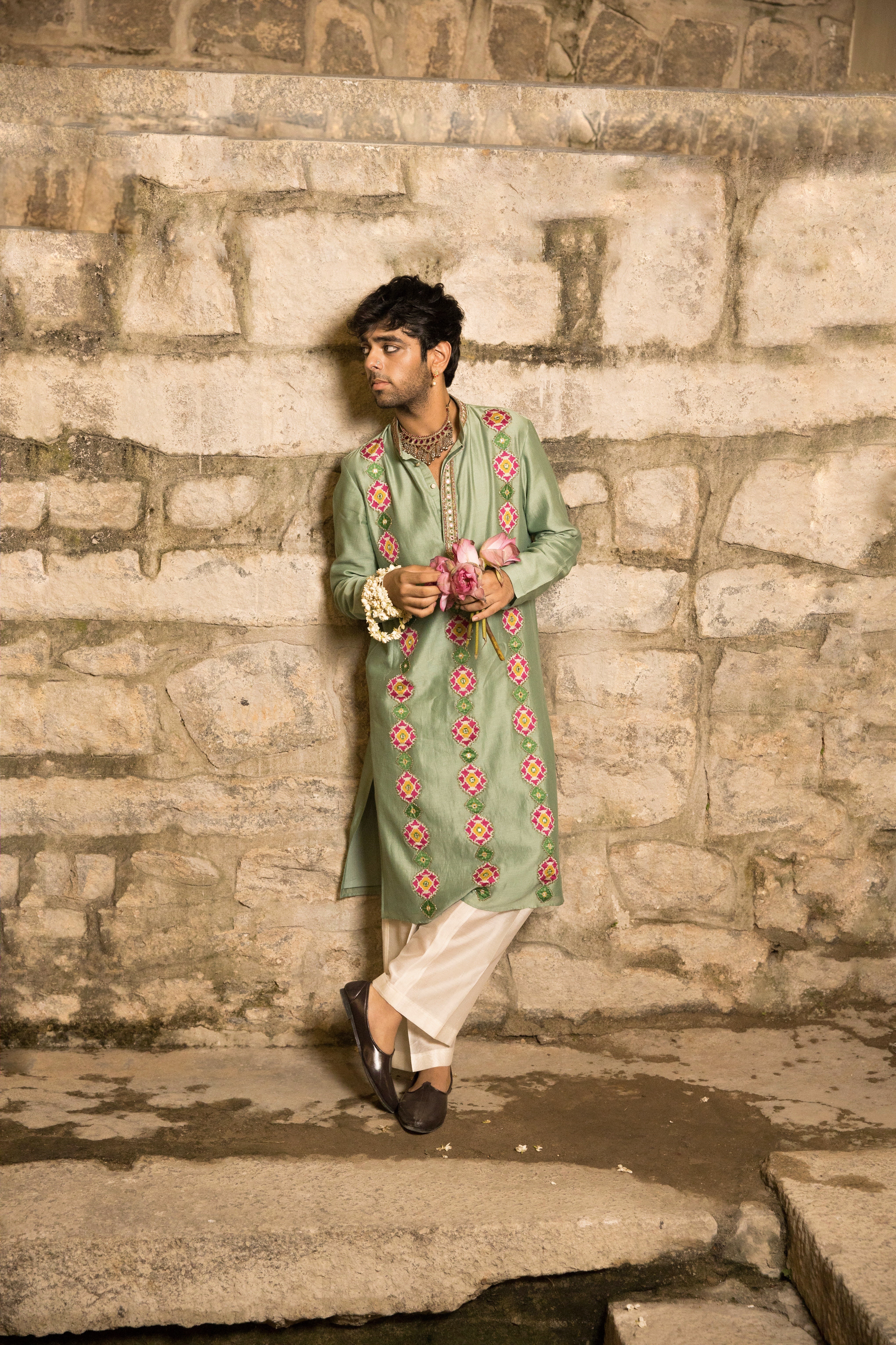 Featuring pistachio green embroidered kurta set, a regal and distinguished attire, materializes as a tasteful fusion of traditional charm and contemporary finesse. Complemented by coordinating pants, this ensemble exudes a dignified opulence. This attire is perfect for festive celebrations.