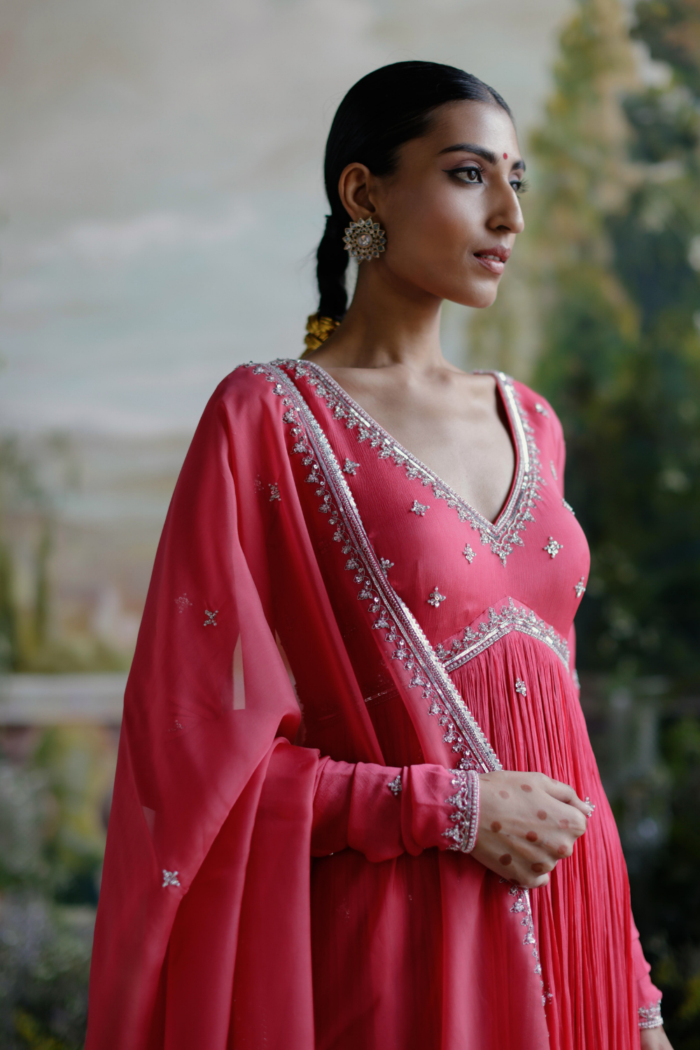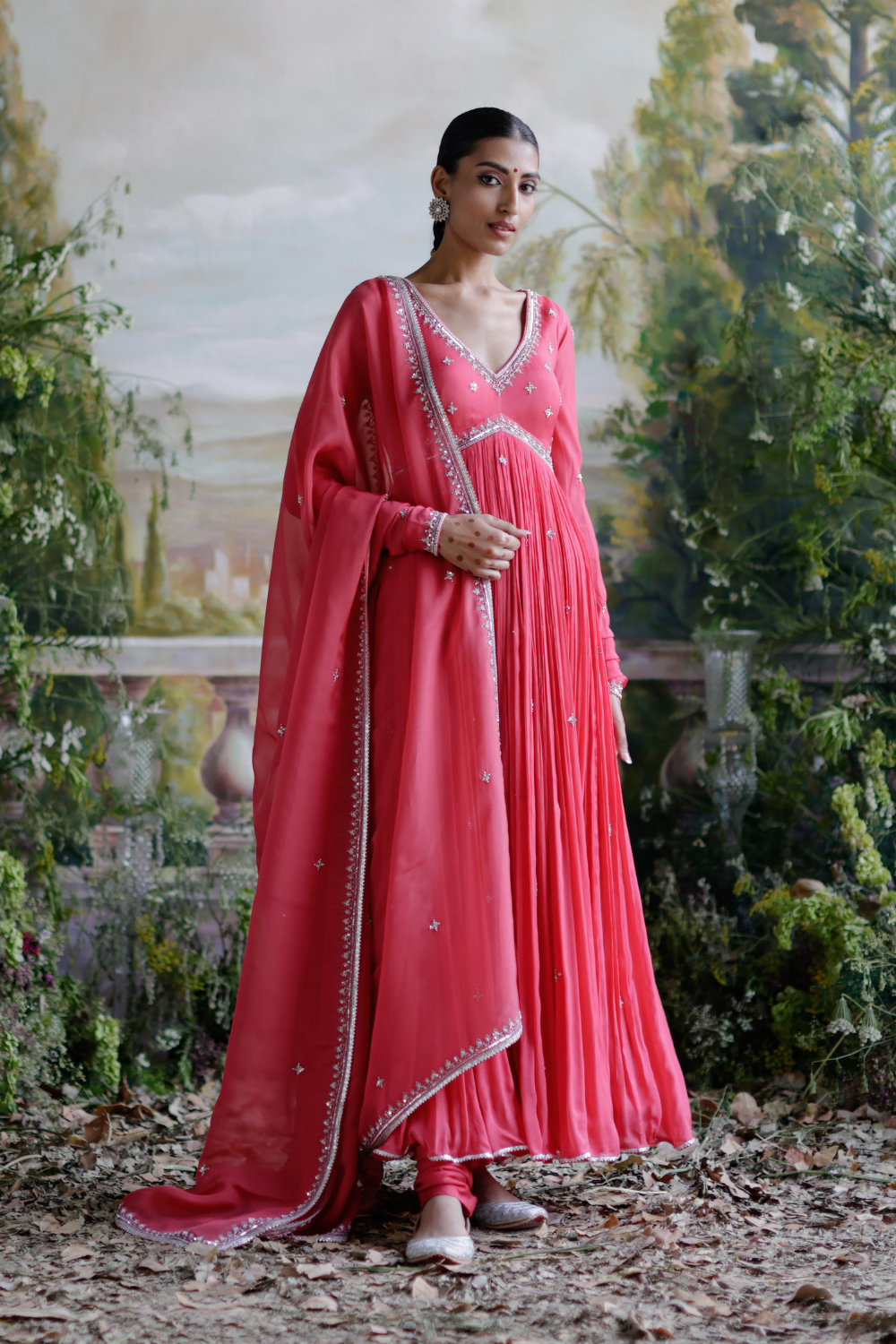 Featuring a pink chinon chiffon Anarkali set paired with an organza base dupatta with silver dori and embellished pearl hand embroidery.