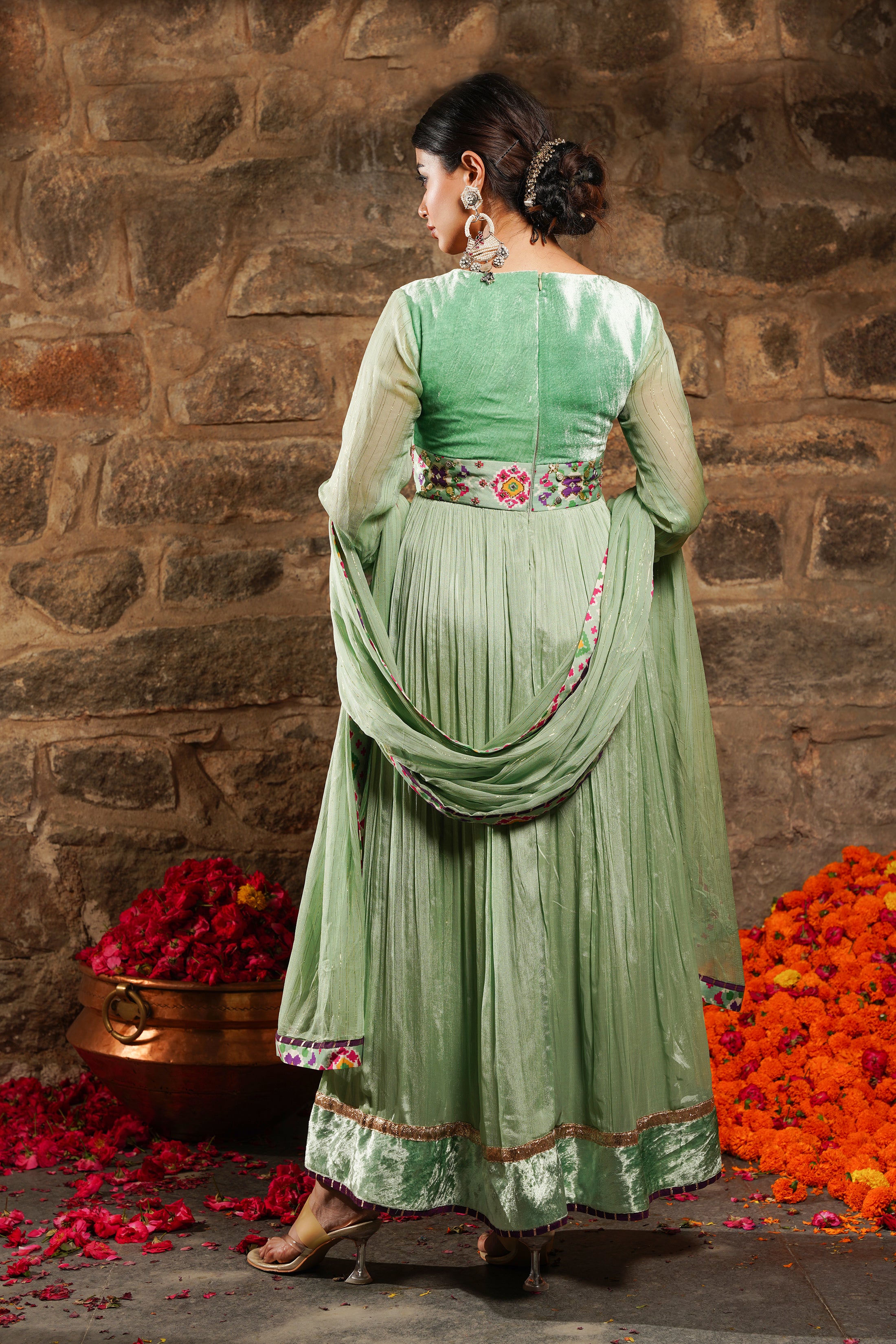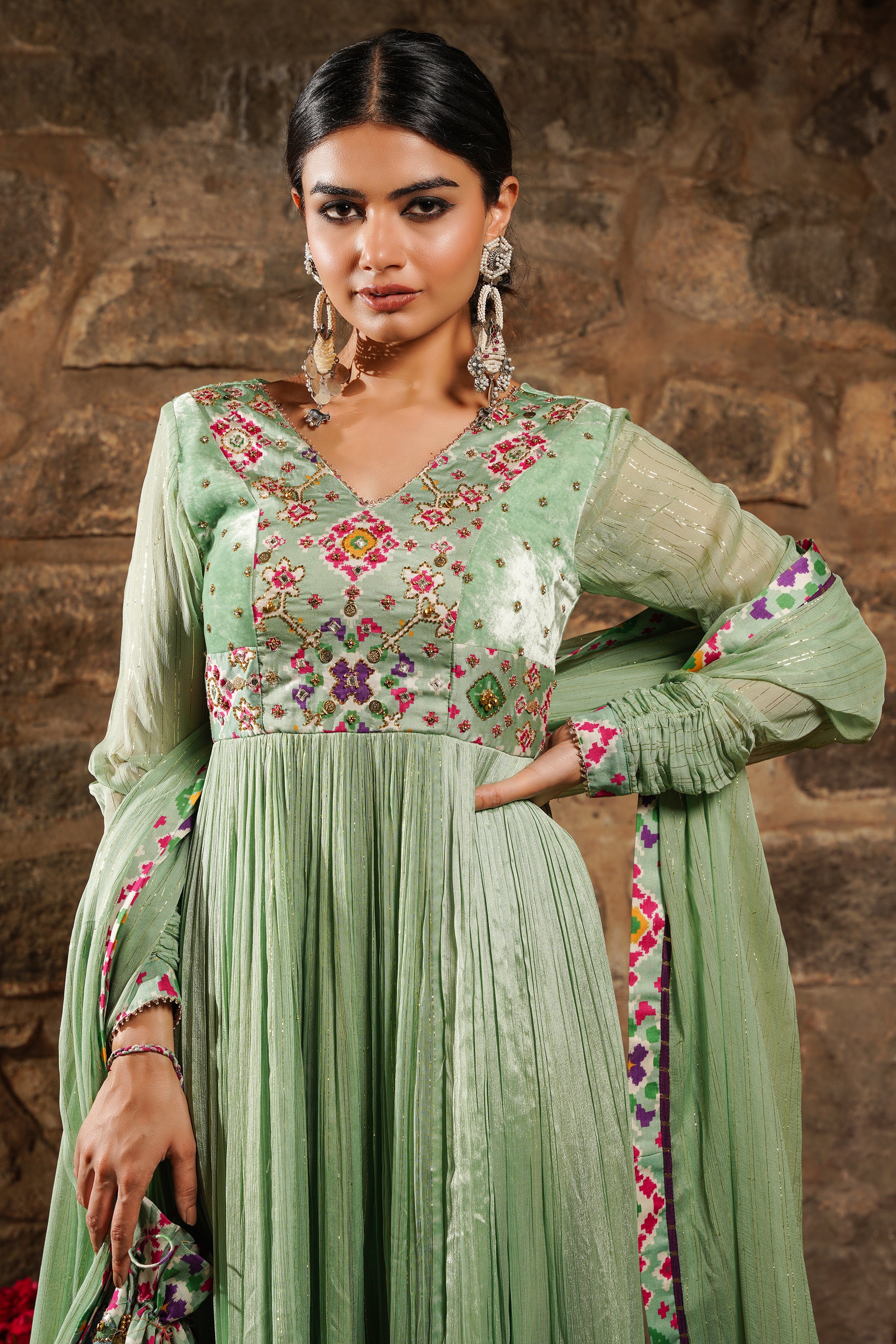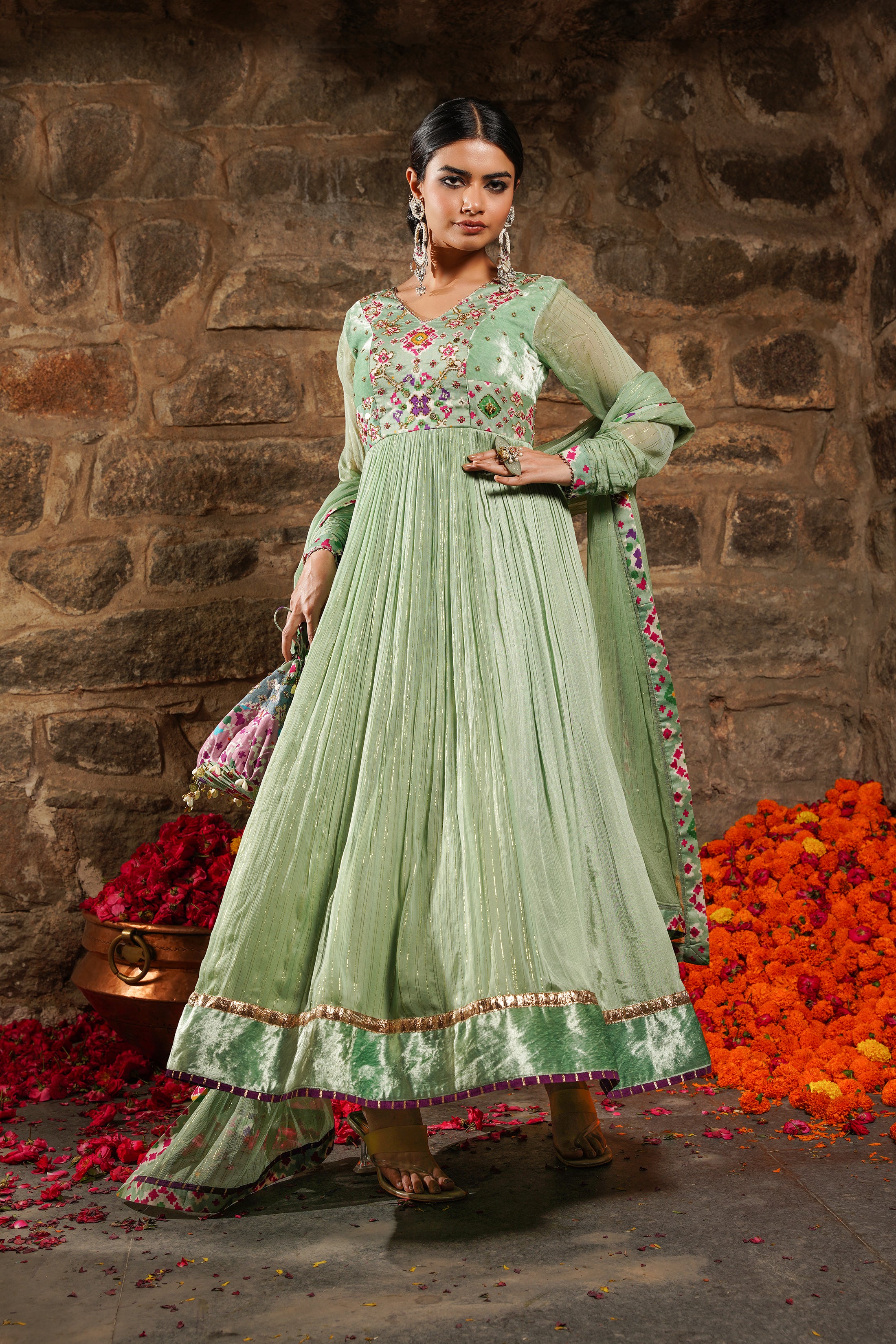 A resplendent pistachio green Anarkali set, paired with chiffon dupatta, features a sleek silhouette, making a statement in elegance. This ensemble is perfect for festive occasions and ceremonies.