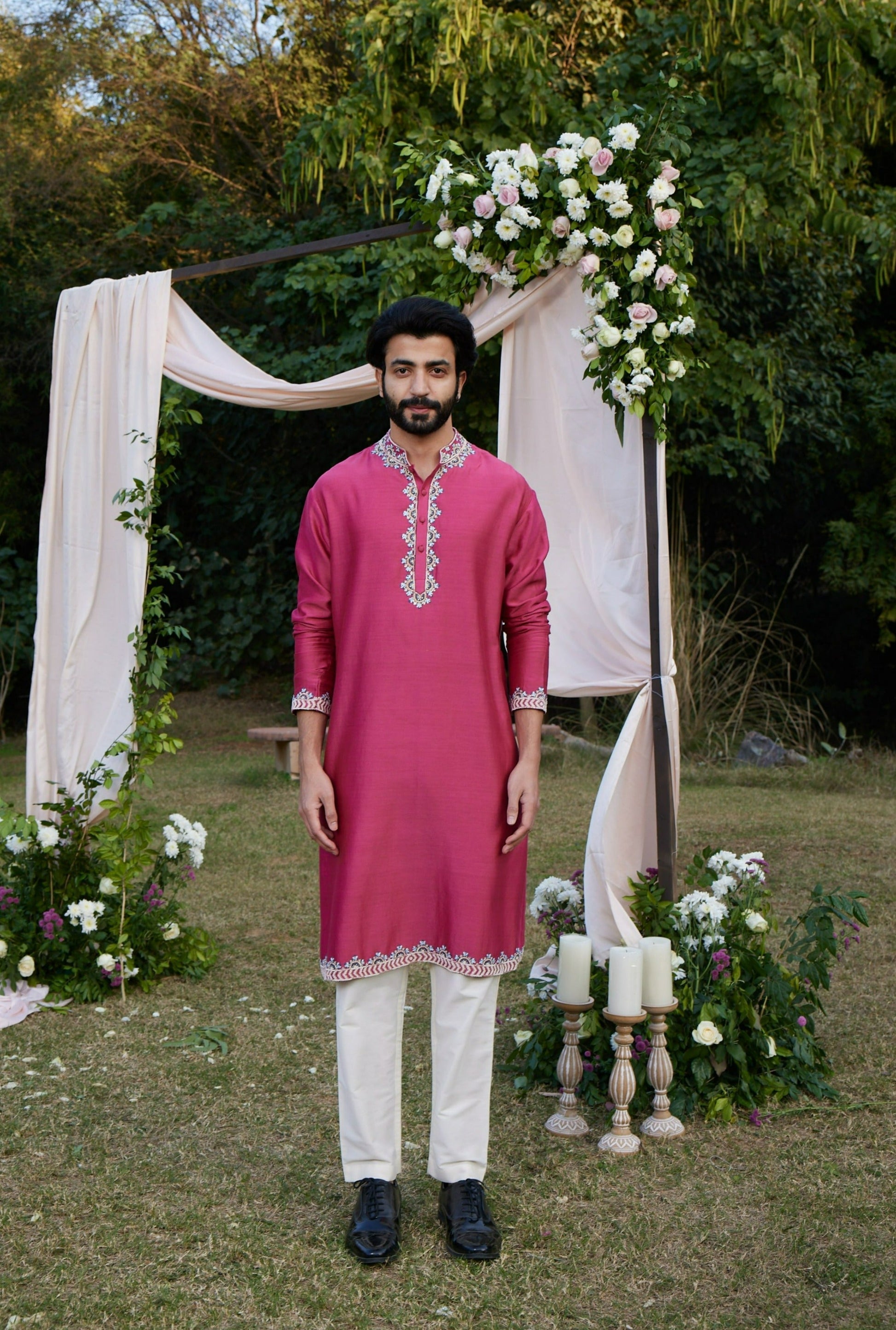 Showcasing chanderi silk based wine kurta, with geometrical pattern. Handcrafted with