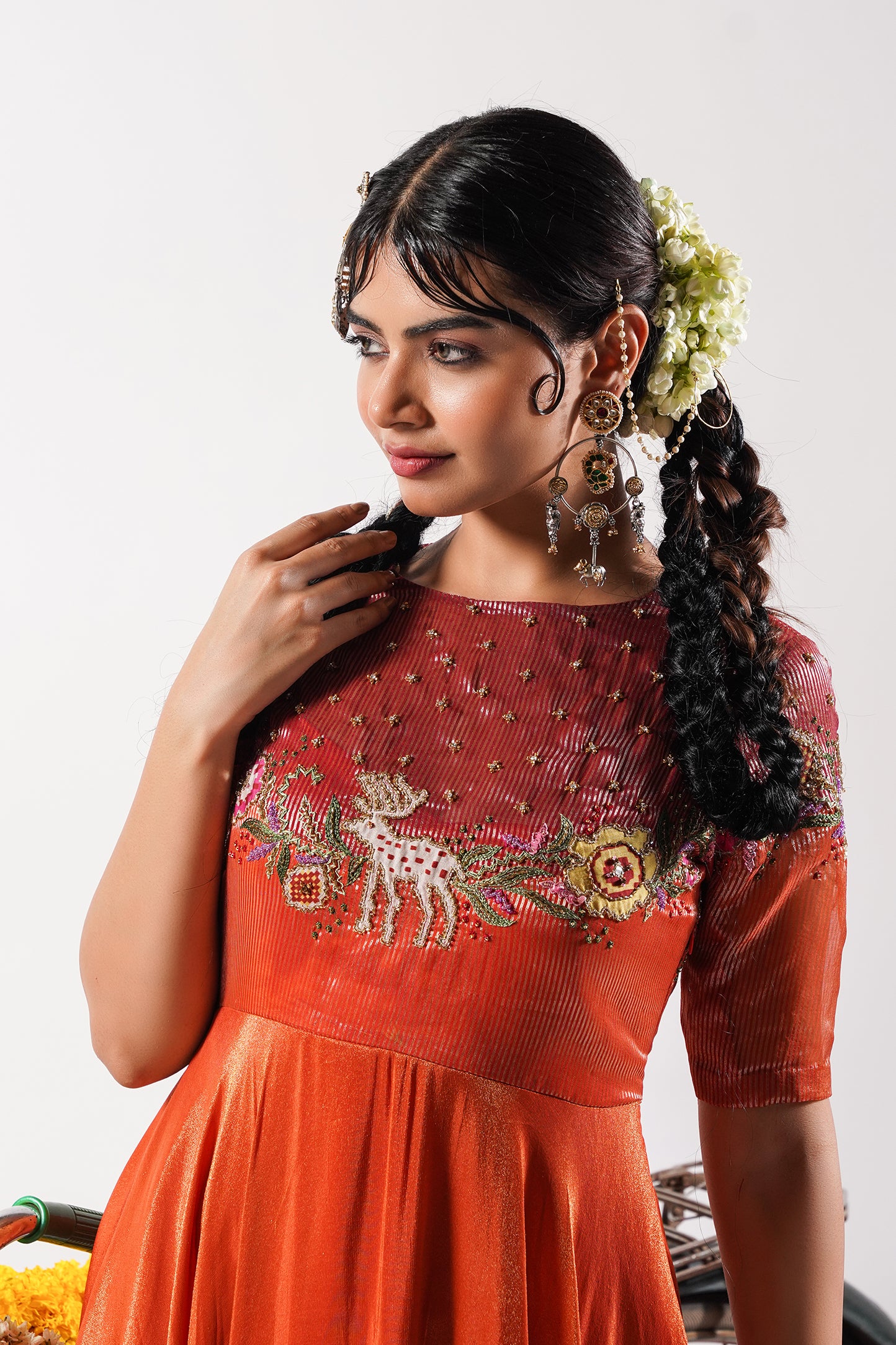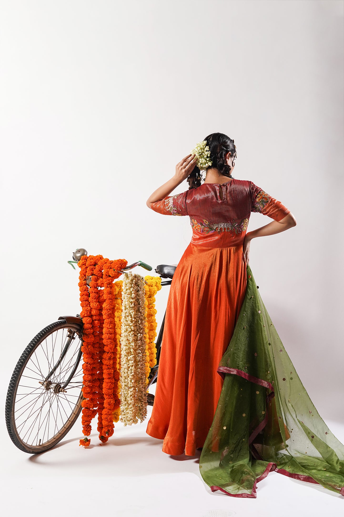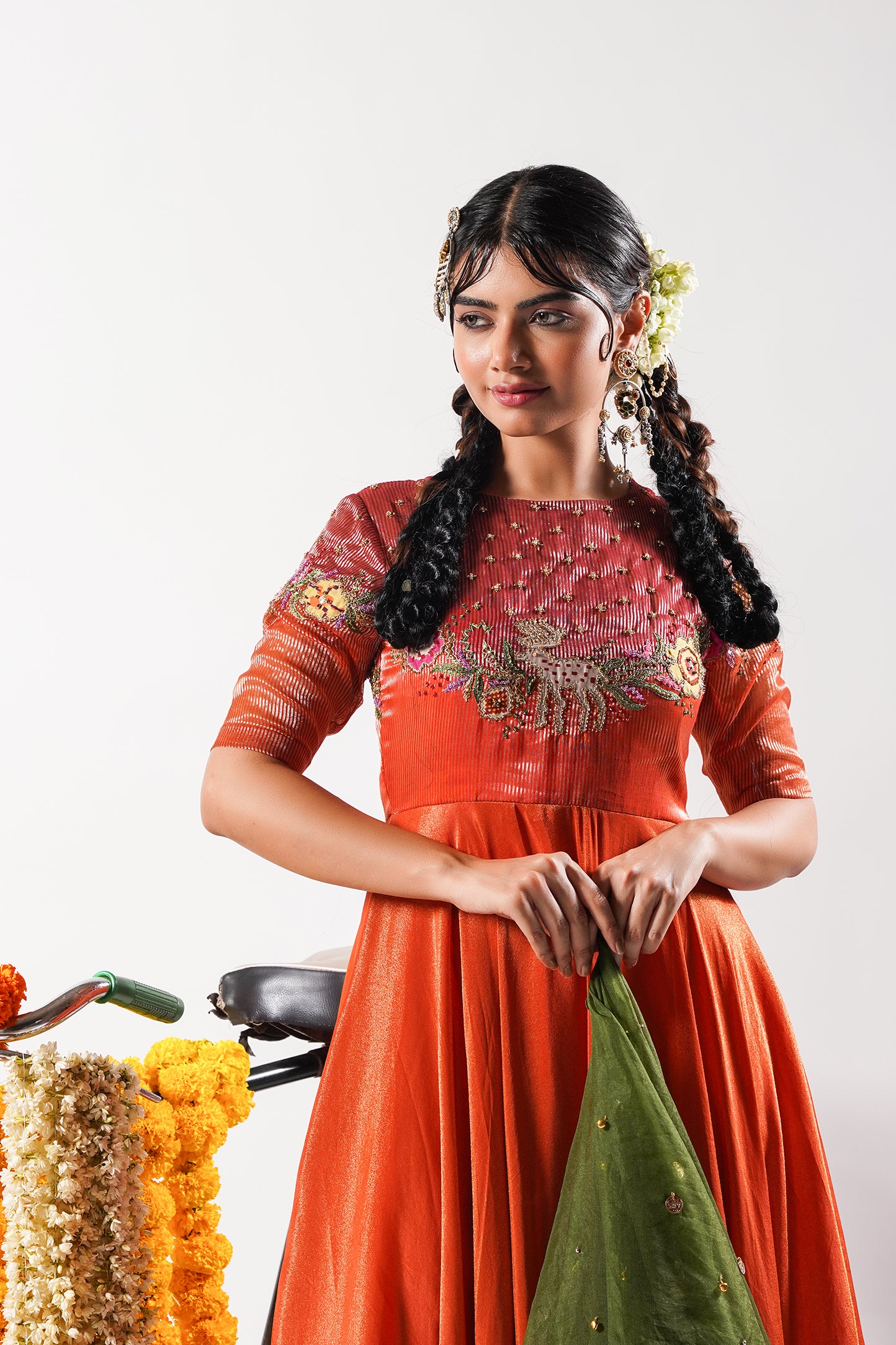 A radiant orange embroidered anarkali set paired with organza dupatta, bedecked with resplendent zari tissue, a true testament of opulence. This ensemble is a perfect choice for attending special events.