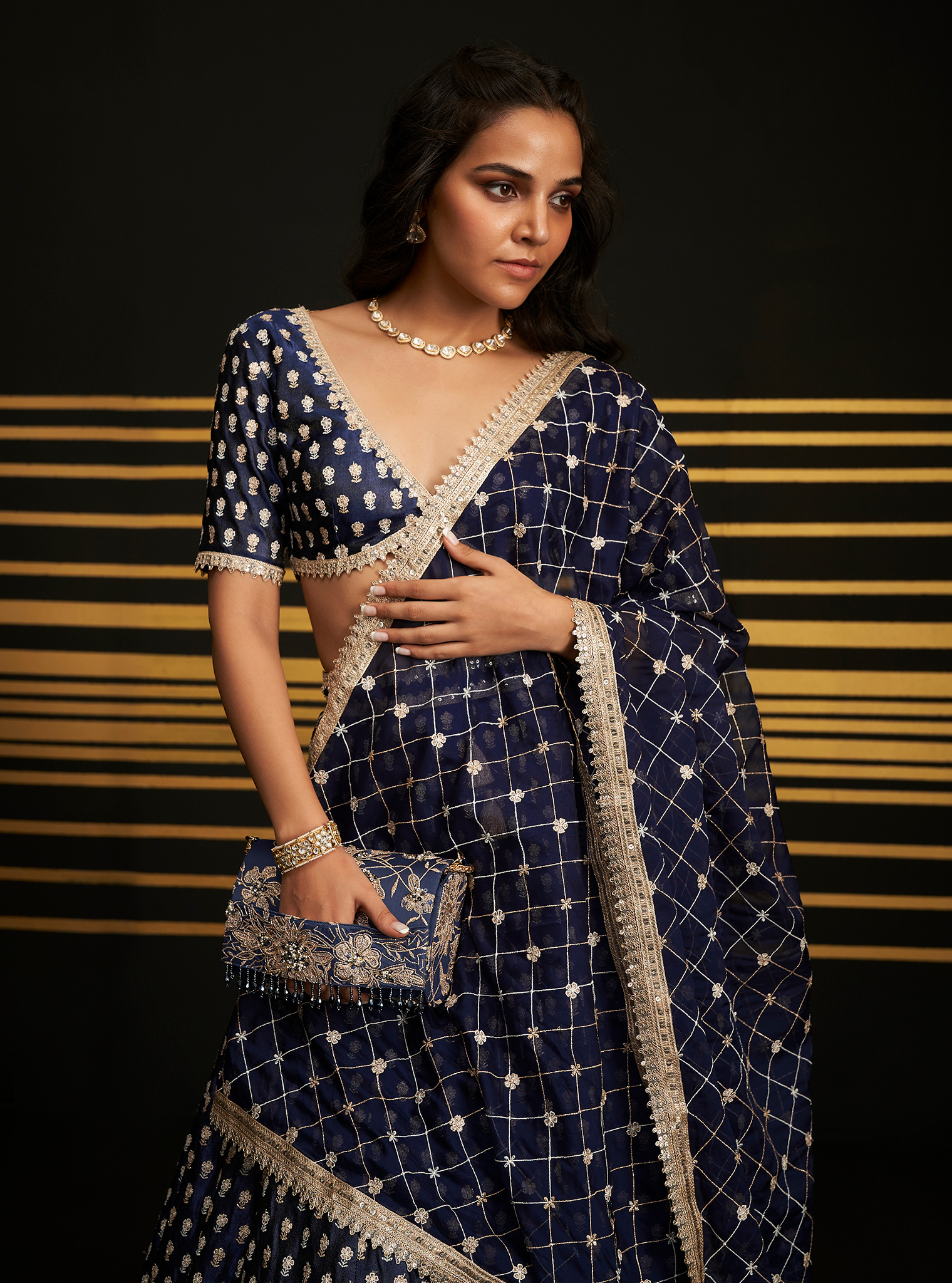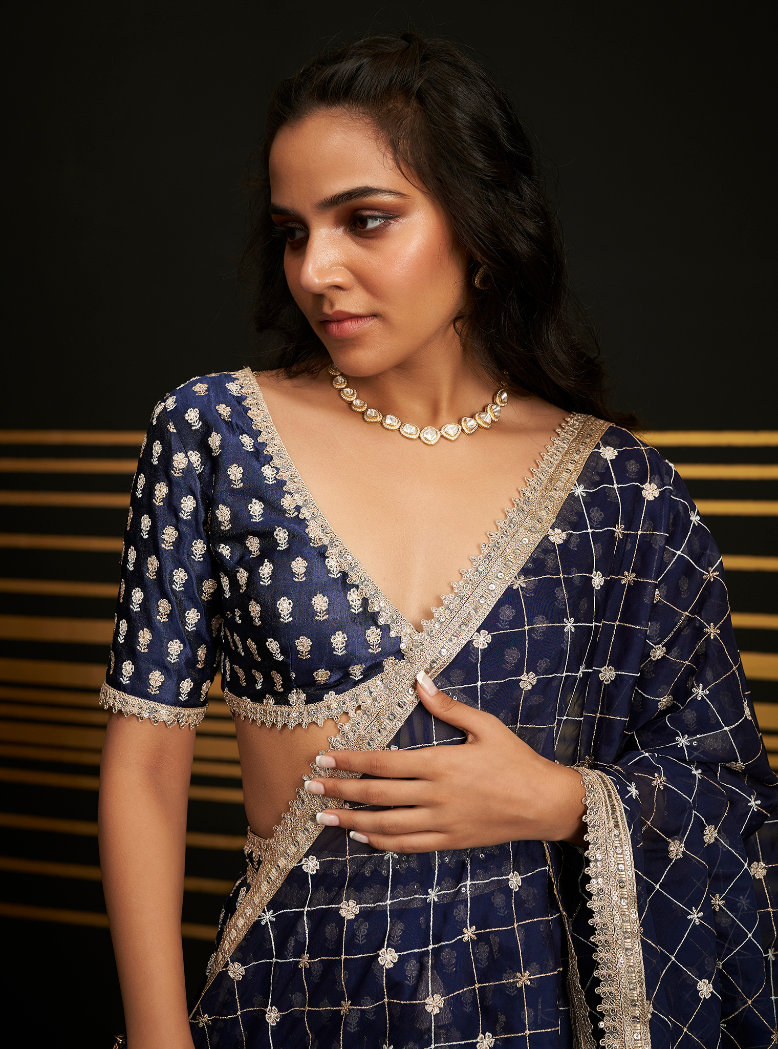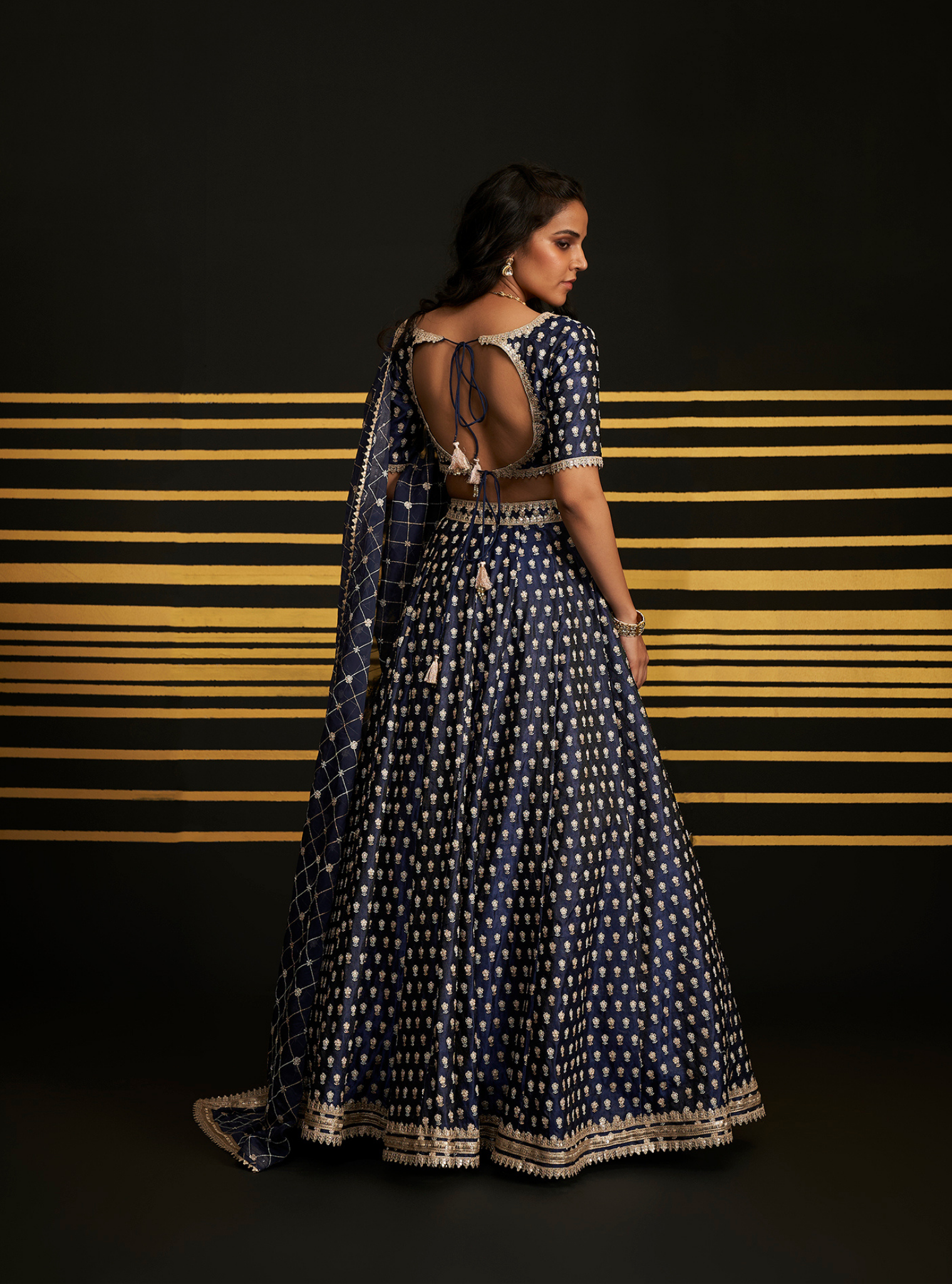 This regal navy lehenga is what you need to stun in any Shaadi festivities. Adorned in stunning zari embroidery and a gotta border, the lehenga exudes understated sophistication, perfect for an evening of celebrations. Completing the lehenga is an equally stunning dupatta with jaali embroidery and gotta border.