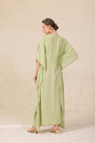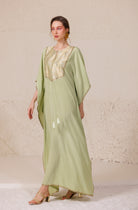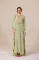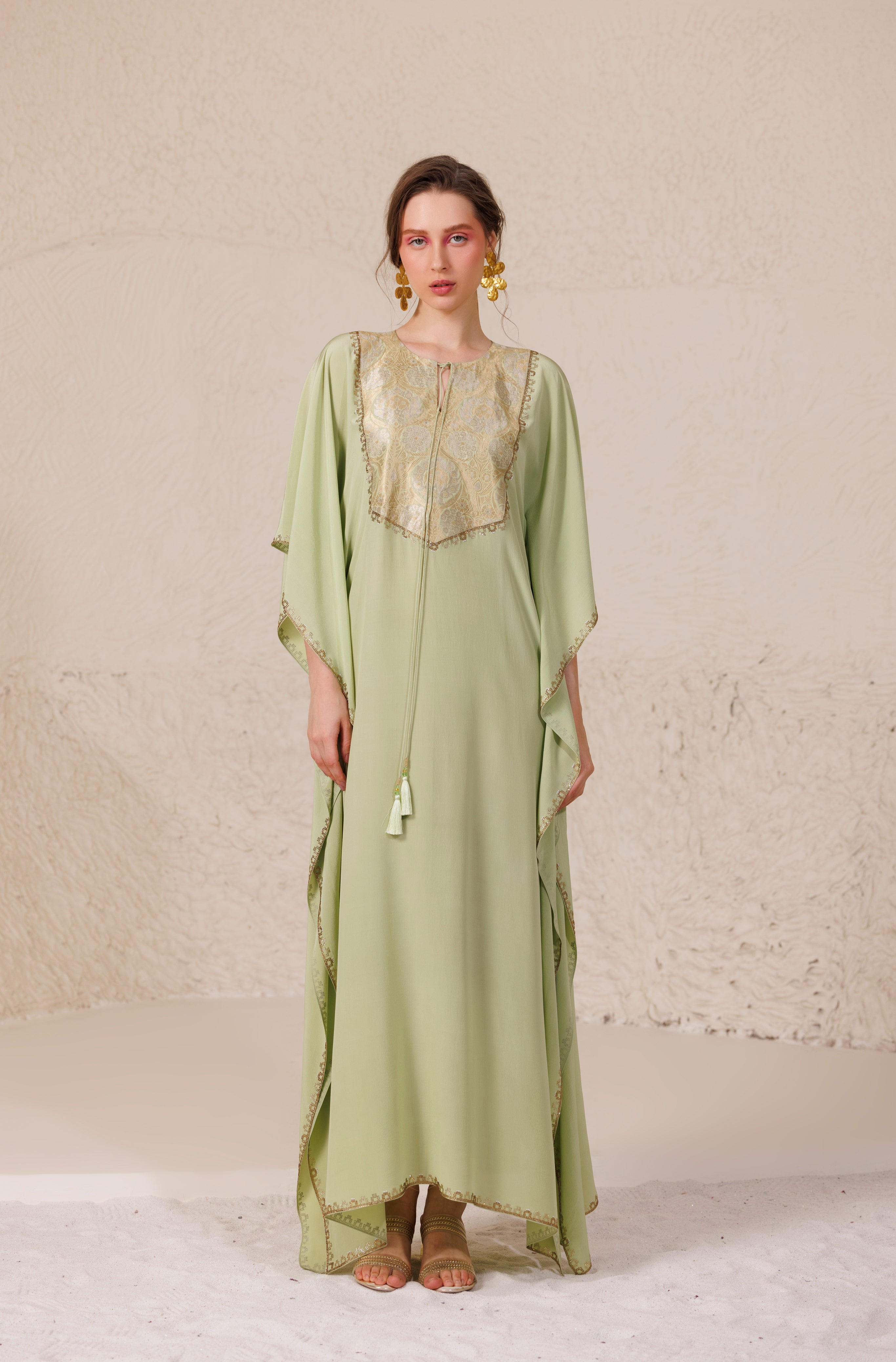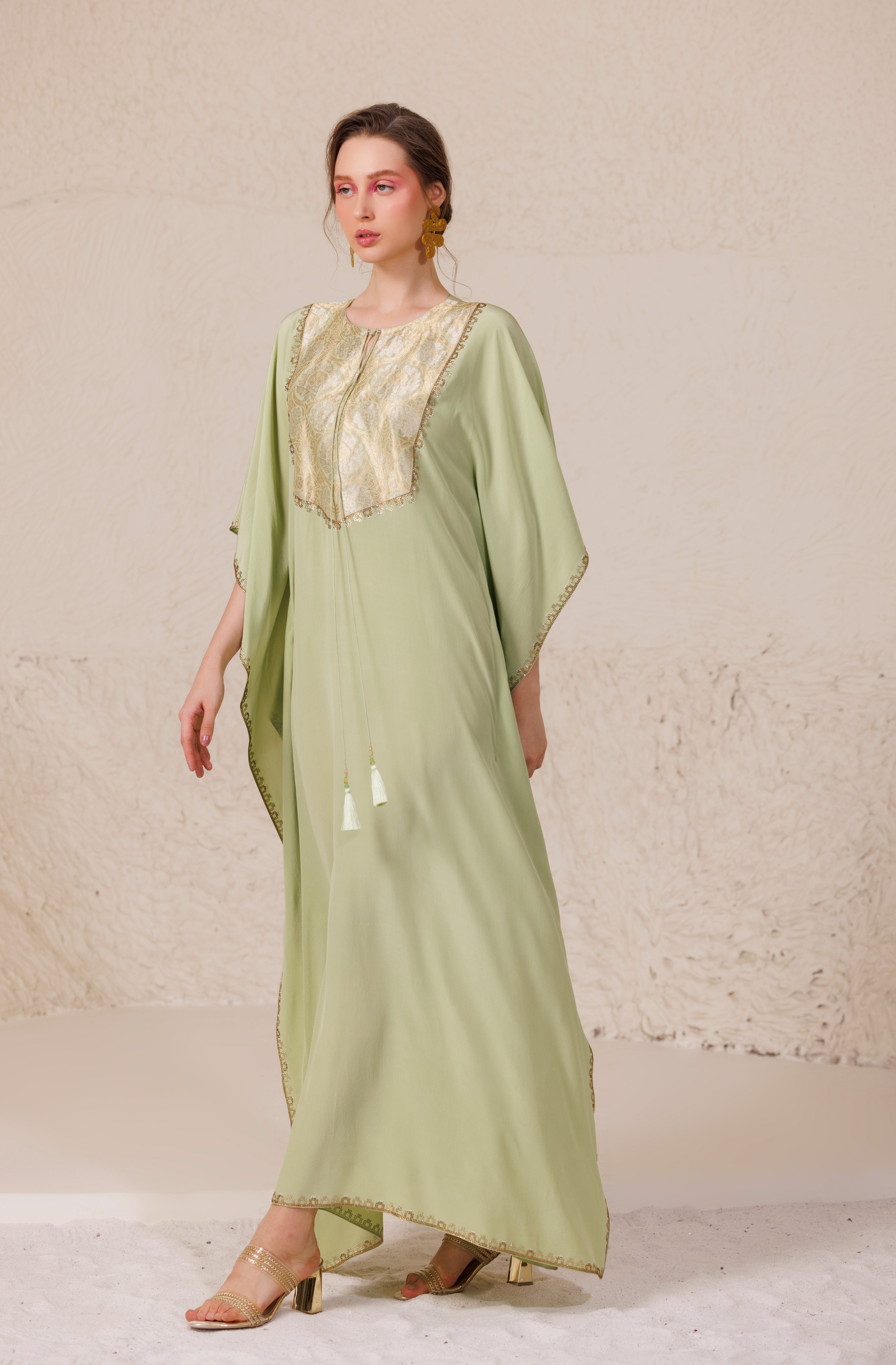 A pistachio crepe kaftan adorned with a brocade yoke and embellished with rhinestones along the edge and yoke of the kaftan, accentuated with a drawstring tassels. This fusion of elements creates a sense of luxury and opulence within the ensemble.