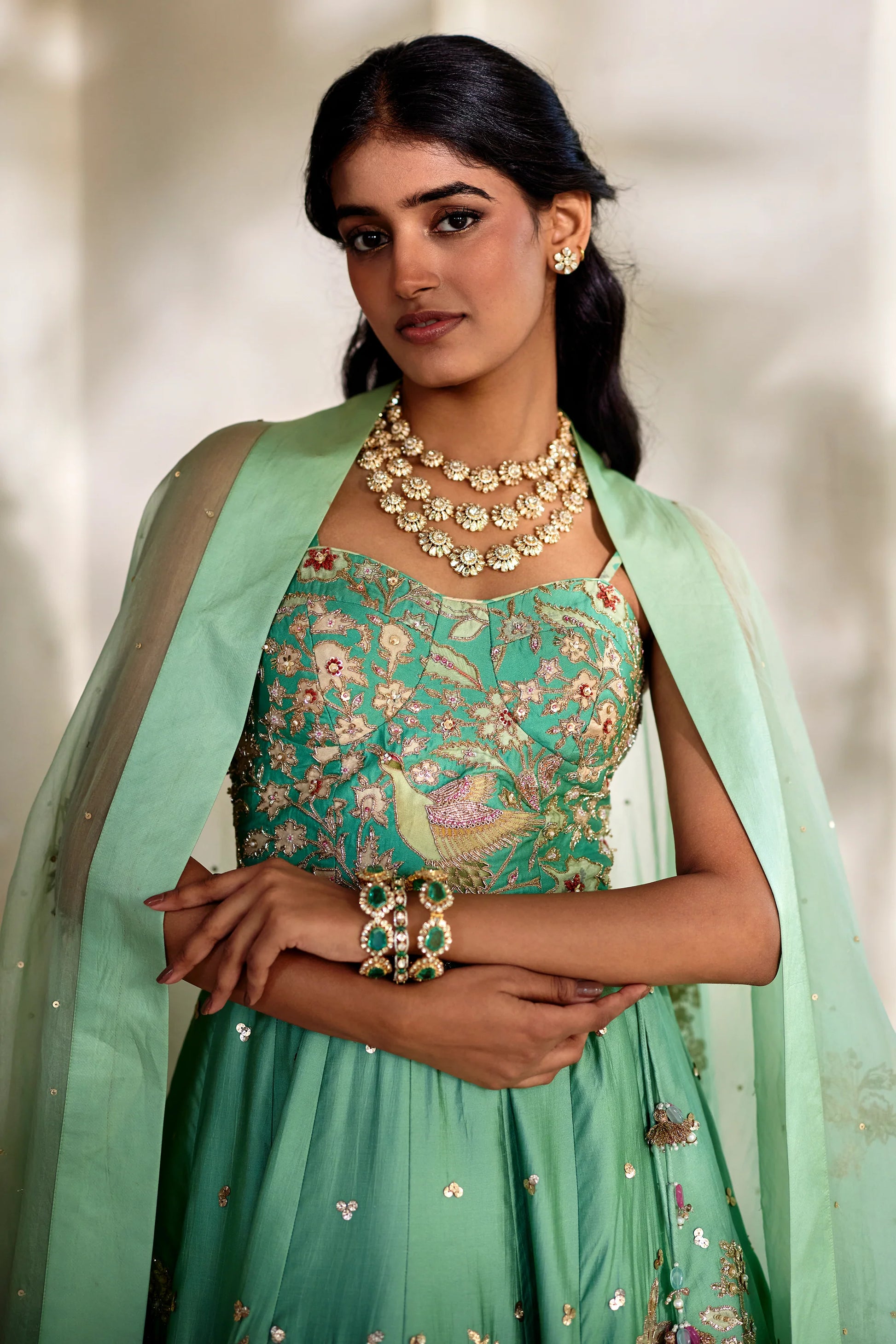 A silk lehenga featuring delicate floral prints enhanced with intricate aari, zardozi, and sequin hand-embroidery. Paired with a corset-fit blouse adorned with exquisite handwork, and a sheer organza triangular cape embellished with fine hand-embroidered accents.
