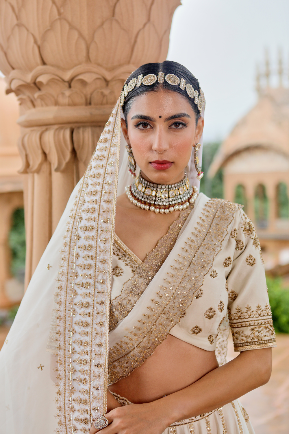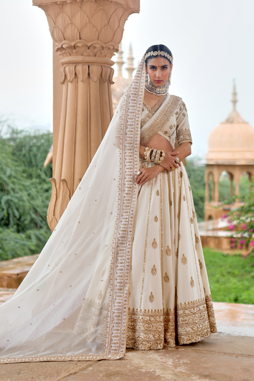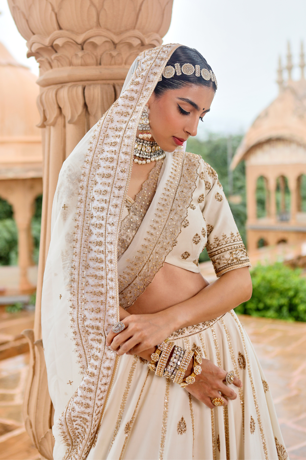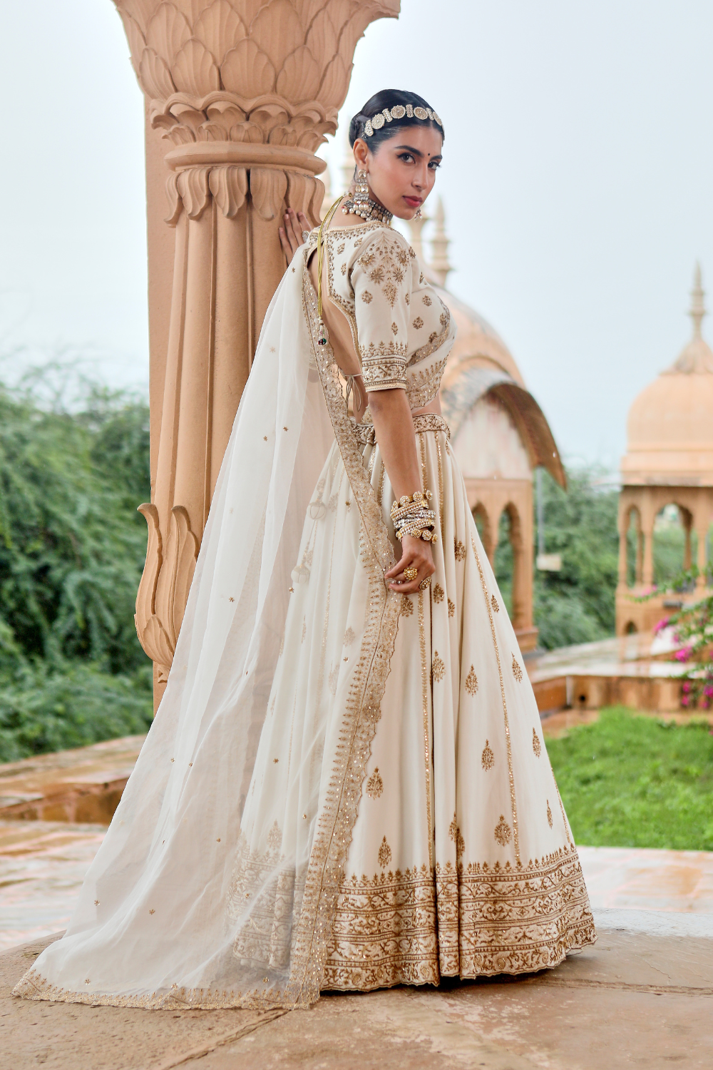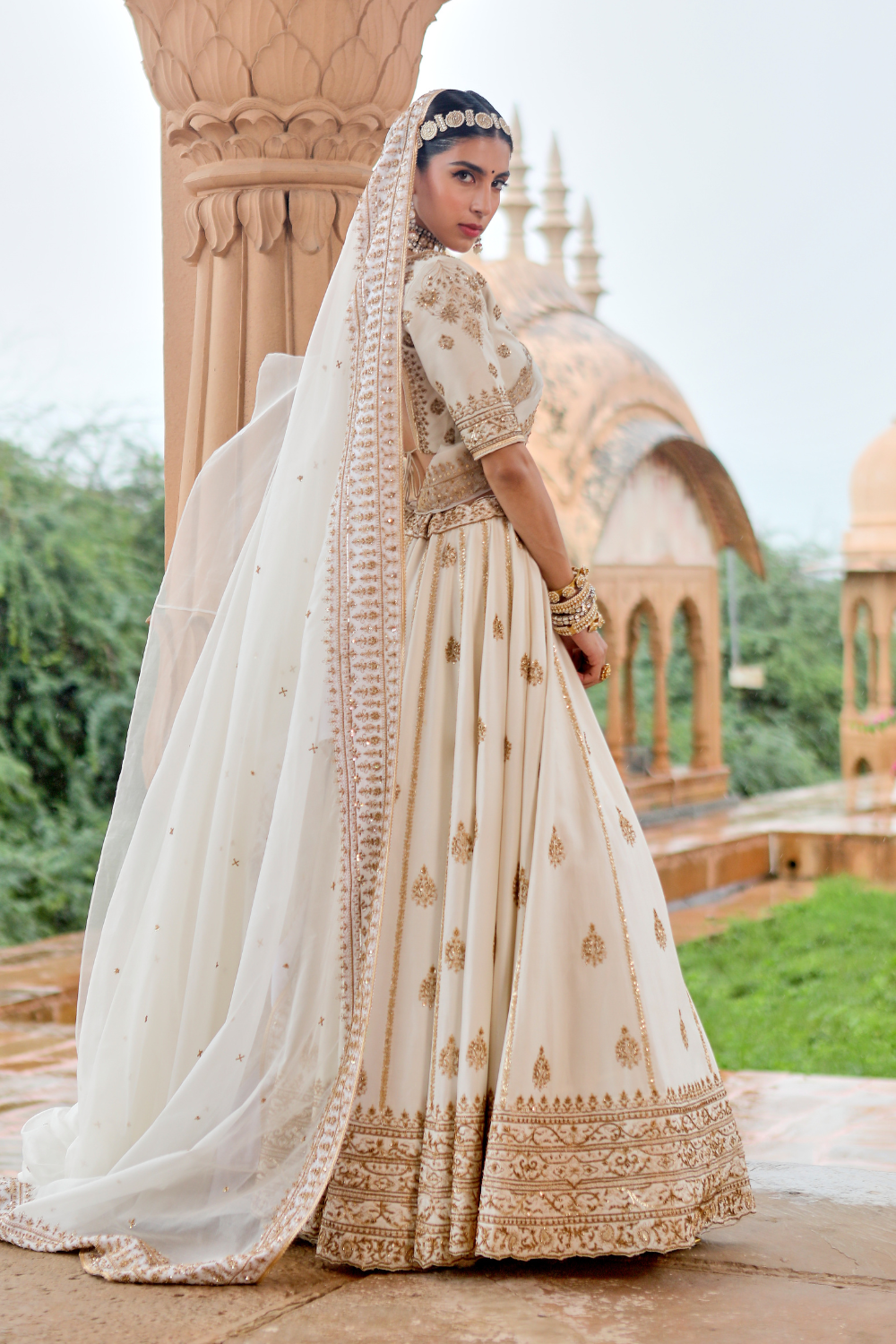Featuring a pearl white chanderi lehenga set paired with an organza base dupatta with gold dori & aari embroidery on it.
