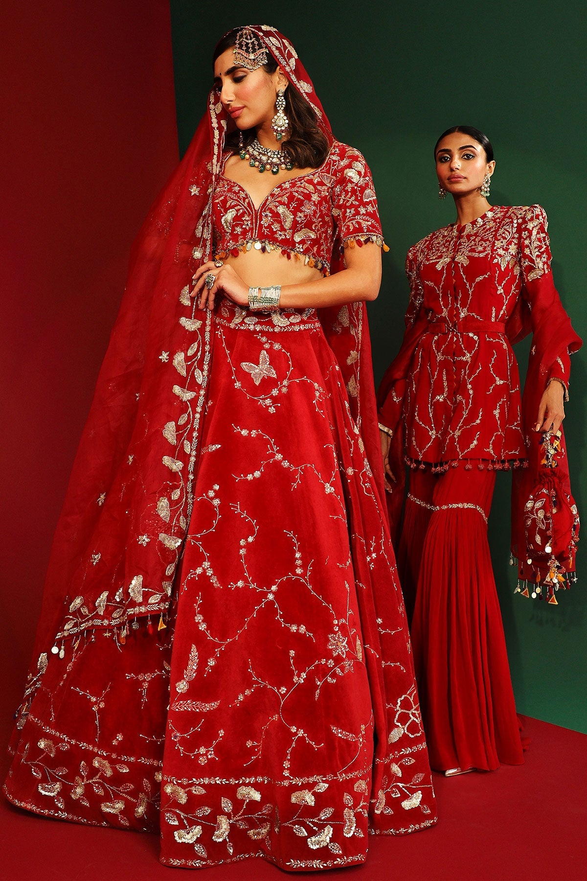 Sindoori red embroidered lehenga in velvet, embroidered blouse and embroidered dupatta with hand made tassels