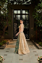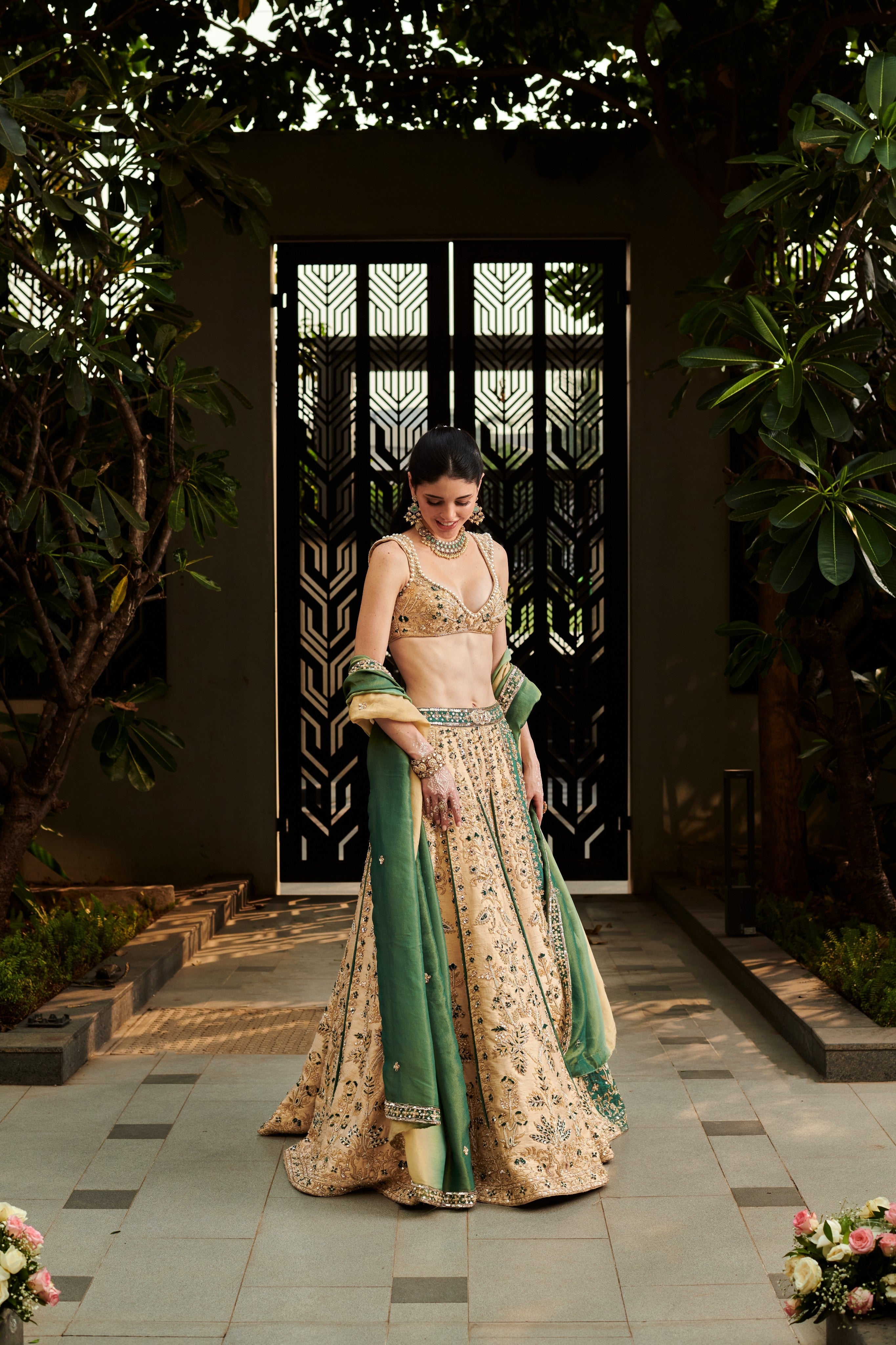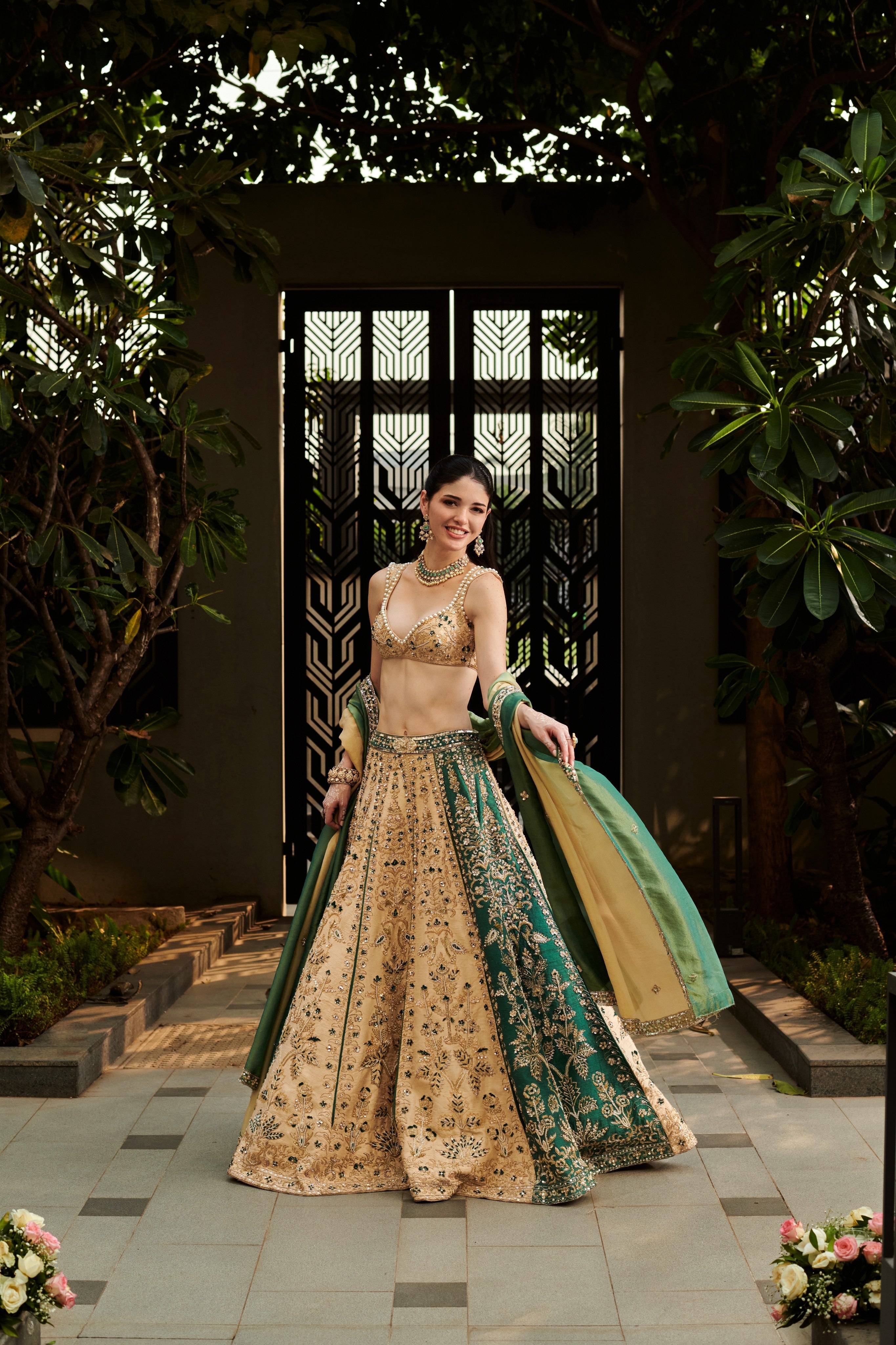 Elevate your bridal ensemble with this exquisite beige lehenga, designed to make a statement at any wedding event. Crafted with a unique silhouette, the lehenga features two lush green panels of Kali that beautifully contrast against the soft beige base, adding depth and drama to your look. The intricate golden hand embroidery delicately adorns the garment, showcasing impeccable craftsmanship that exudes elegance and sophistication.The ensemble is completed with a stunning green and beige ombré dupatta, flowing gracefully to add an ethereal touch to your appearance. The ombré effect creates a seamless blend between the hues, perfectly complementing the lehenga's rich detailing. Ideal for the modern bride or anyone attending a special occasion, this lehenga promises to turn heads and leave a lasting impression with its timeless beauty and artistry.