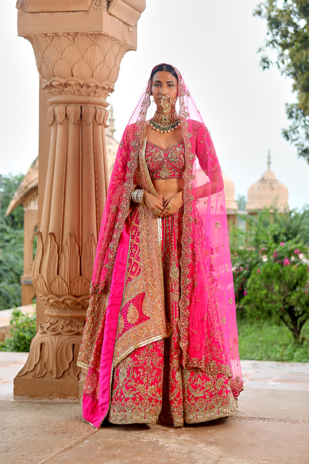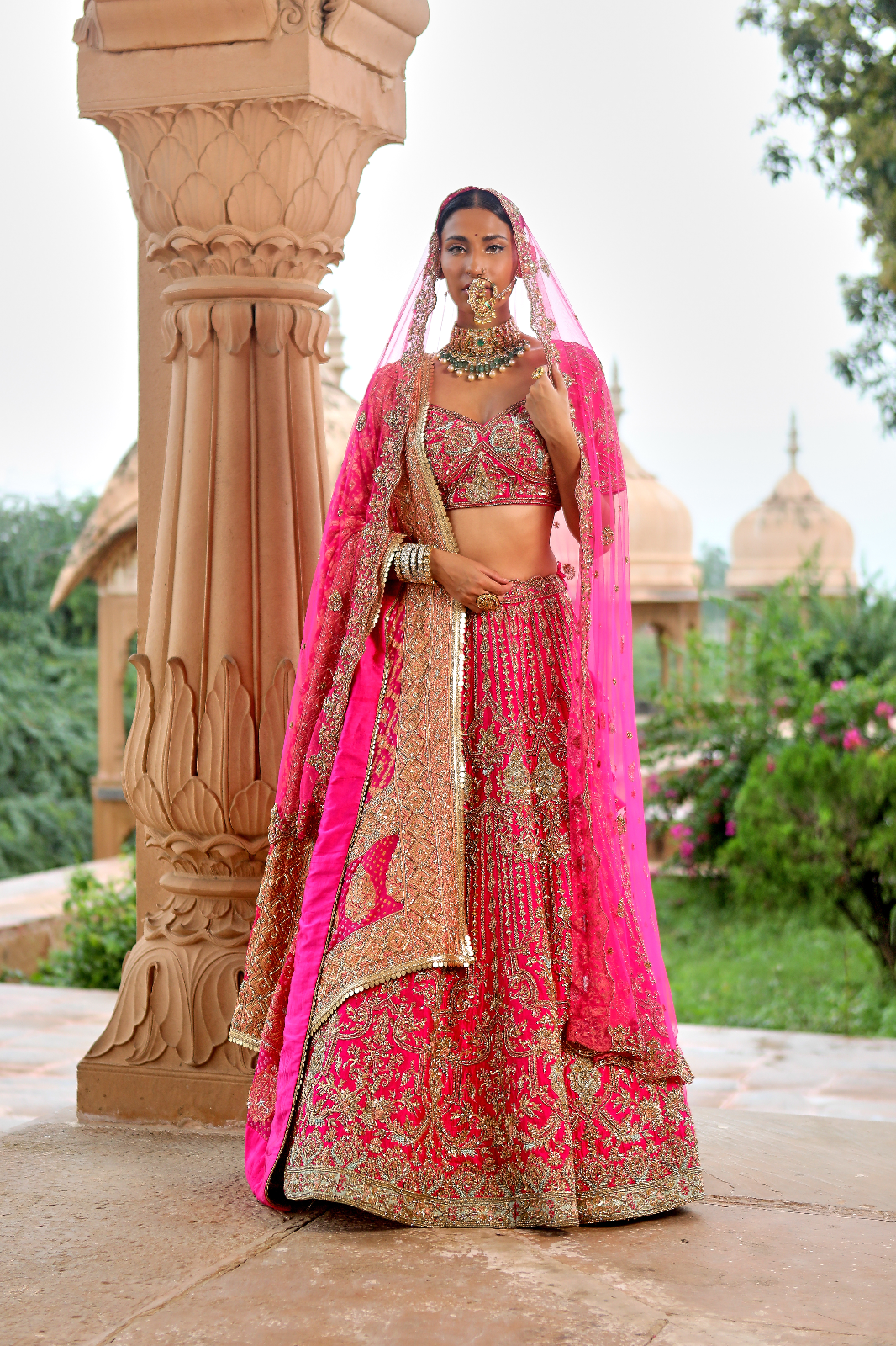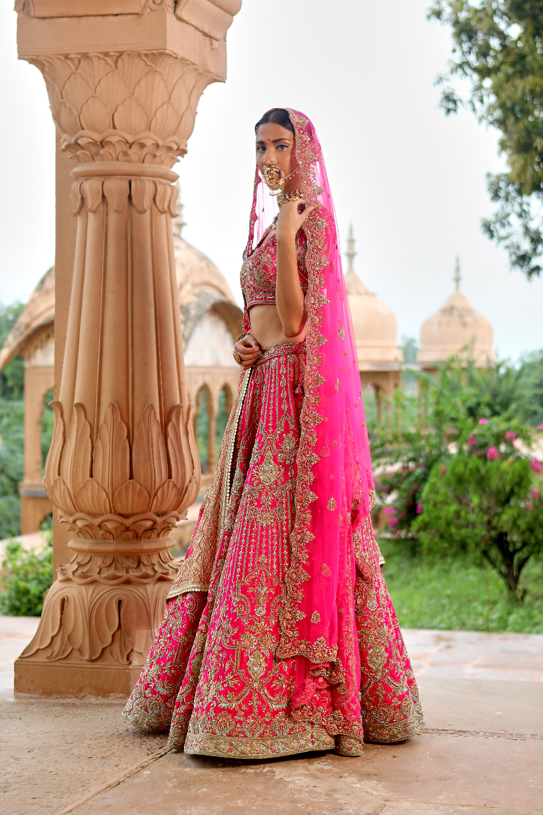 Featuring a cherry pink Raw Silk bridal lehenga set paired with a butterfly net and a banarsi dupatta with rosegold zardozi & aari embroidery