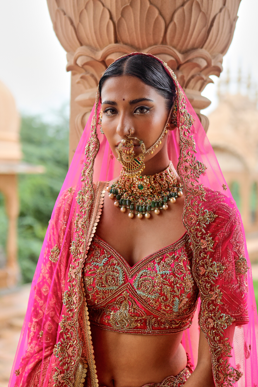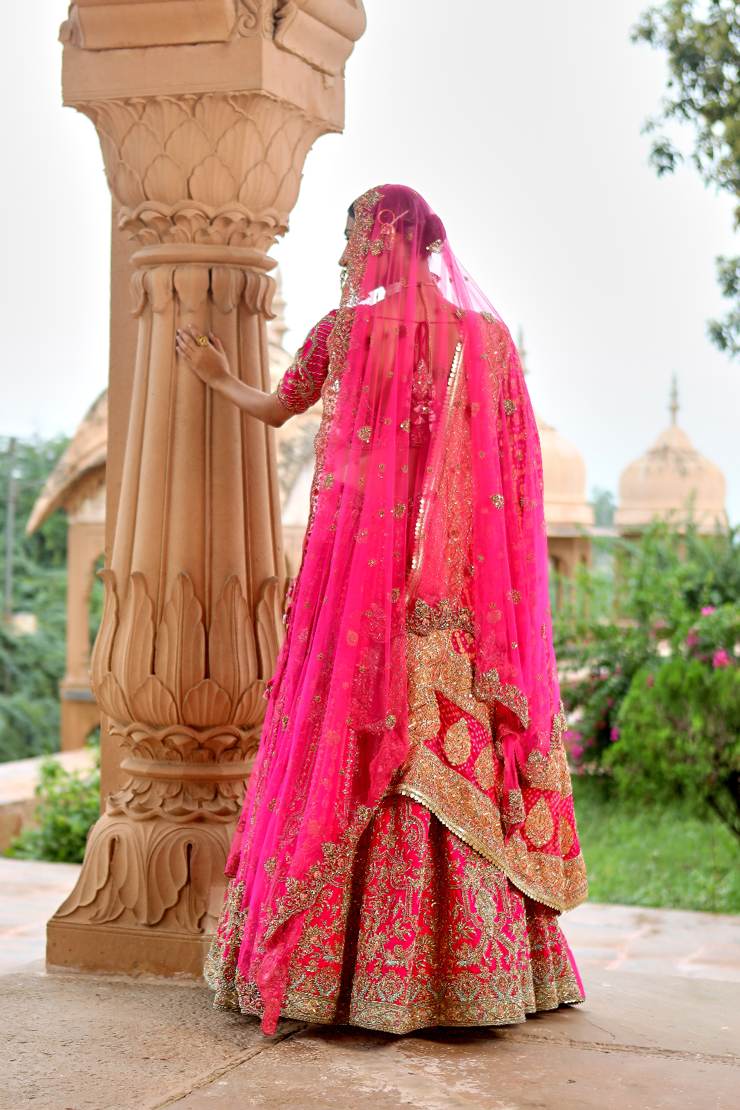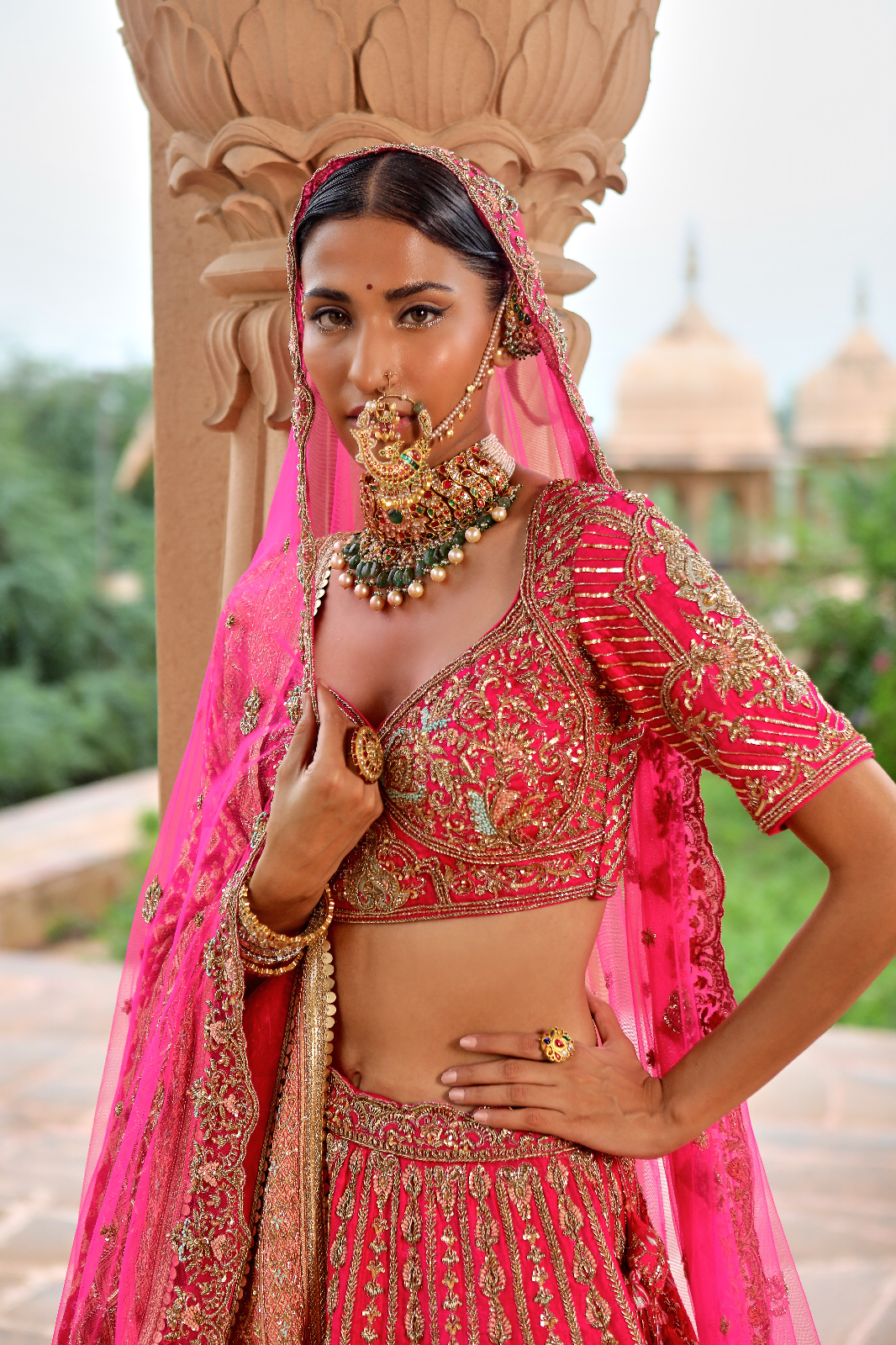Featuring a cherry pink Raw Silk bridal lehenga set paired with a butterfly net and a banarsi dupatta with rosegold zardozi & aari embroidery