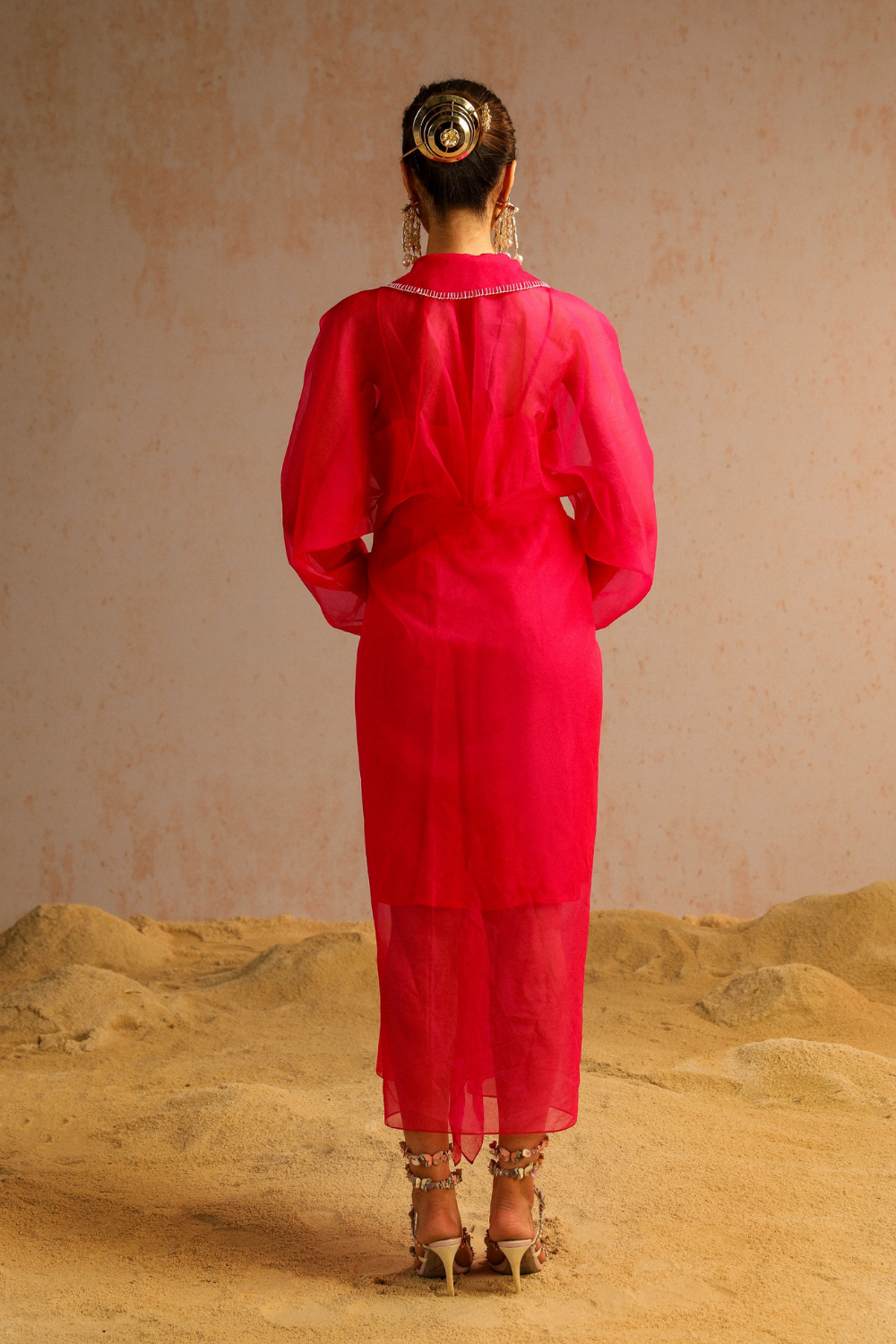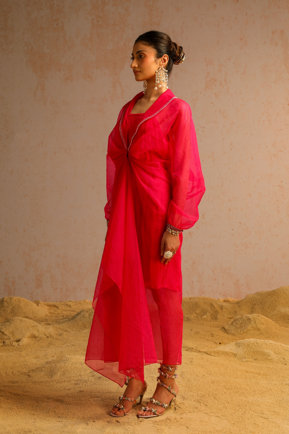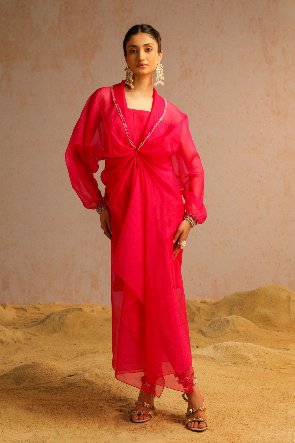This ensemble showcases a stunning hot pink crepe spaghetti dress paired elegantly with a full-sleeve cape. The outfit's elegance is heightened by a pleat cluster positioned at the center of the empire line in the front of the cape, enhancing the overall visual appeal. Adding to its charm, the collar of the cape is adorned with pearls and delicate blanket stitches, accentuating its sophistication. The combination of the dress and cape creates a graceful silhouette that exudes style and refinement, making it a perfect choice for formal occasions or evening events.