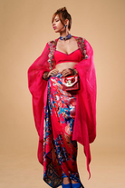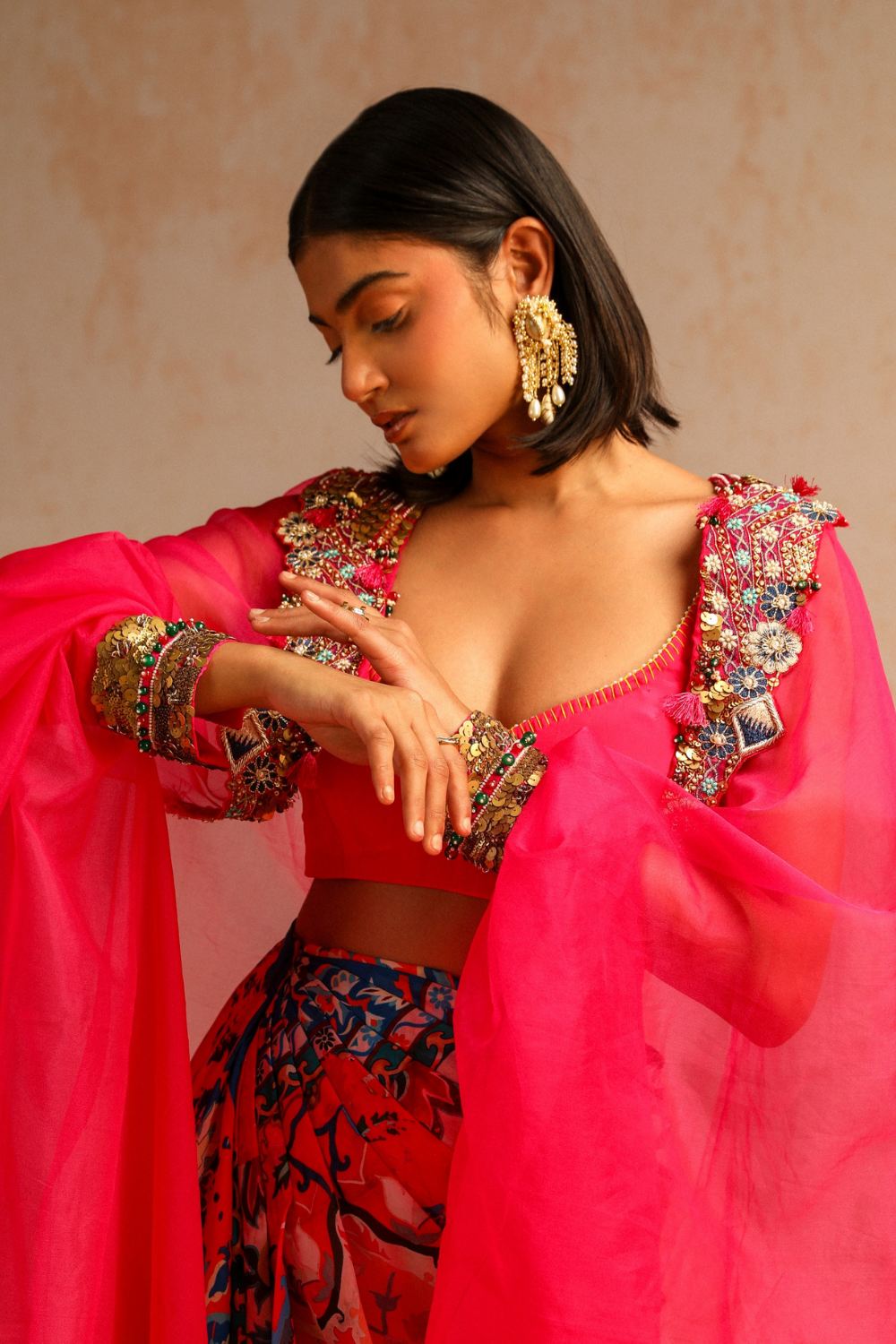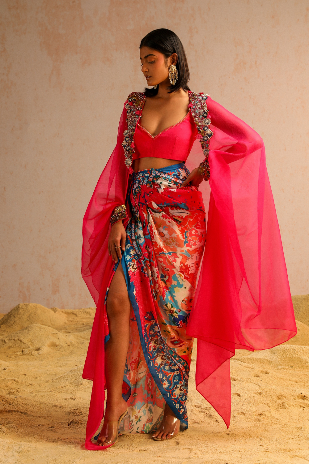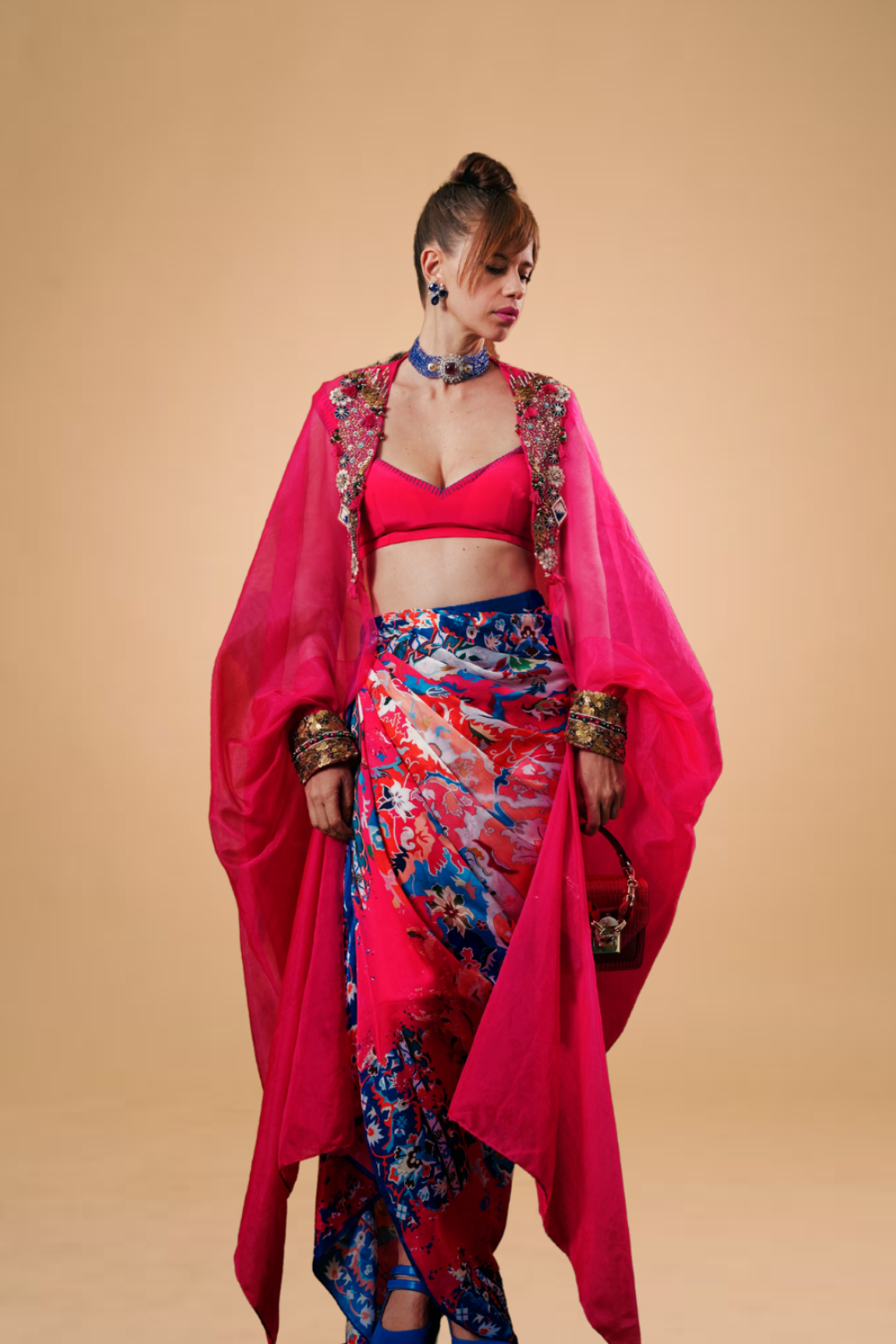 This vibrant hot pink satin Georgette draped skirt showcases our unique draping technique, elegantly enveloping the body with fluid lines and delicate folds. Adorned with intricate motif print inspired by Jan Kath's erased carpets, it brings an artistic flair to the ensemble. Paired with a matching plain crepe blouse and an organza cape which is heavily embroidered on the collar and cuffs with exaggerated balloon sleeves, the outfit exudes elegance and sophistication. Vibrant hues reminiscent of macaw plumage infuse the ensemble with an exotic allure. The meticulous combination of machine work and zardozi, embellished with sequins, pearls, gota patti, and kundan, enhances the outfit's movement and adds to its artistic charm.