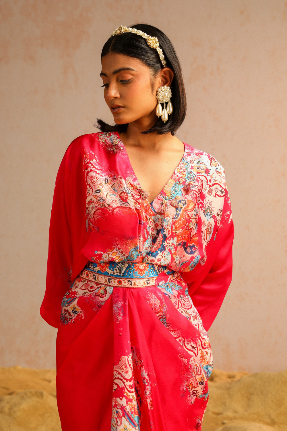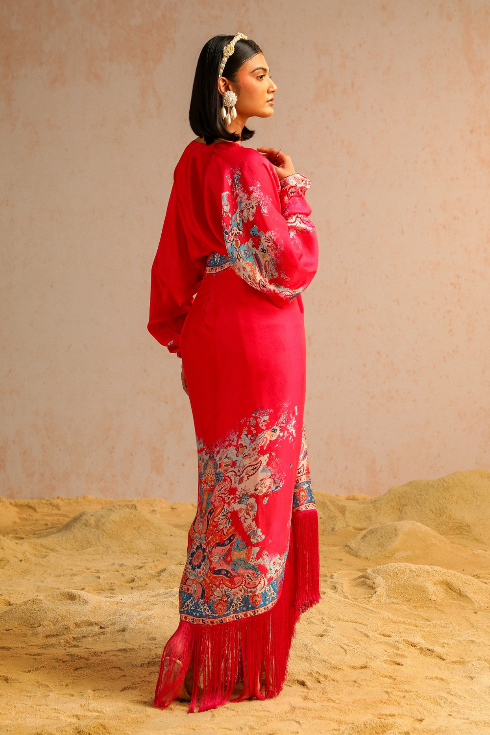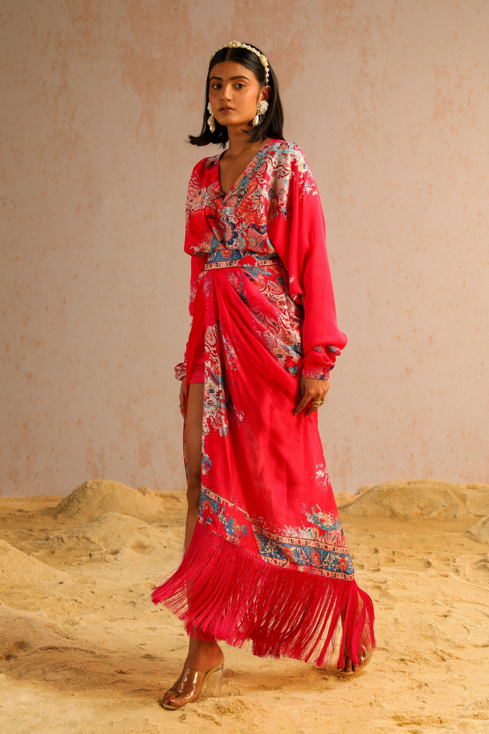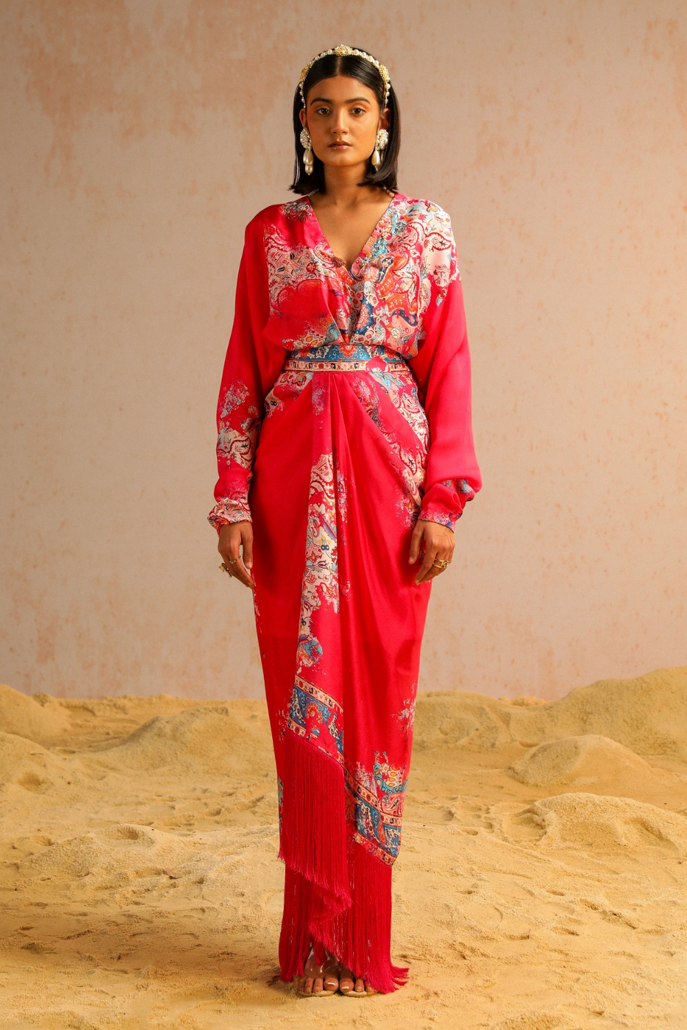 This ensemble features a relaxed-fit hot pink satin Georgette draped skirt showcasing our unique draping technique that elegantly envelops the body with fluid lines and delicate folds adorned with intricate motif print inspired by Jan Kath's carpets, paired with a loose full-sleeve shirt. The delicate sheerness of the fabric adds elegance, while vibrant hues reminiscent of macaw plumage create an exotic allure. The outfit is elevated by delicate aari and zardozi work on the shirt's neckline with pearls, along with tassels and fringe borders on the skirt hem, adding movement and an artistic touch.