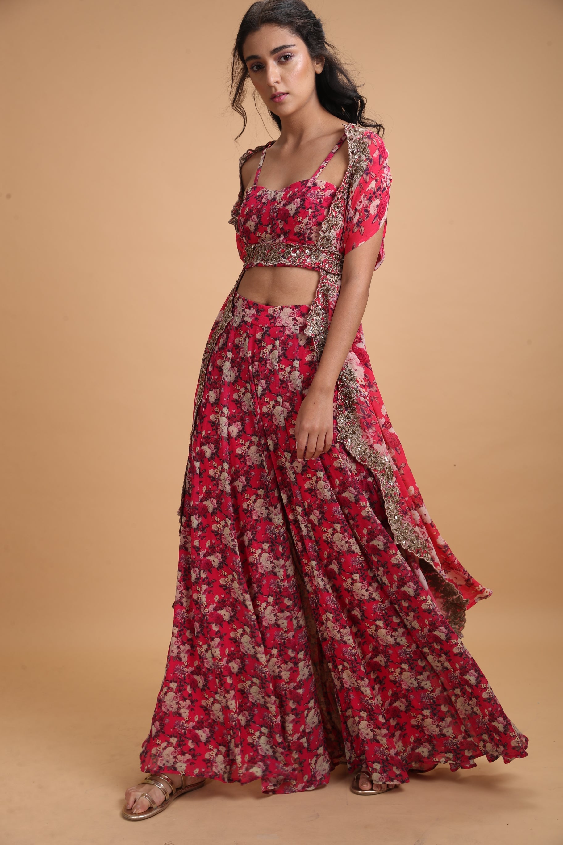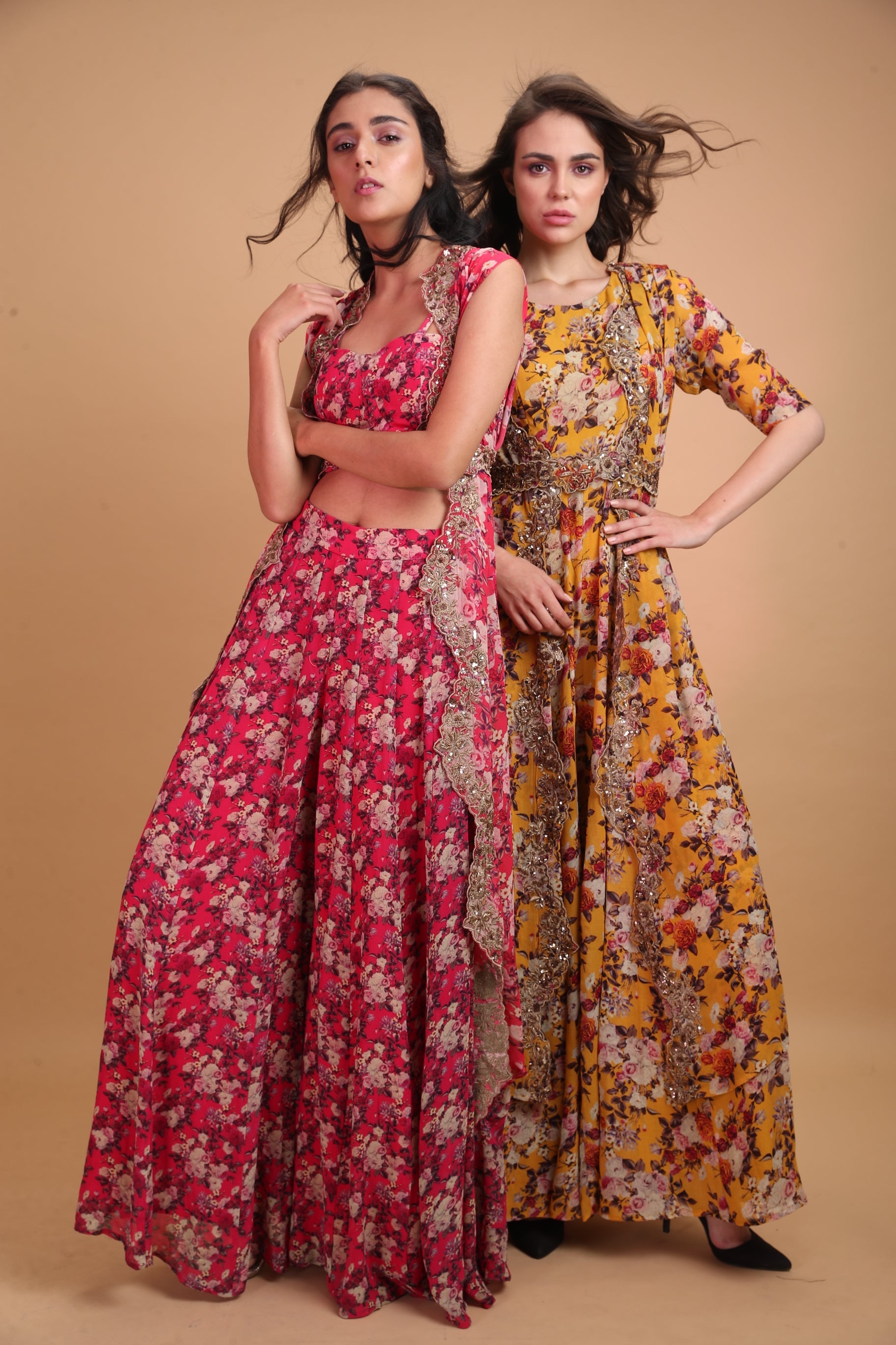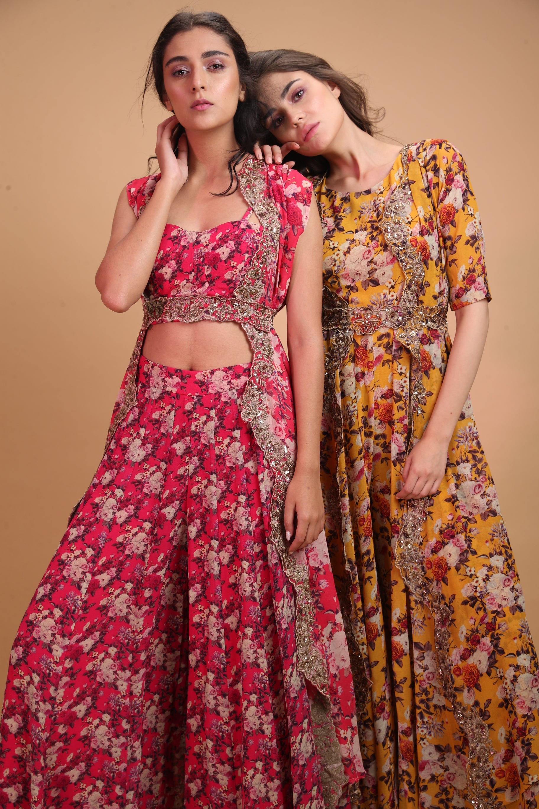 Featuring a HOT PINK FLORAL CROP TOP WITH SHARARA PANTS Set in GEORJETTE.