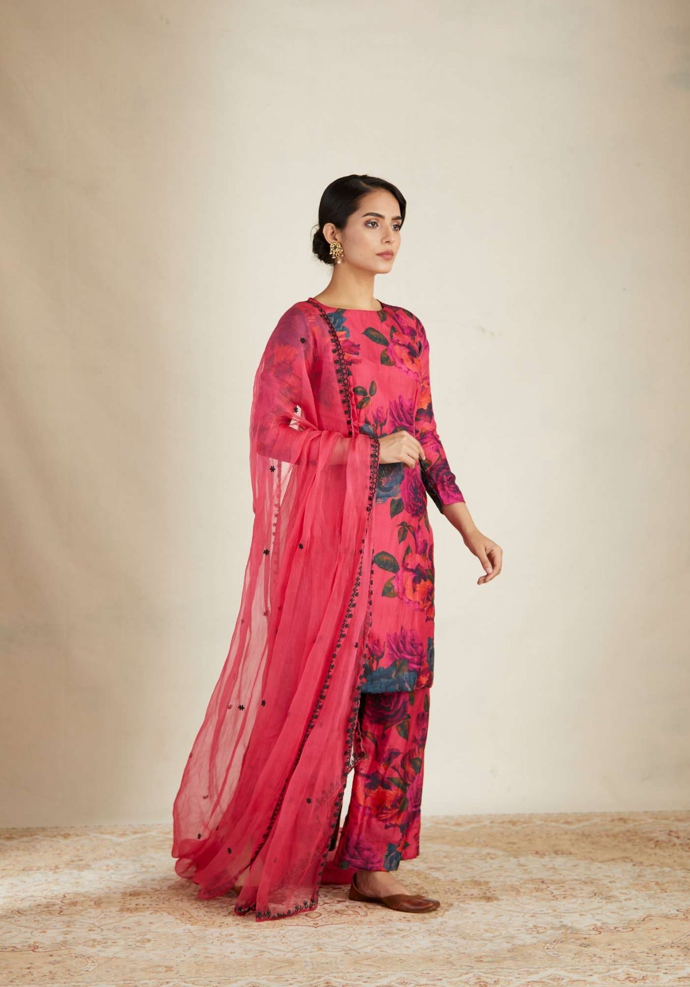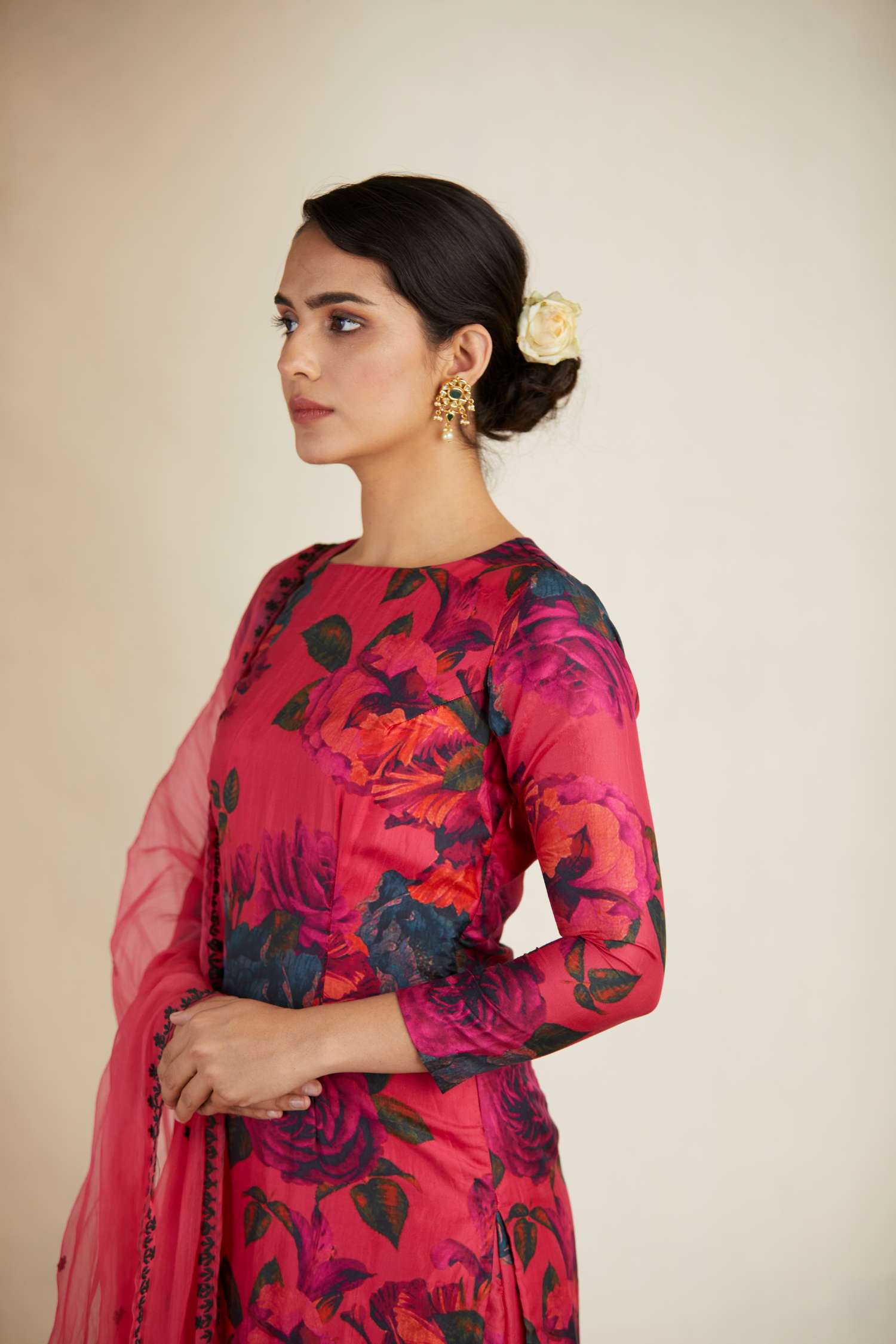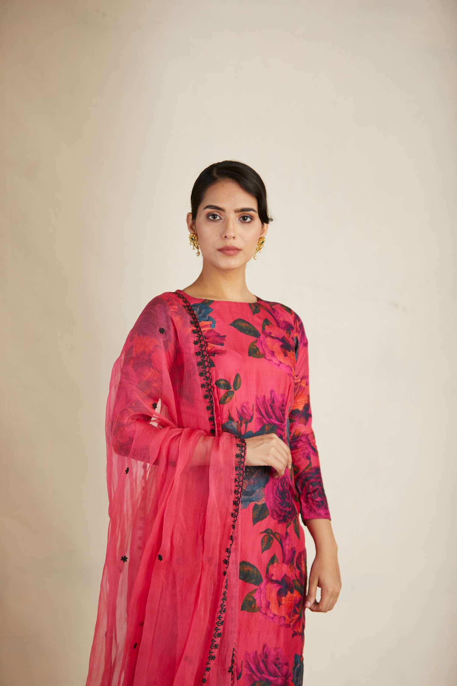 Featuring a Hot Pink Floral Kurti Set in Silk.