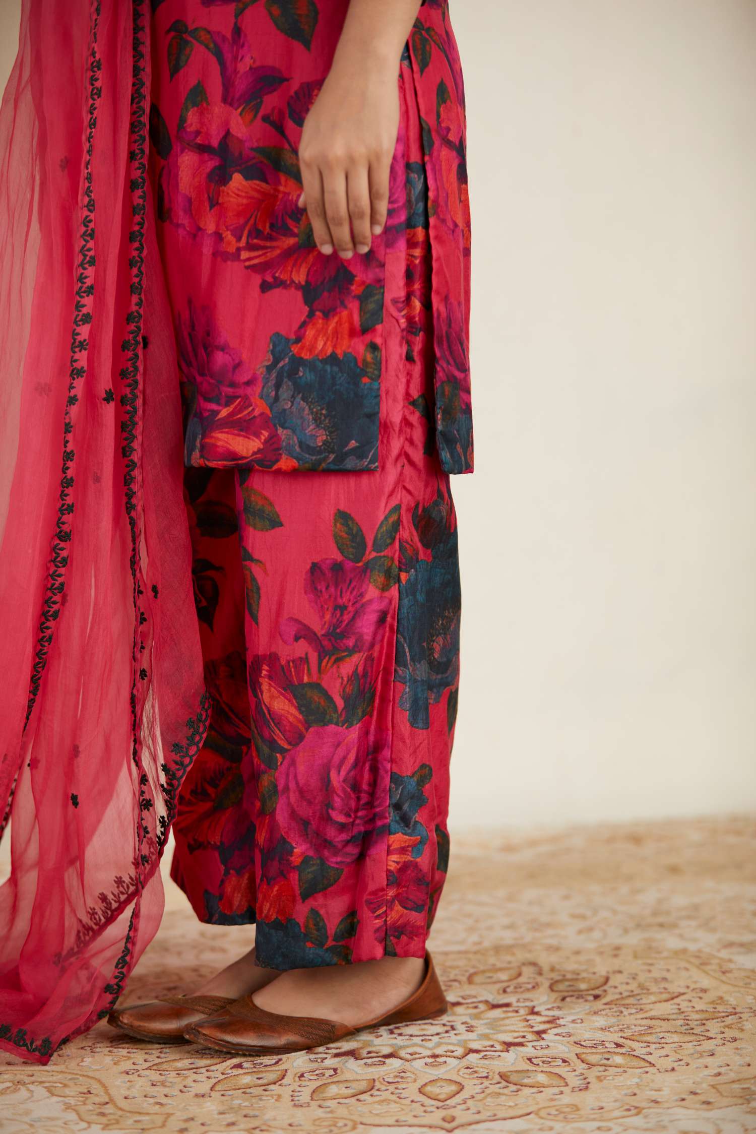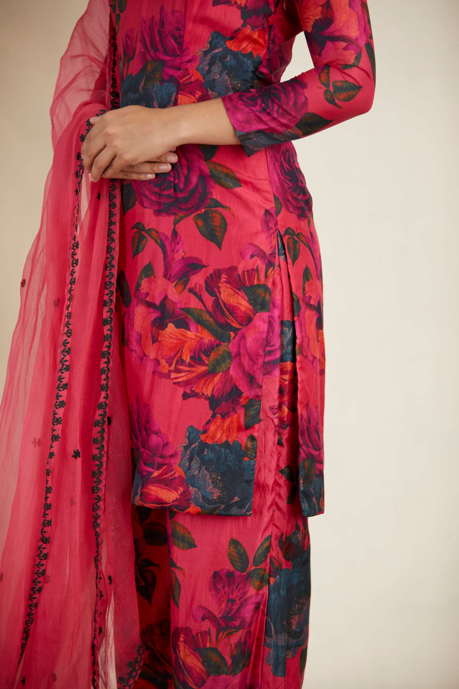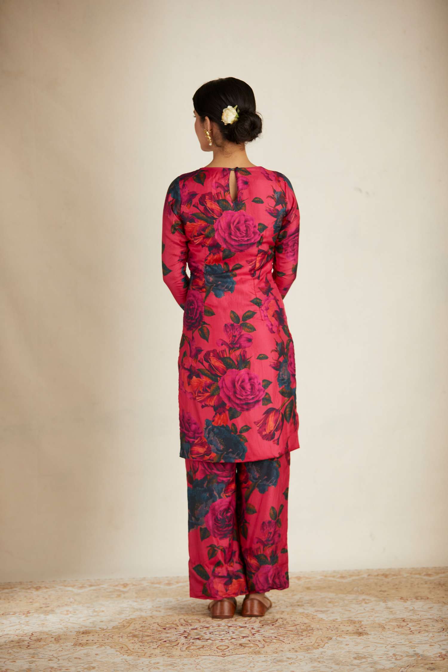 Featuring a Hot Pink Floral Kurti Set in Silk.
