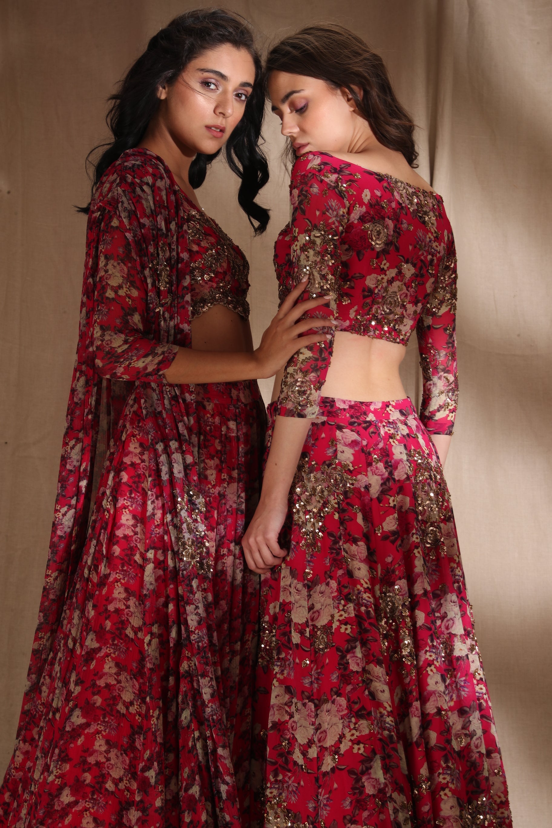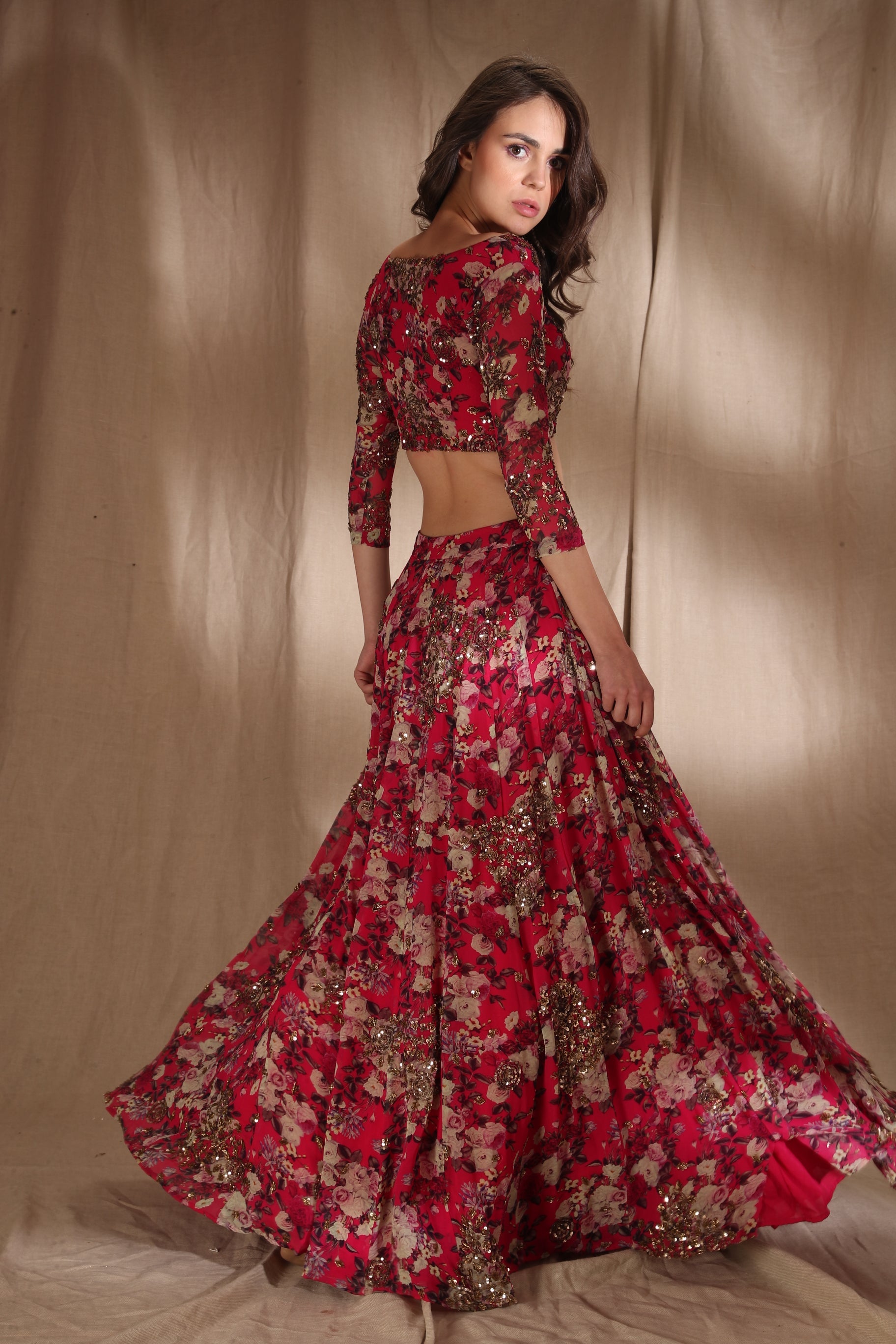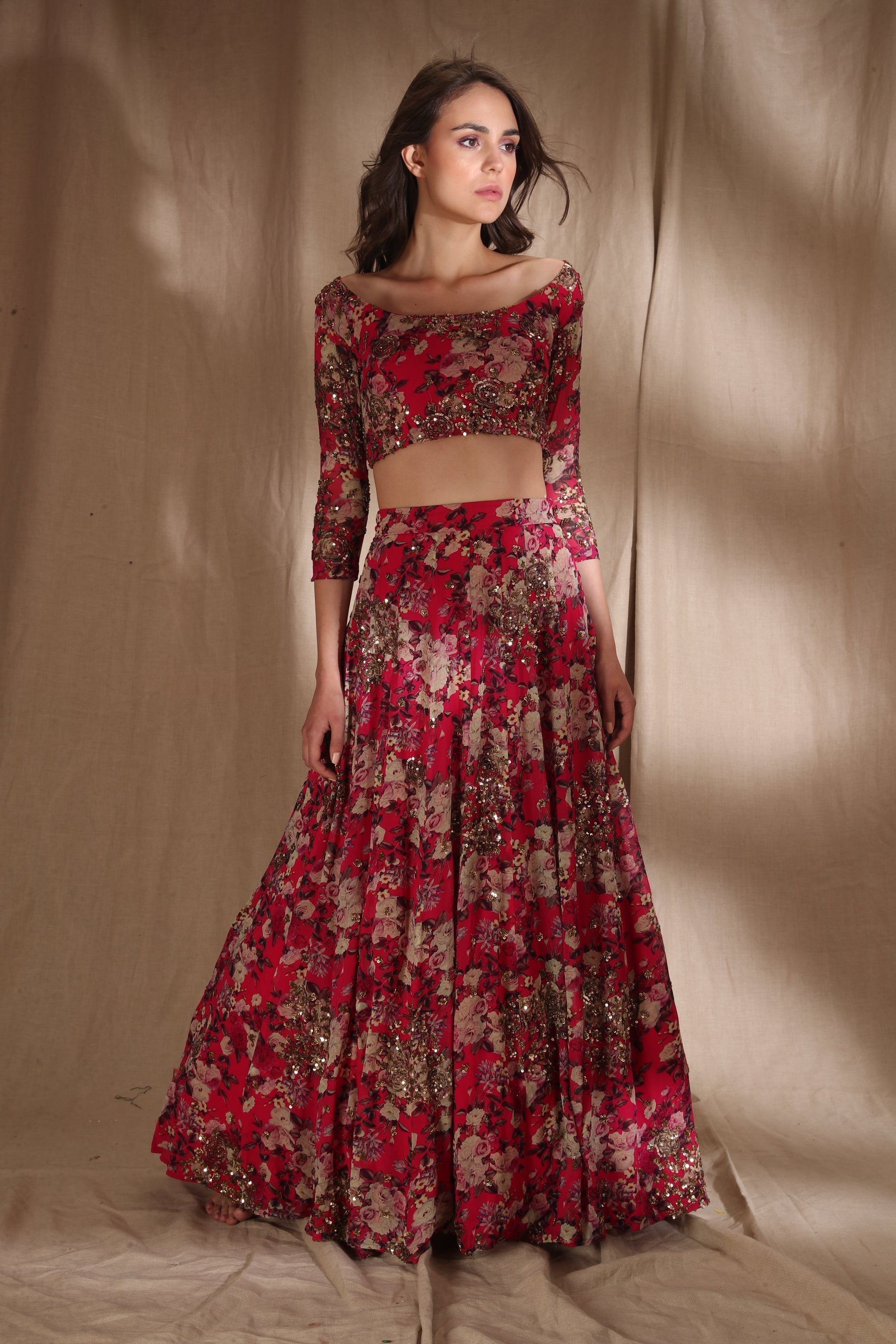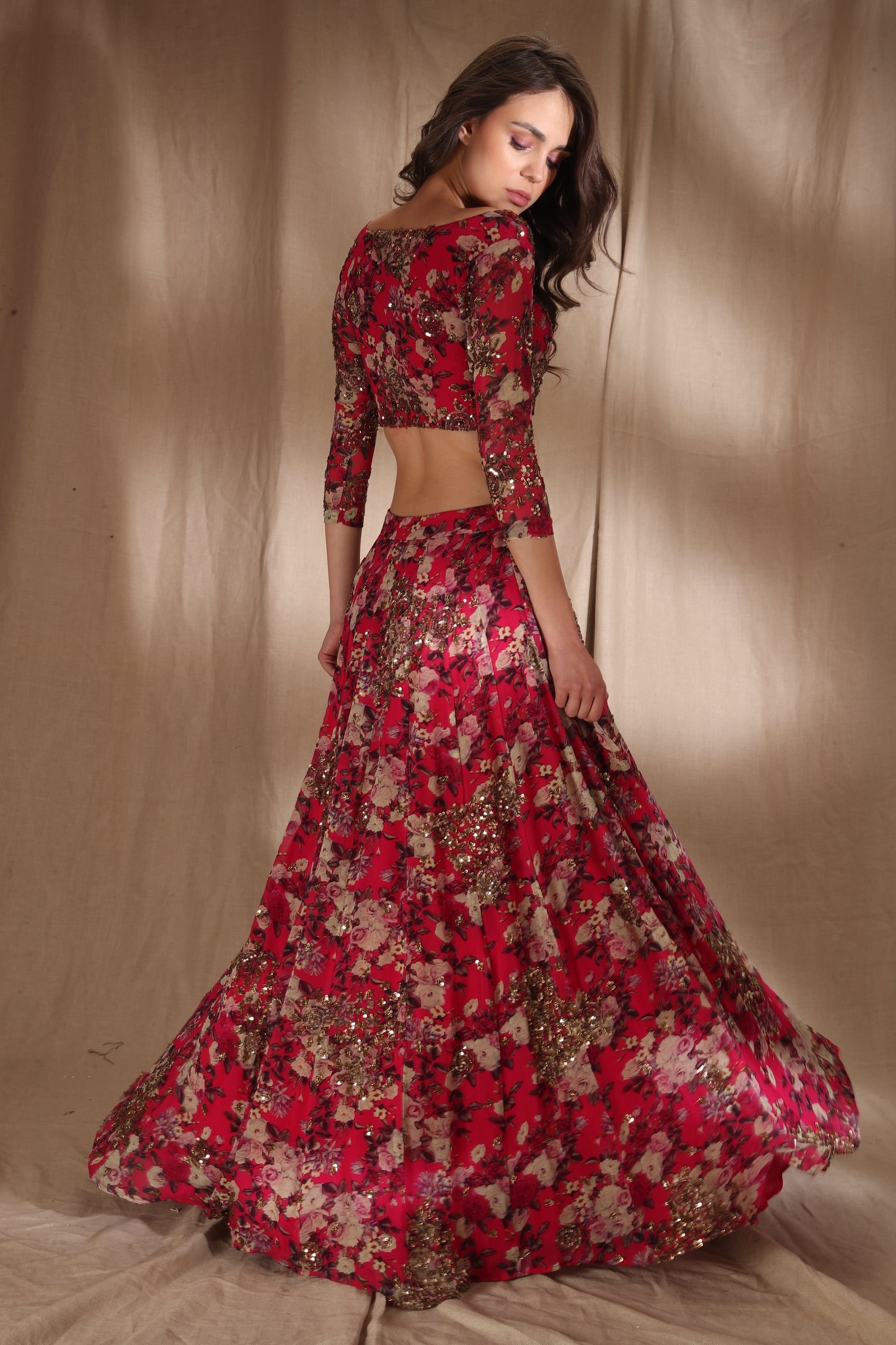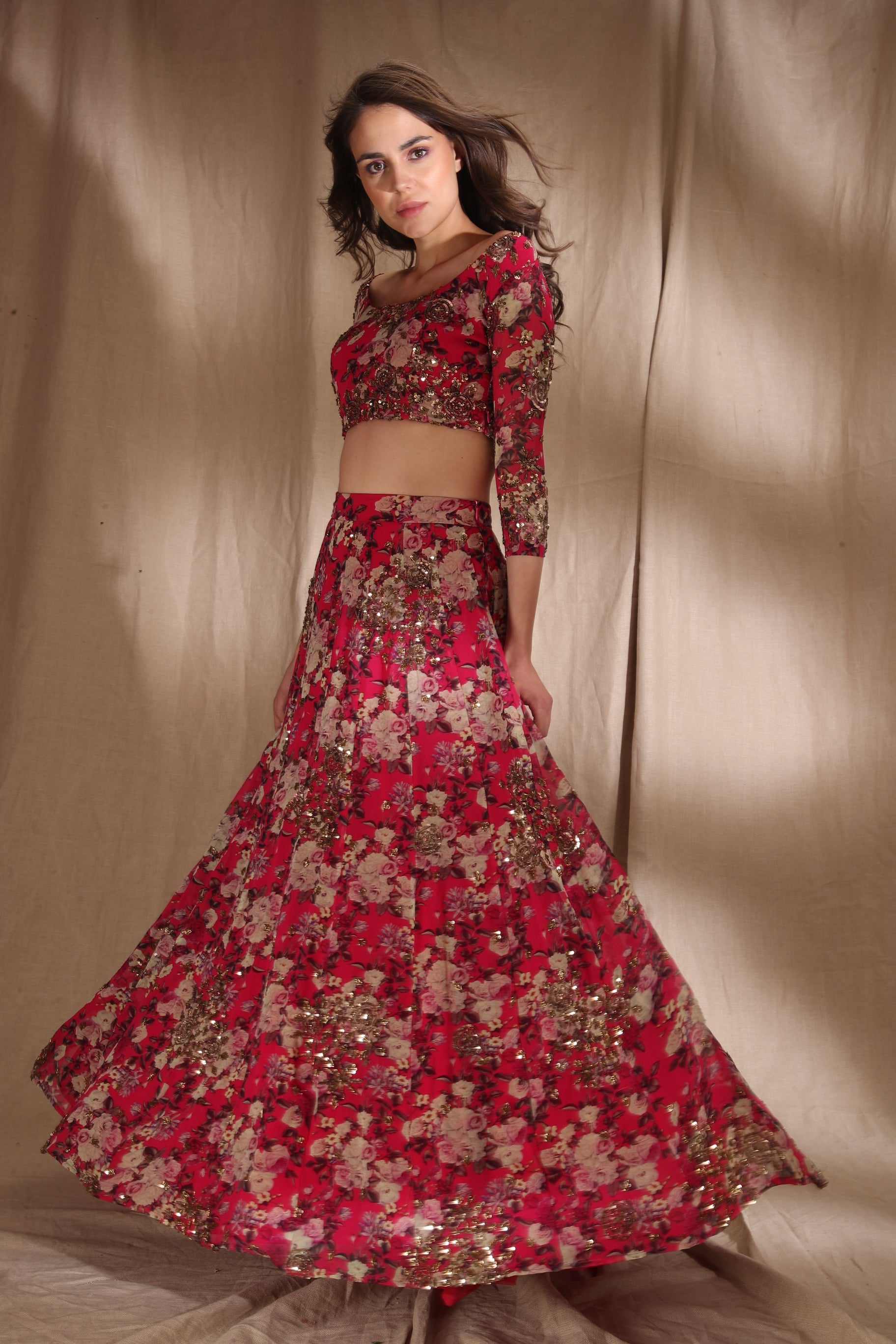 Featuring a HOT PINK FLORAL LEHENGA SET IN GEORJETTE.