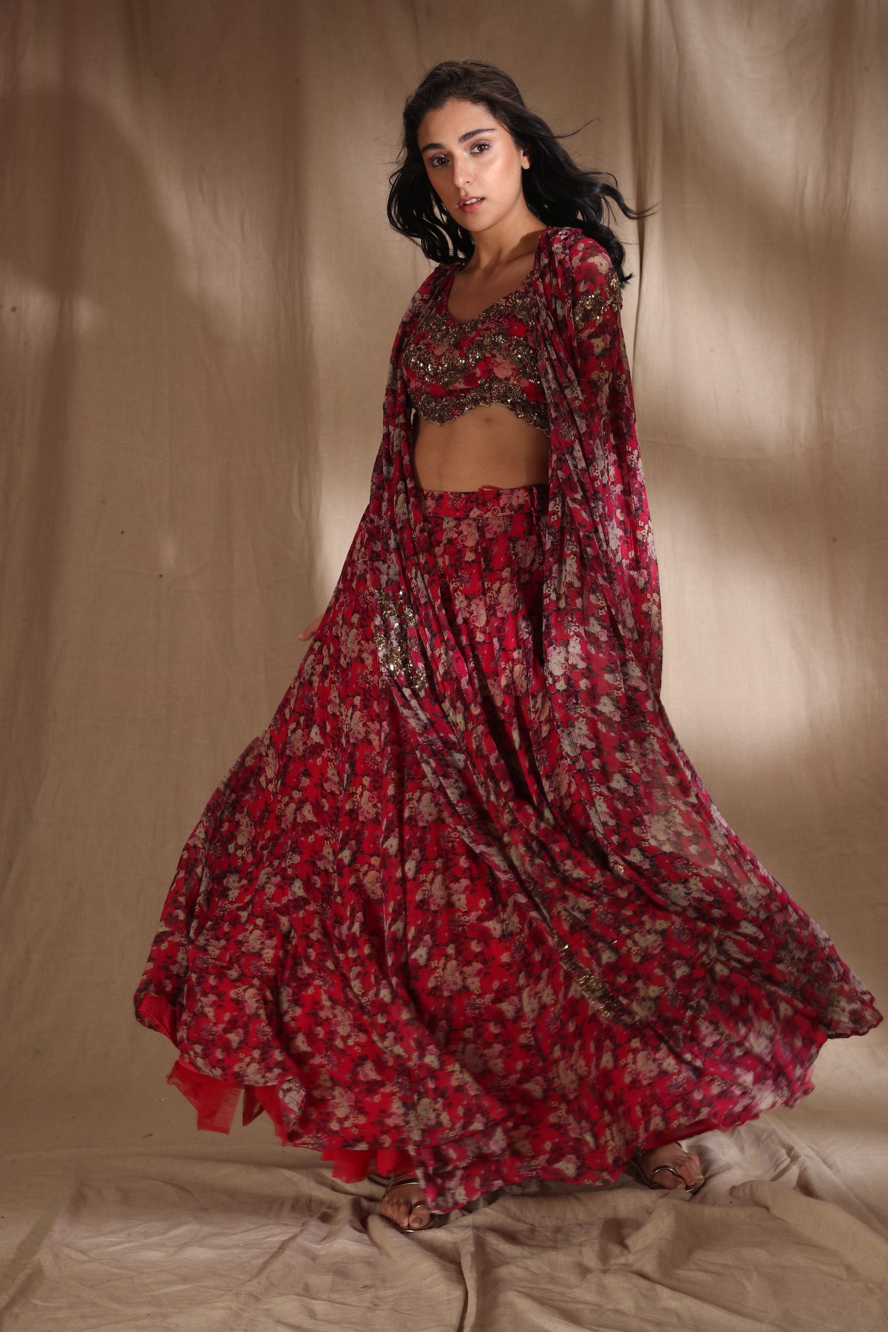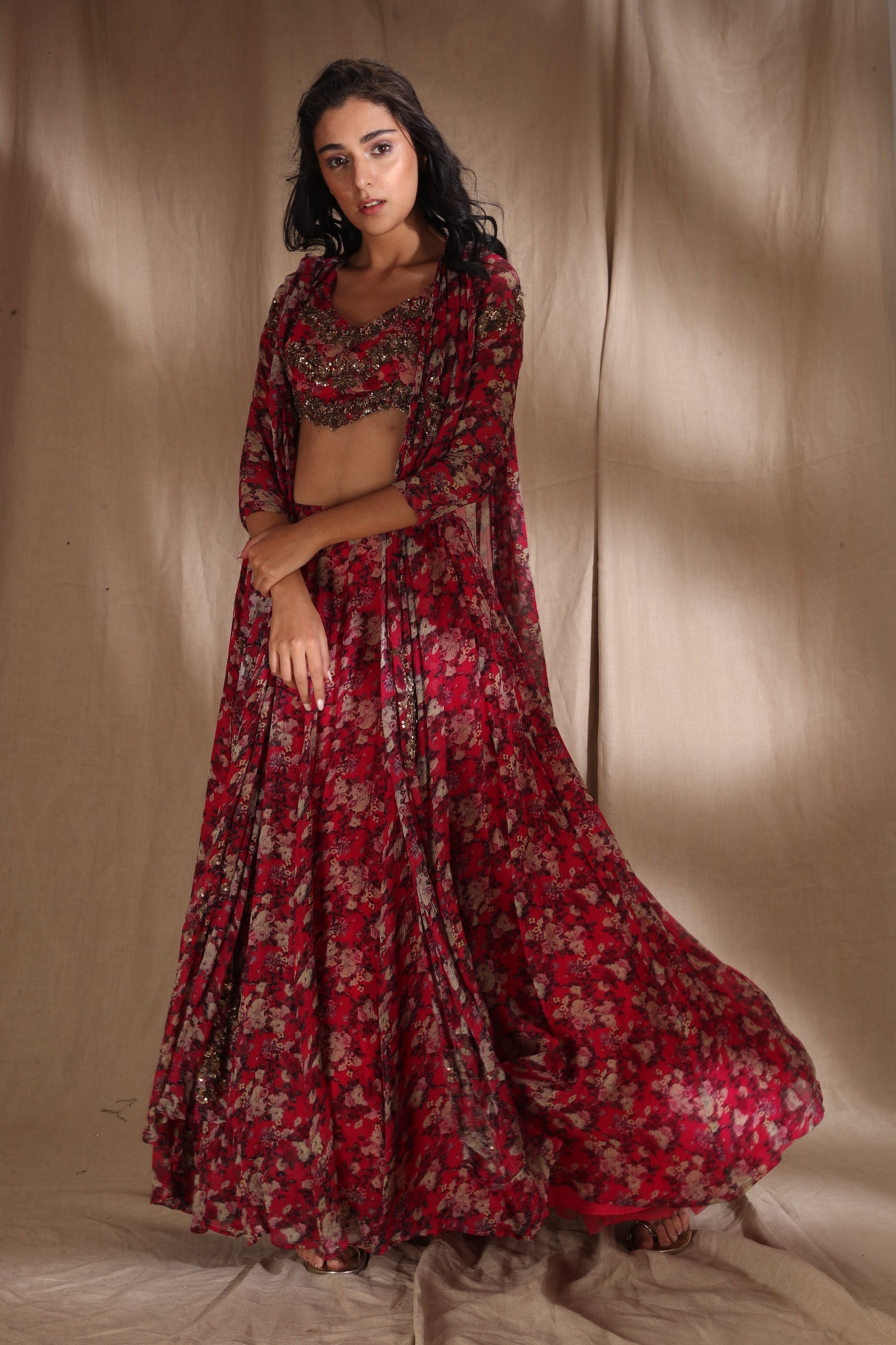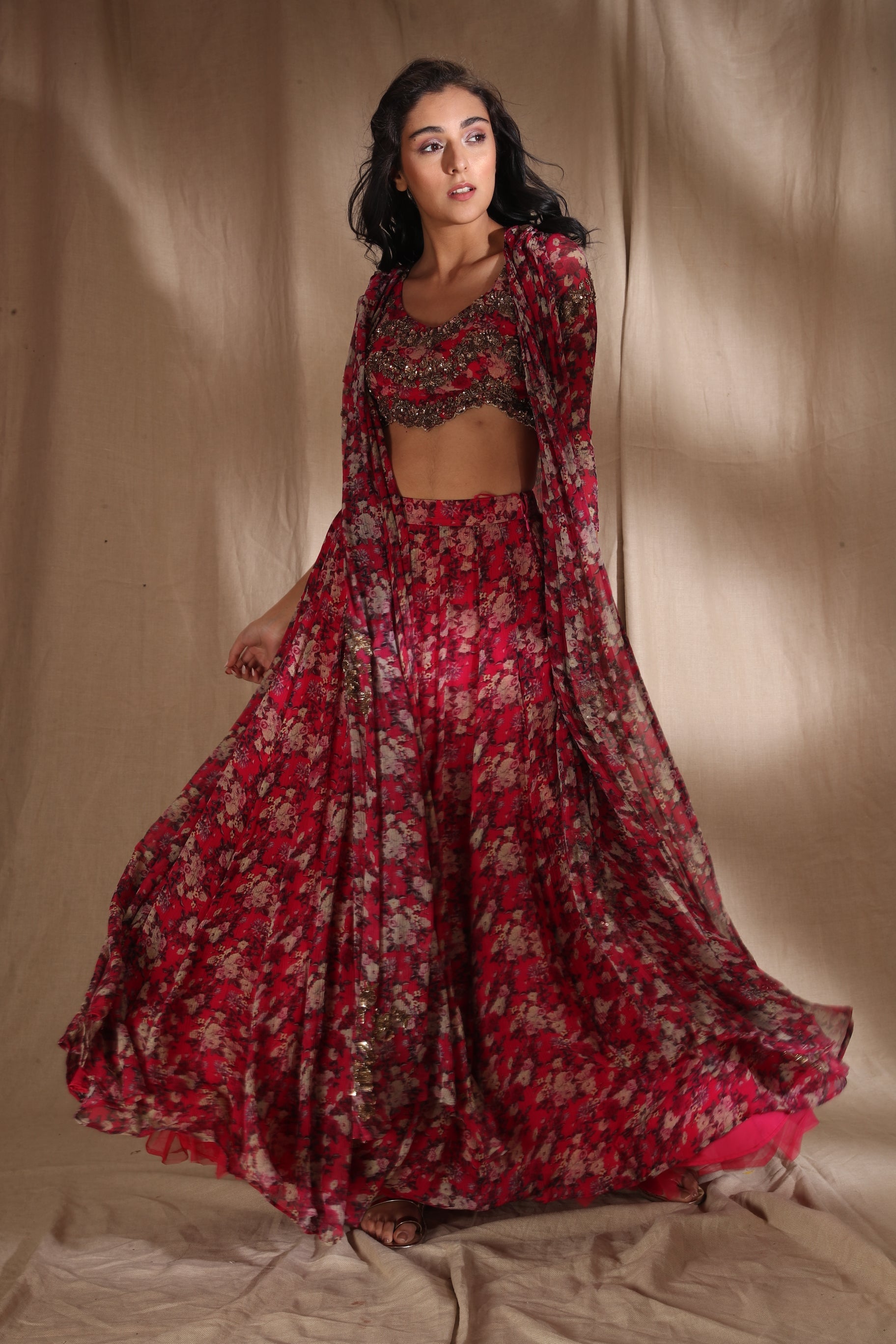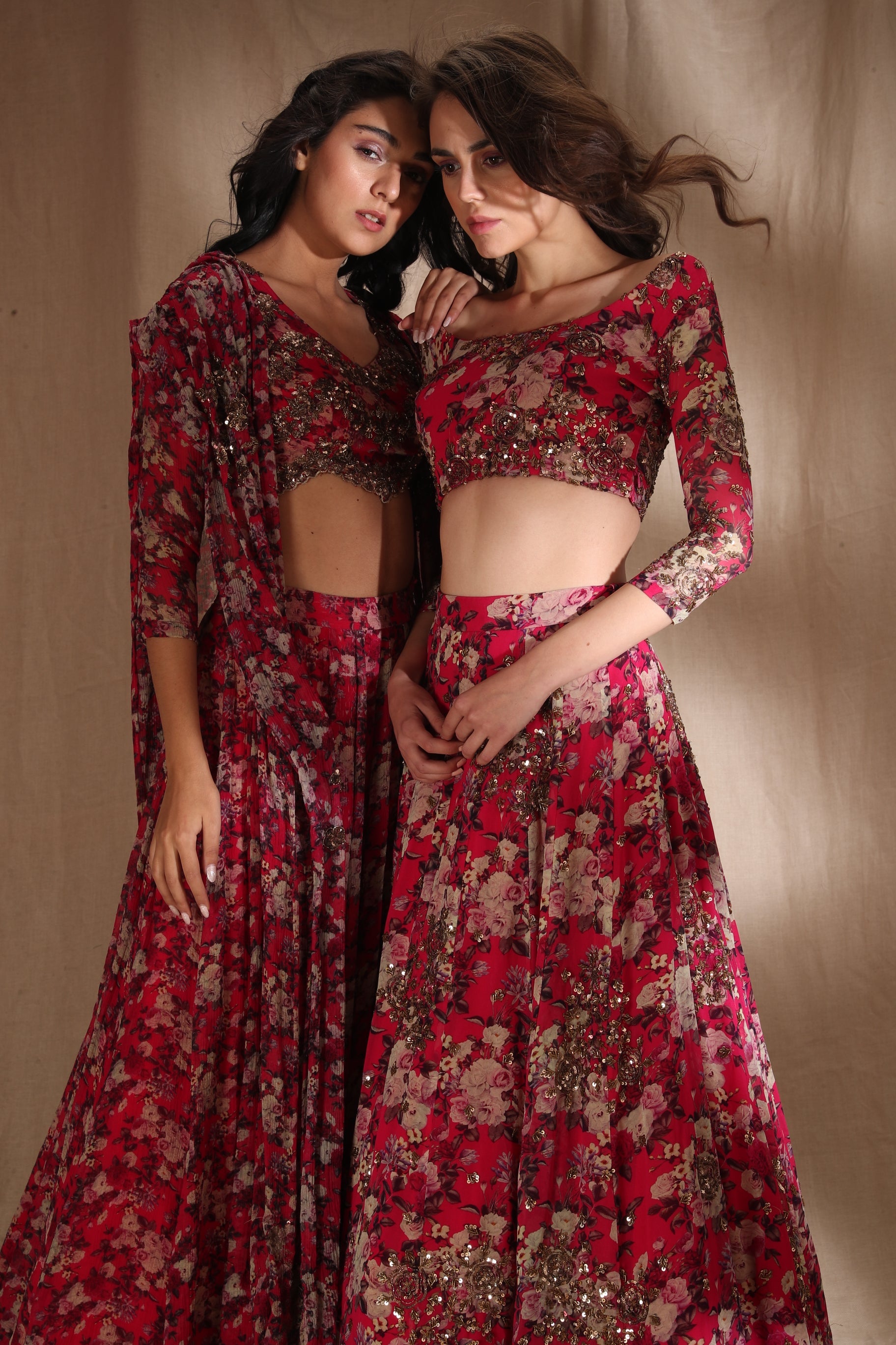 Featuring a HOT PINK FLORAL LEHENGA WITH CAPE SET IN GEORJETTE.