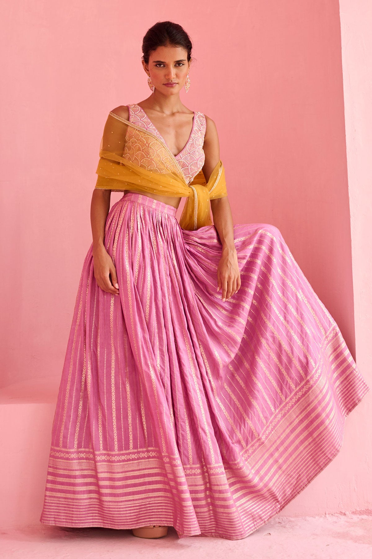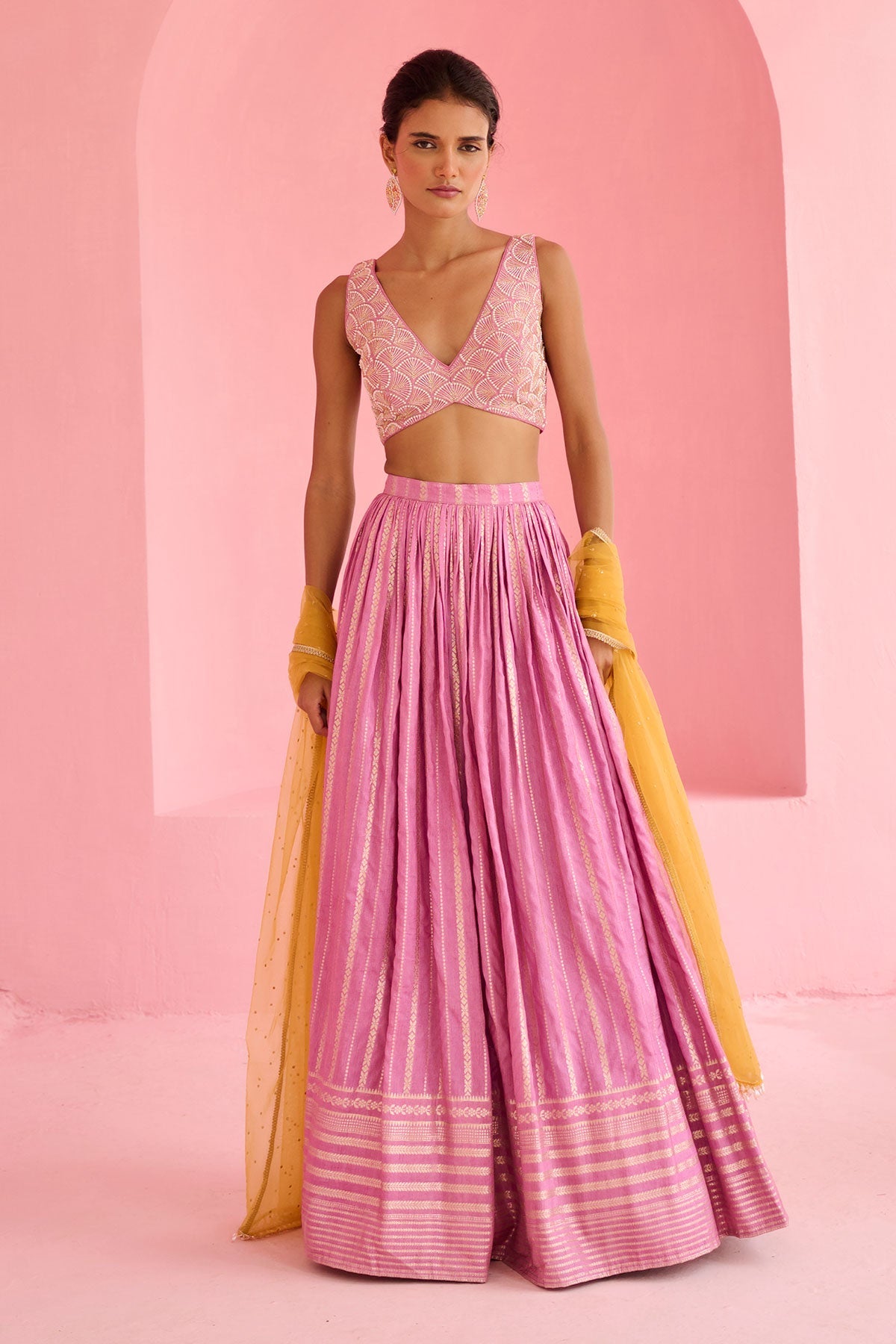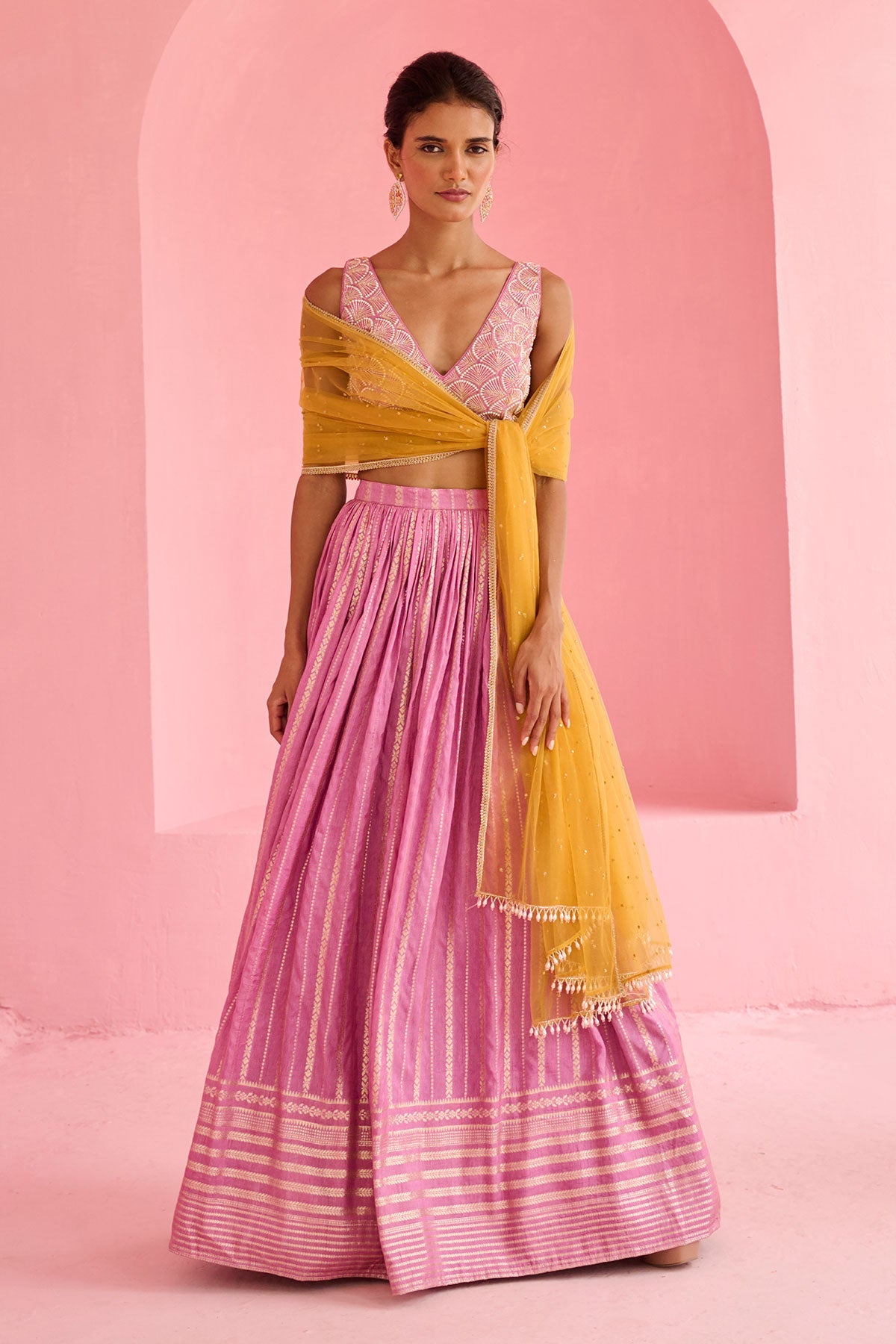 Jamewar Lehenga paired with pearl and glassbeads embroidered blouse and contrast tulle dupatta