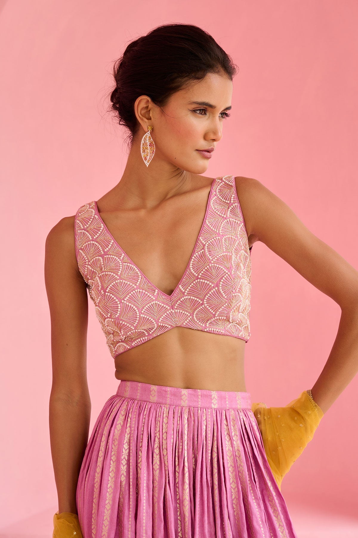 On The Model: XS, 5 Feet 7 Inches Neckline - V , Neck depth - 10.5 inches Blouse Length- 13.5 inches Skirt Length - 44 inches
