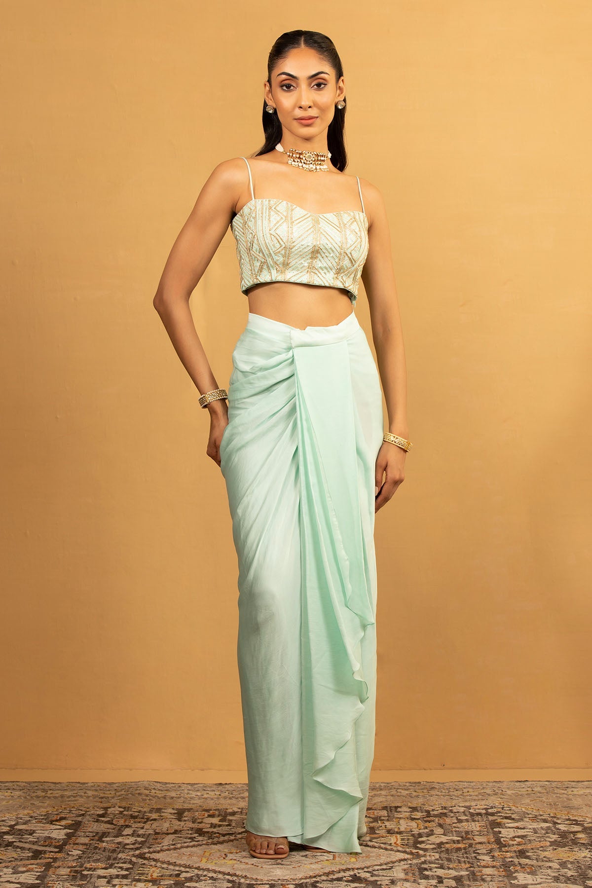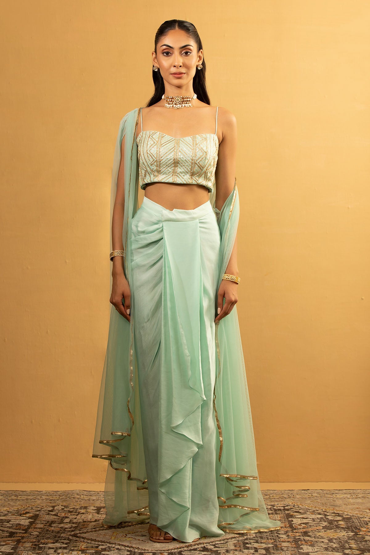 CONSIST OF ICE BLUE GOTA WORK TOP ON GEORGETTE FABRIC WITH PRE DRAPED DHOTI. IT IS PAIRED WITH NET CAPE.