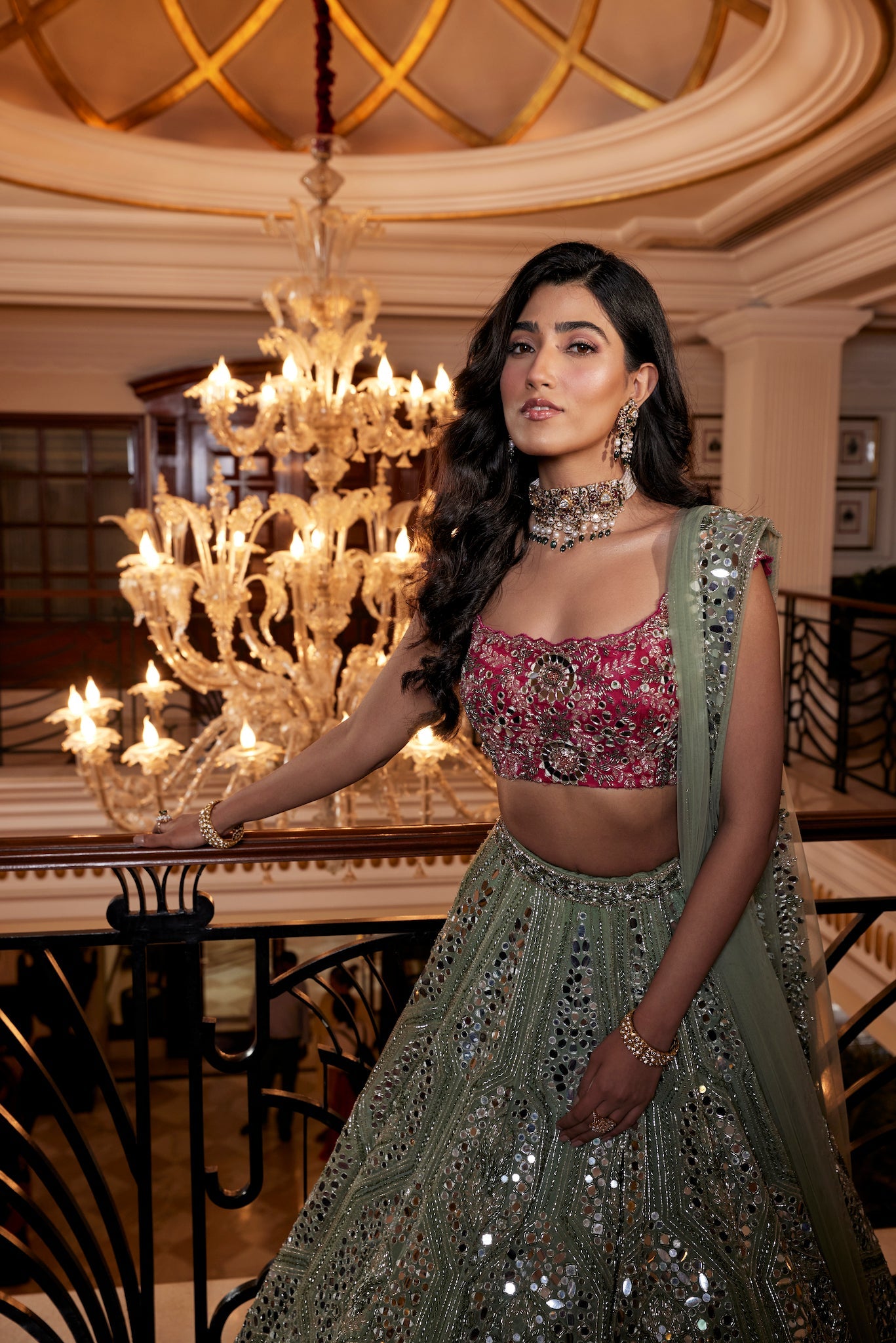 Featuring a meticulously hand-embroidered on organza fabric with mirror and cutdana detailing. The blouse shows mirror detailing on a contrasting hot pink base. Paired with a cutdana and mirror detailed dupatta with embroidery on all four sides.