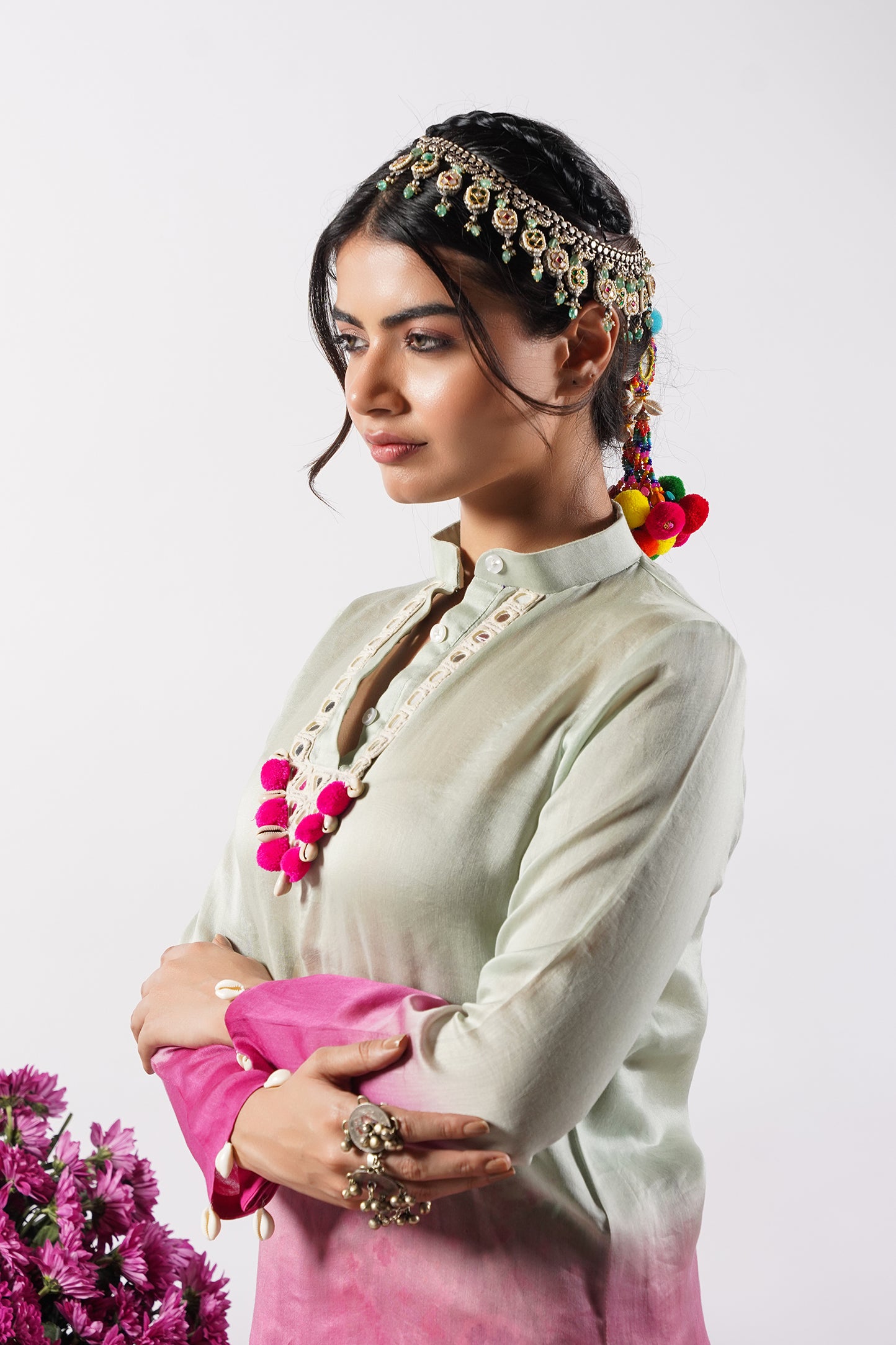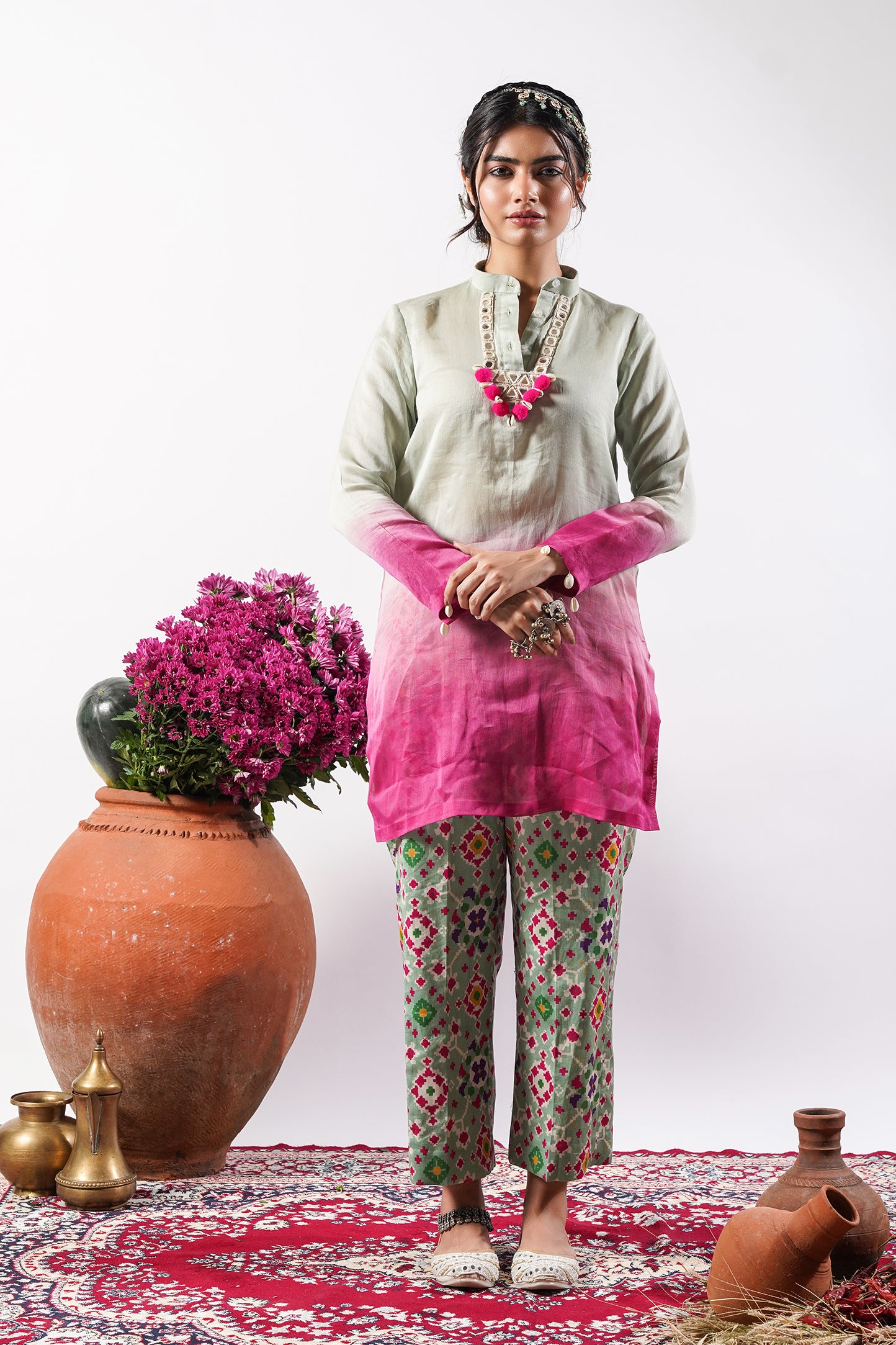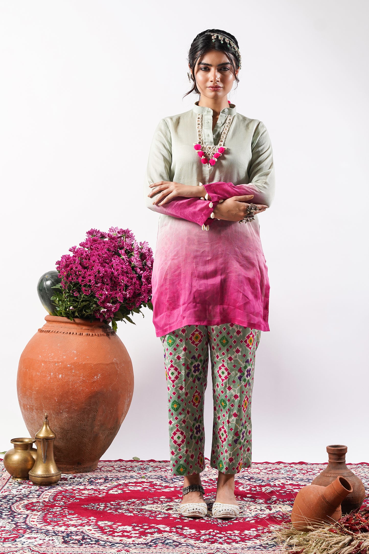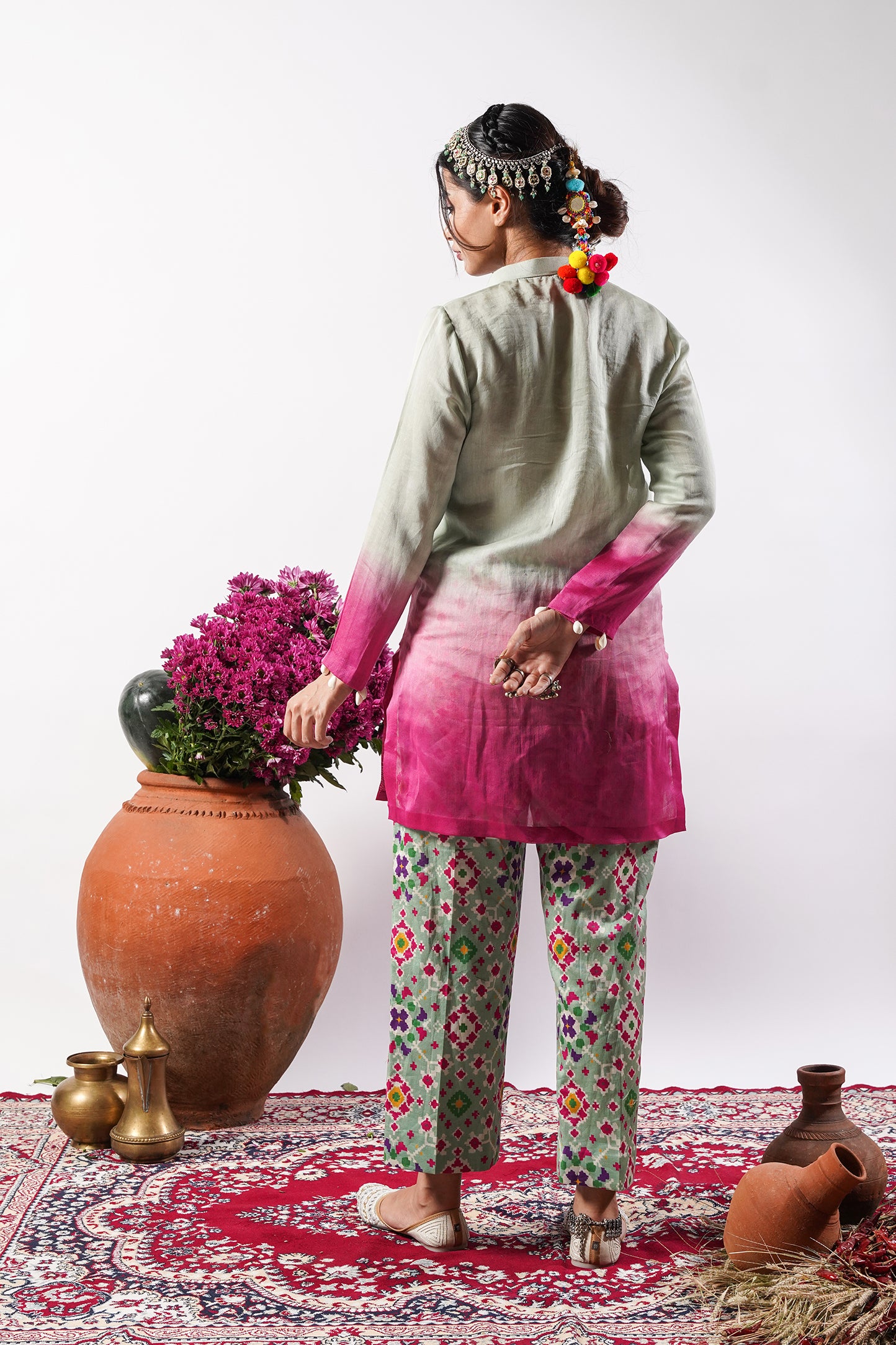 A Satorial pistachio green and vibrant pink Chanderi co-ord suit, encompassed a meticulously tailored top and bottom that harmonize seamlessly. This ensemble epitomizes the zenith of vogue, perfect for attending gatherings.