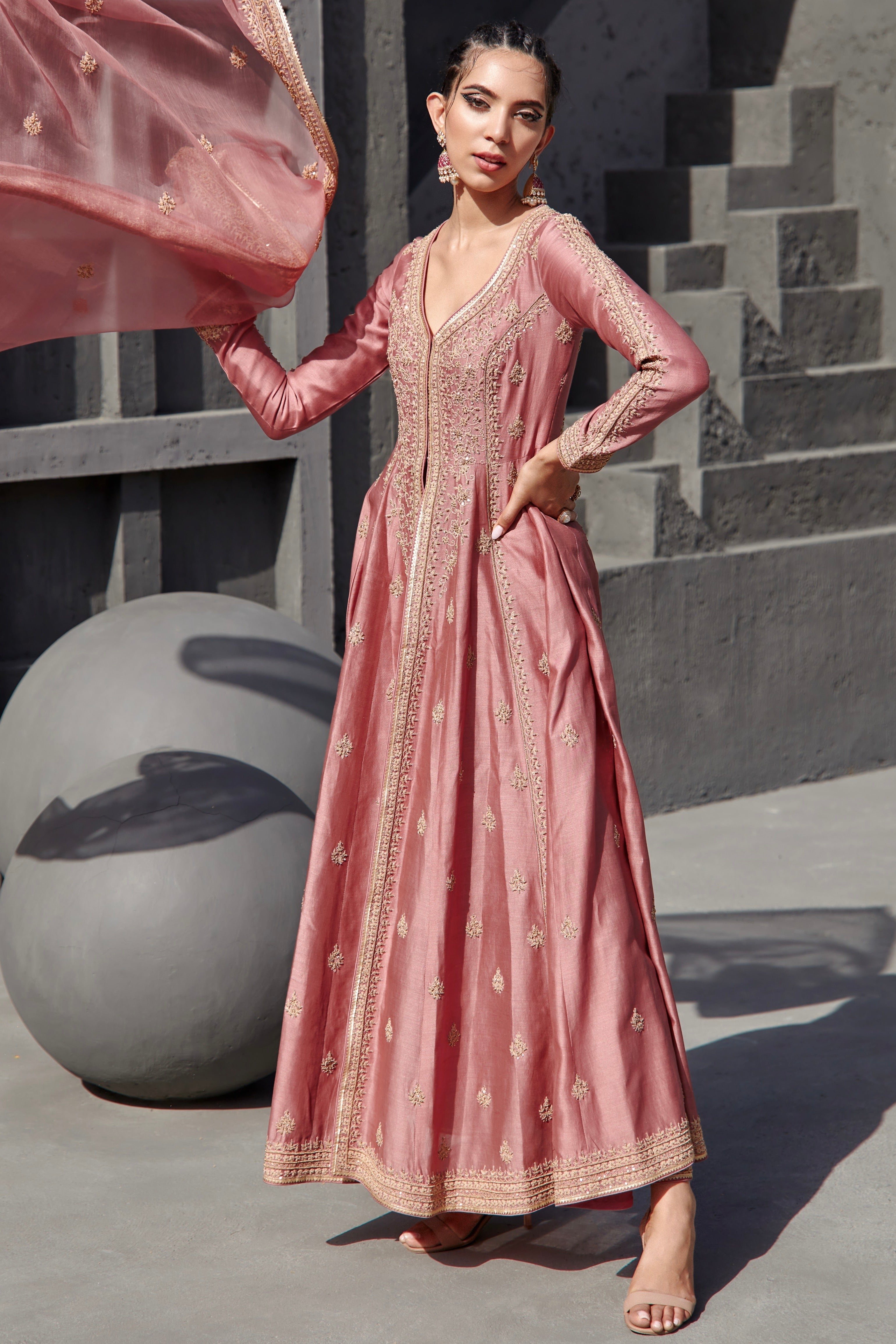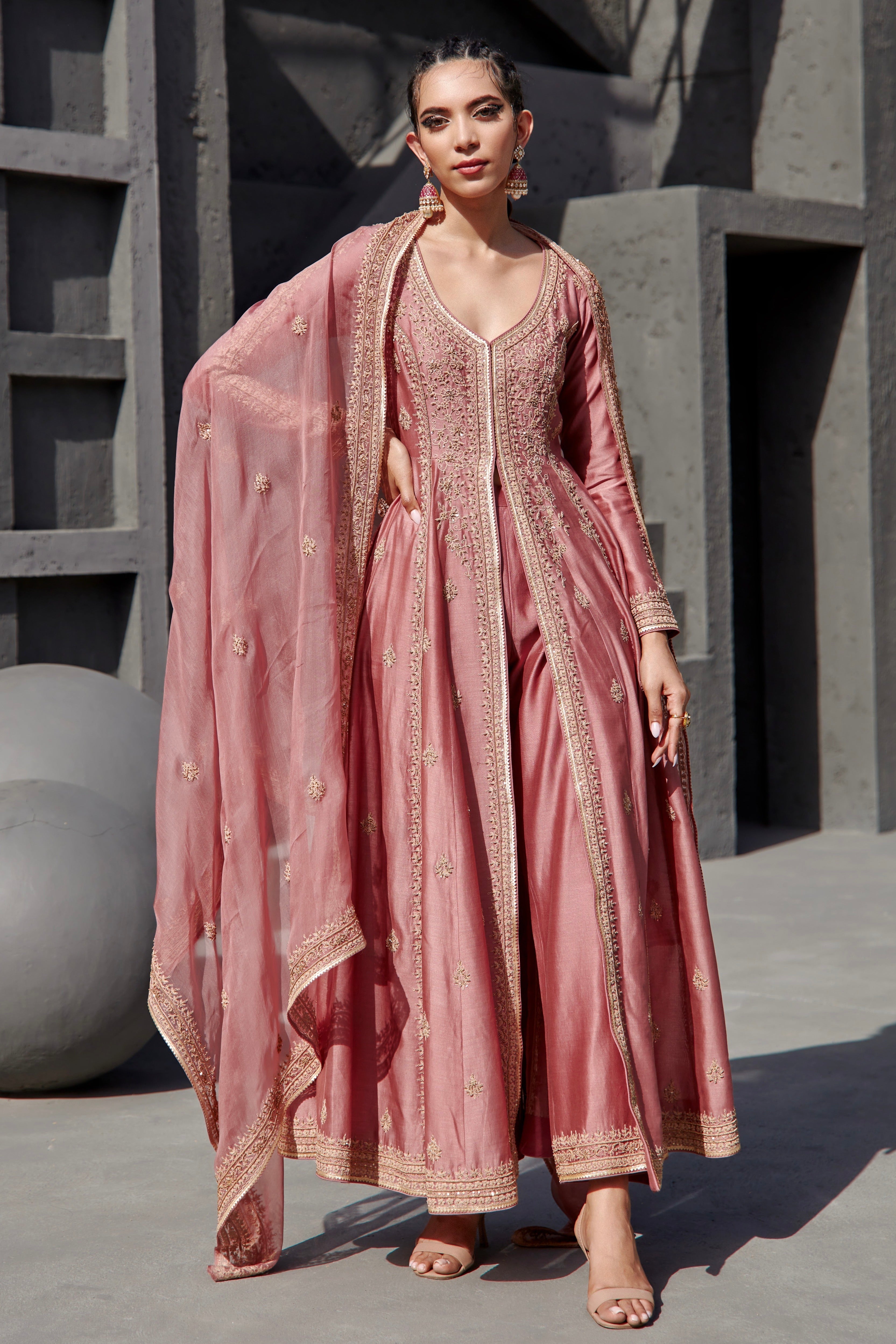 Featuring an aurora pink Chanderi jacket pant set paired with organza dupatta with light gold dori and aari embroidery