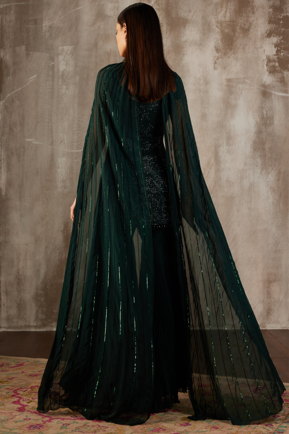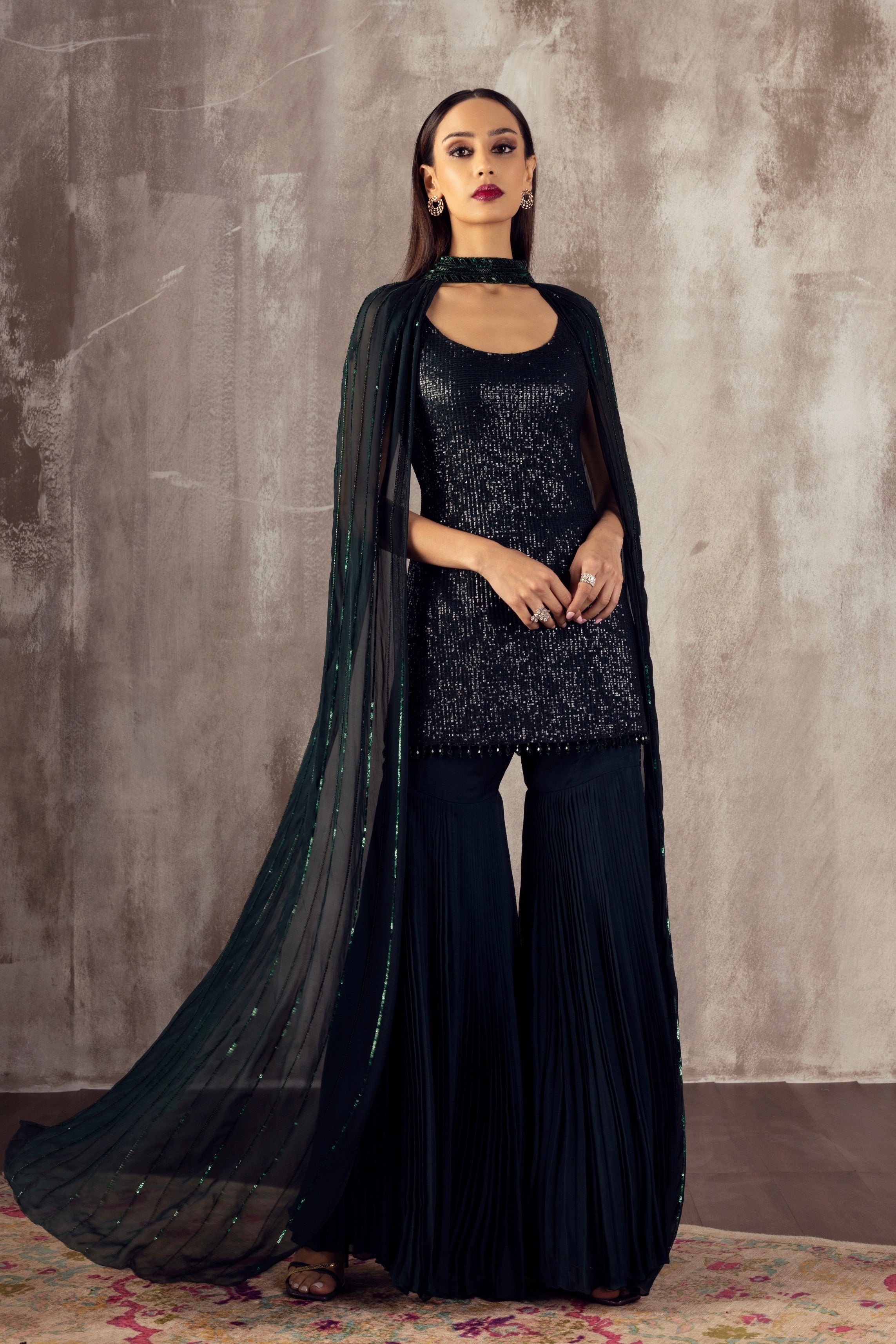 Featuring a sequin embroidered kurta paired with a sharara and a hand-embroidered cape style dupatta