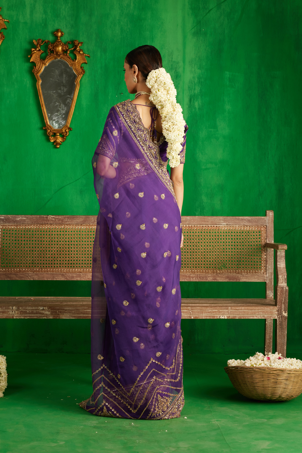 Featuring an Irish purple Organza saree paired with a raw silk blouse with gold dori and aari embroidery