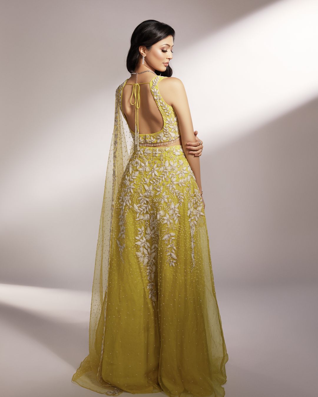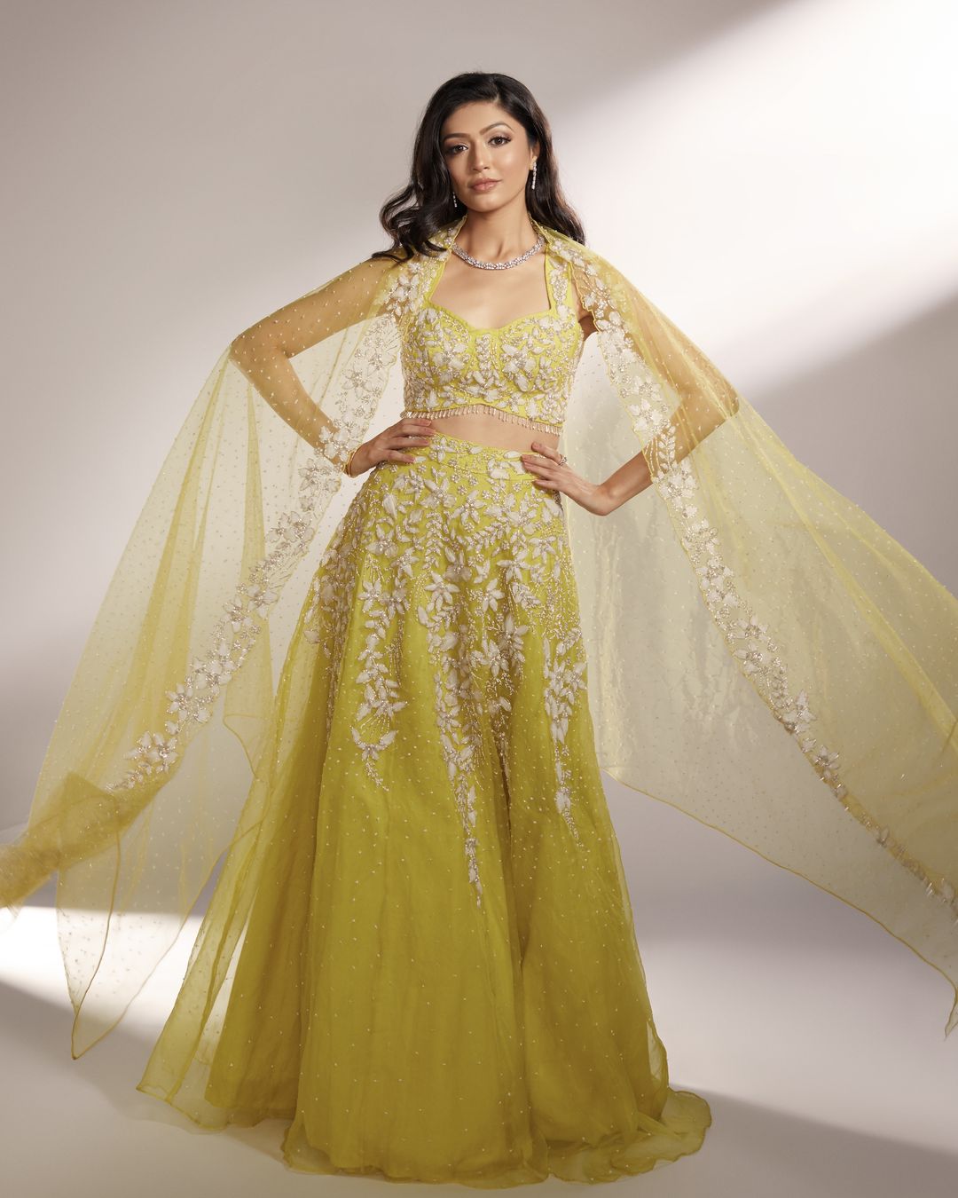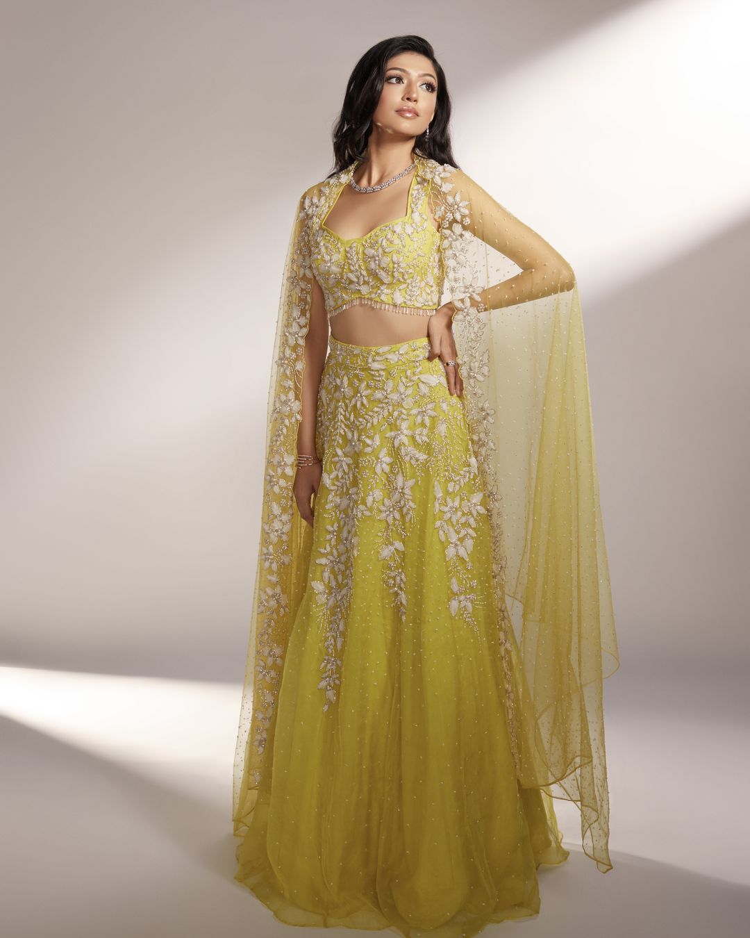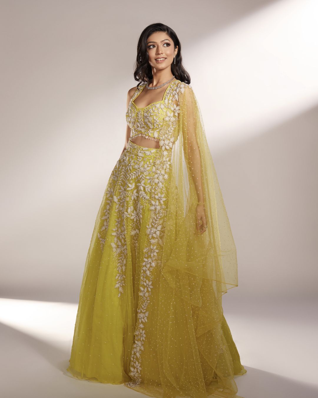 Iris is our lime yellow lehenga, paired with an embroidered blouse and one-side embroidered dupatta, embellished with organza floral details accompanied with silver glass beads and pearls.
