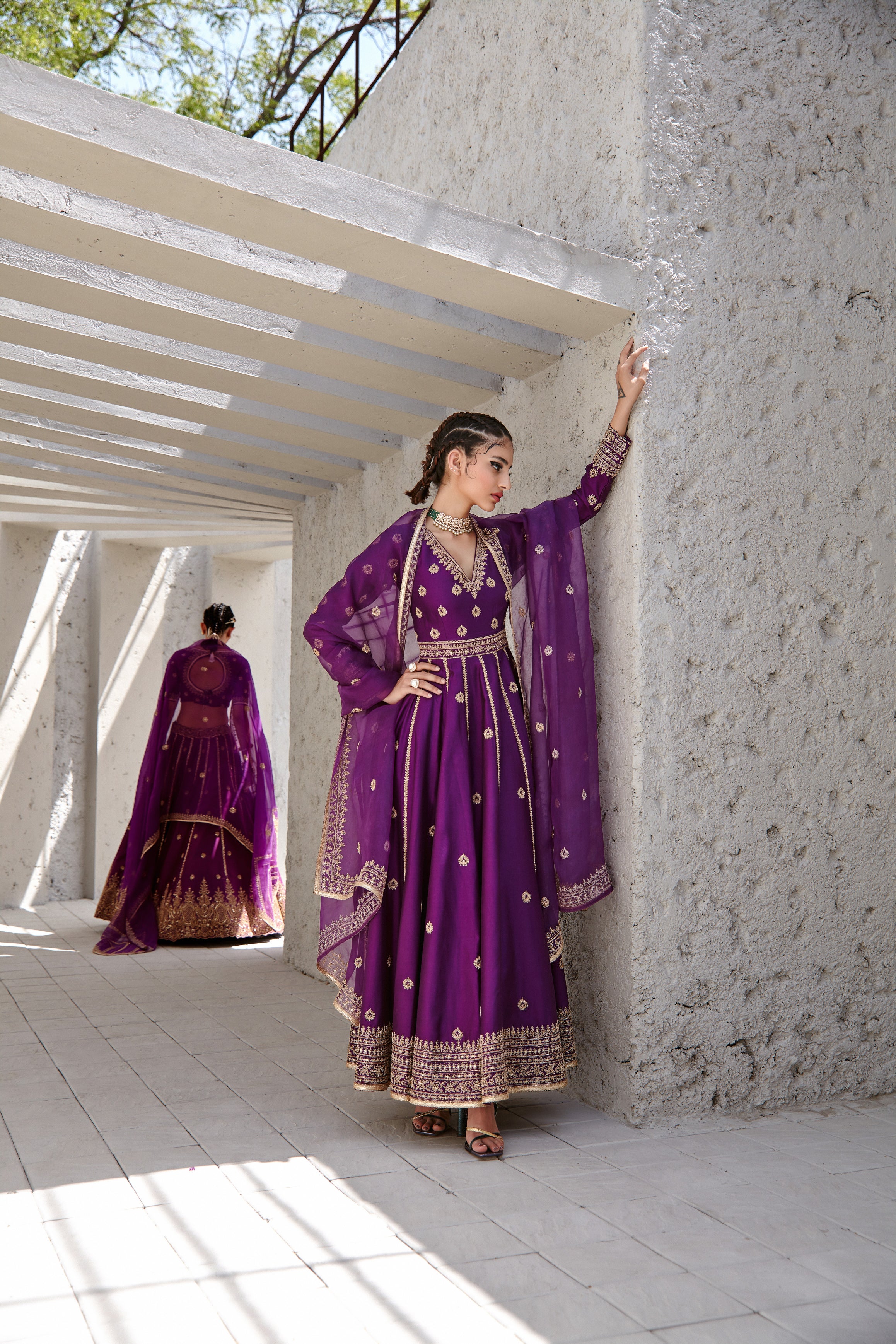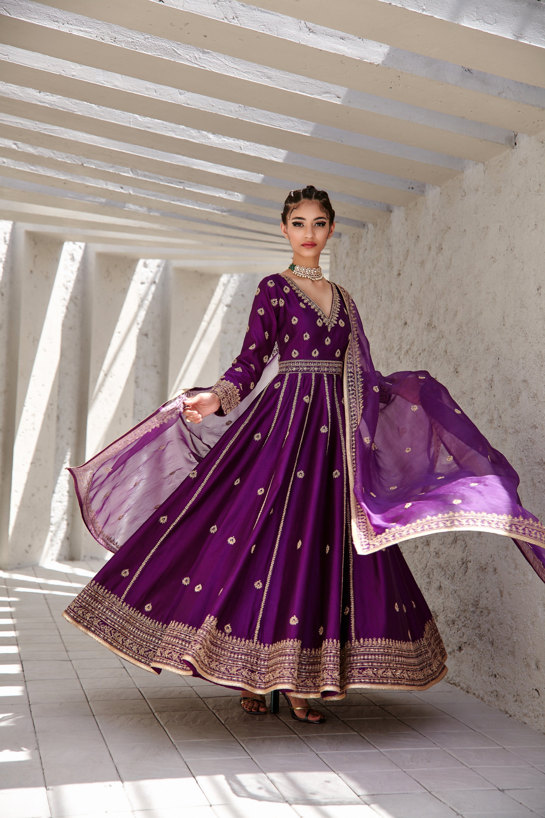 Featuring a purple chanderi Anarkali pant set paired with organza base dupatta with gold dori and aari embroidery on it.