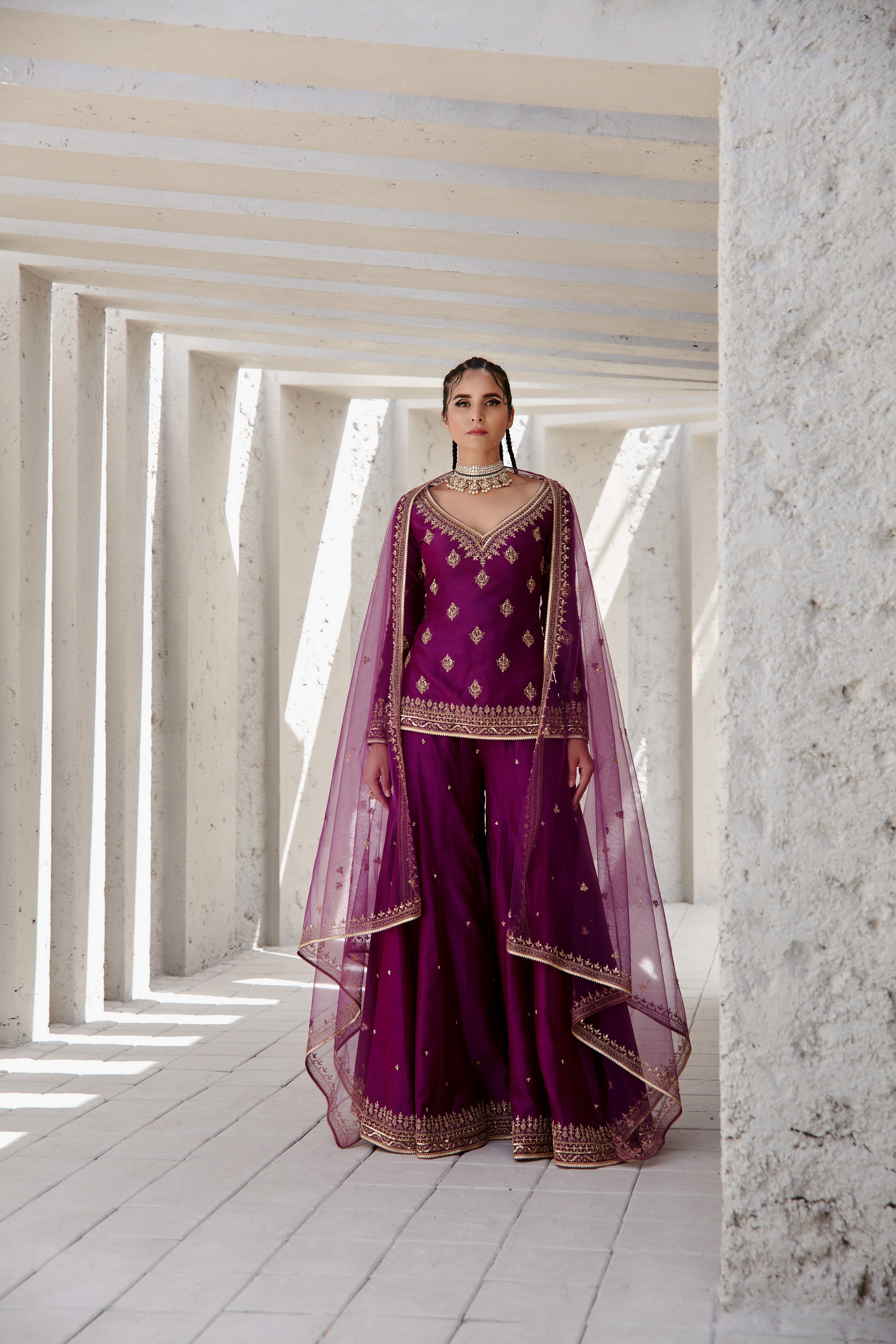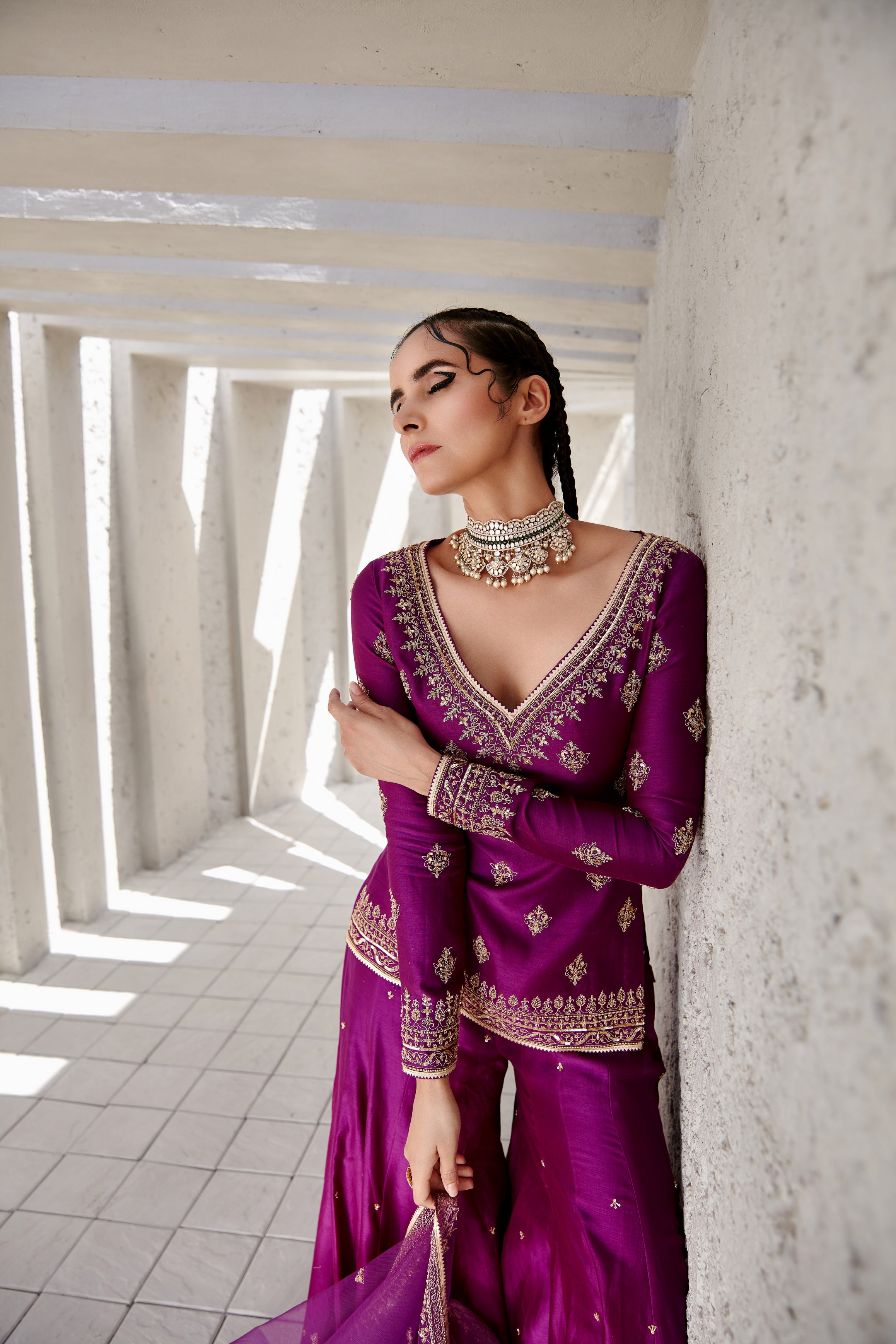 Featuring a purple chanderi kurta sharara set paired with an organza base dupatta with gold dori and aari embroidery on it.