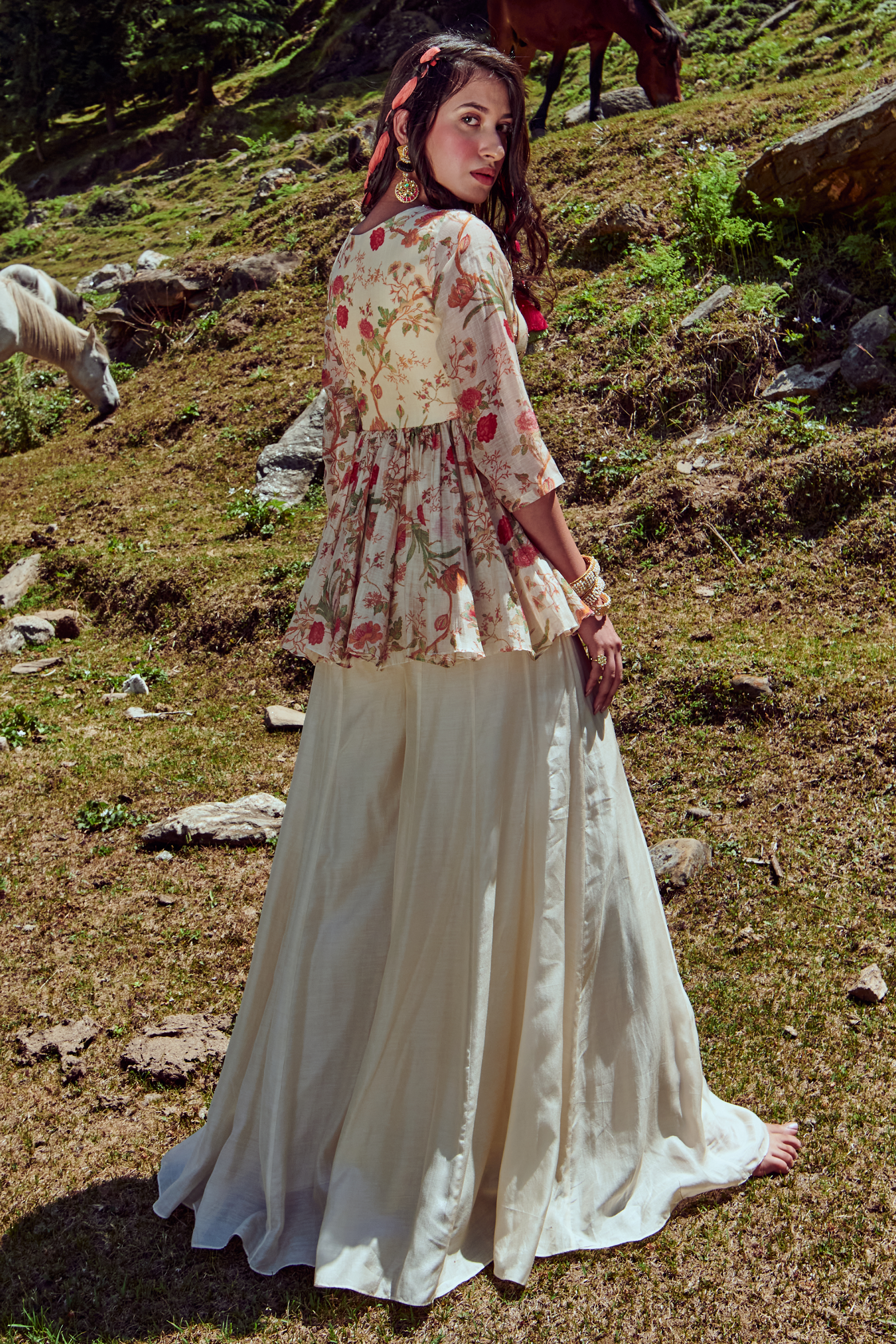 Ivory naksha print peplum, embellished with mirror, sequins and resham thread work detailed with hand embellished buttons at front. It is paired with off–white palazzos.