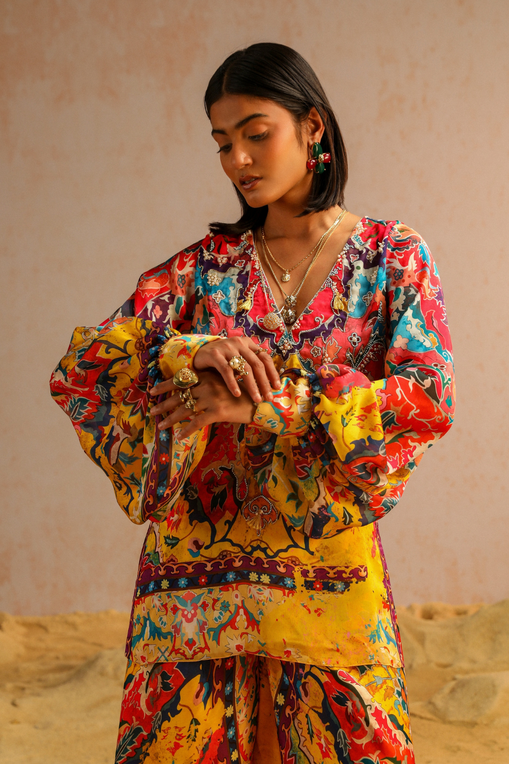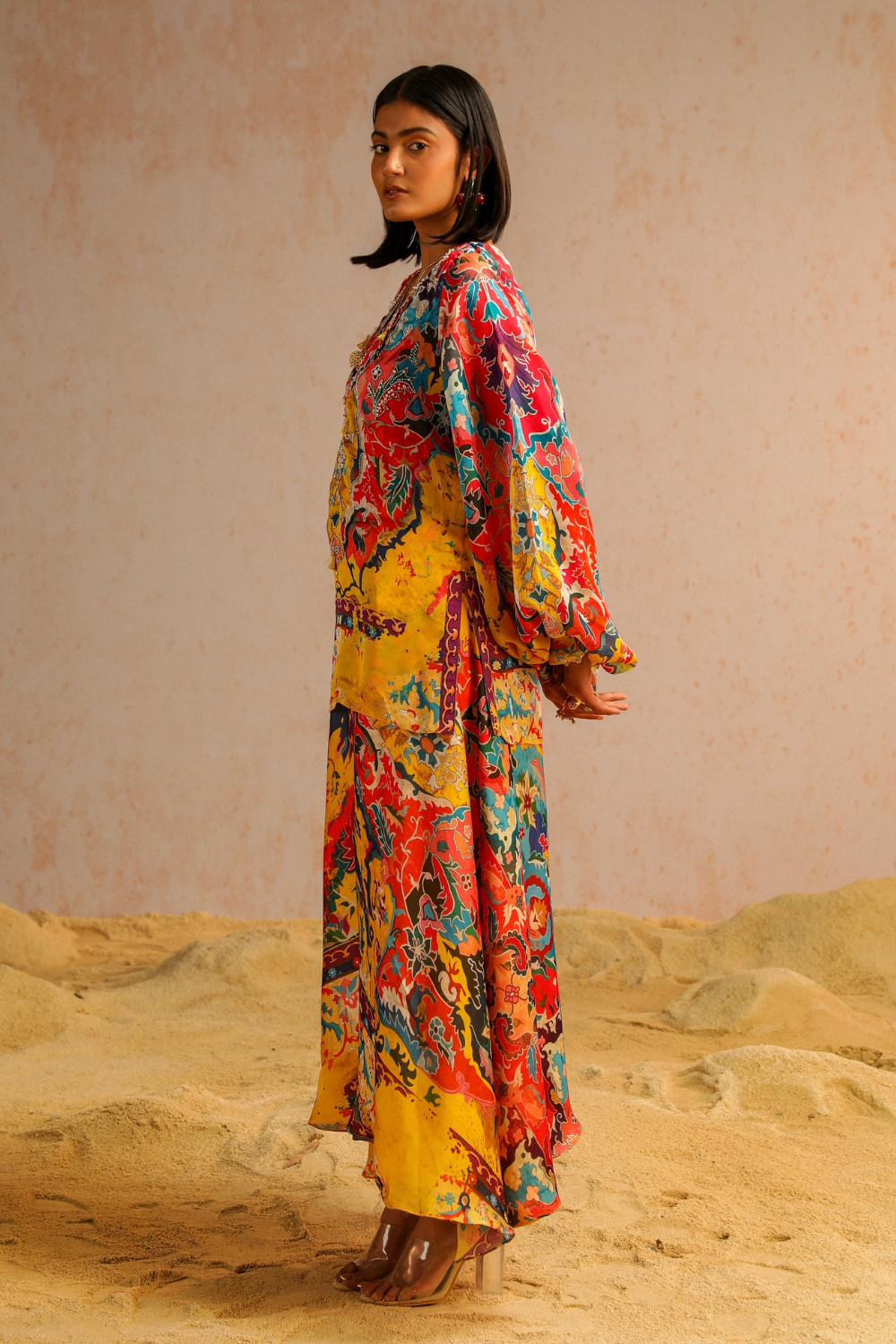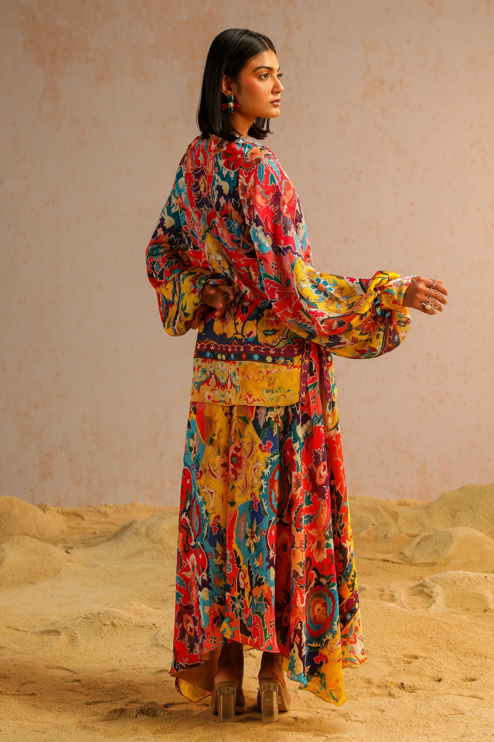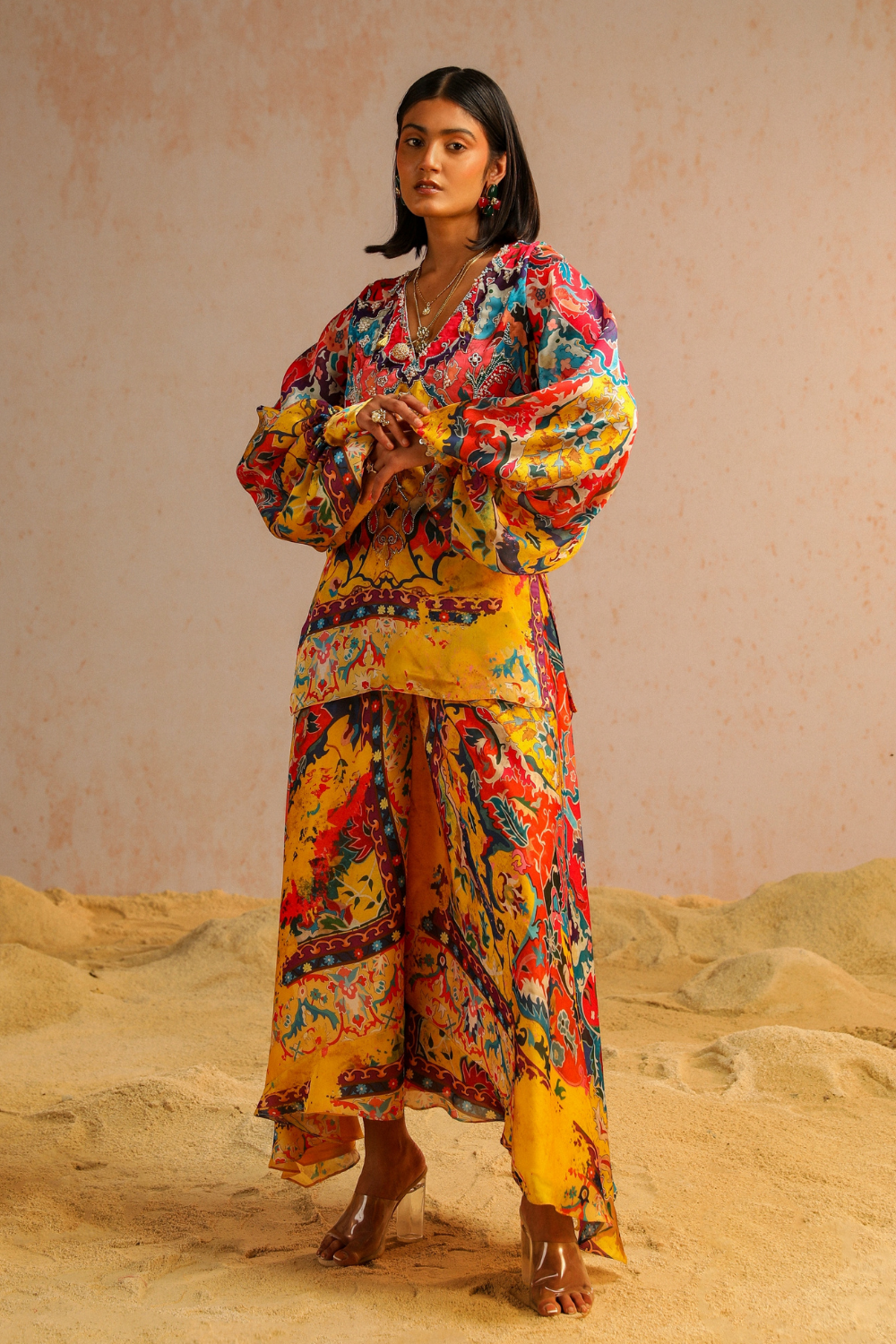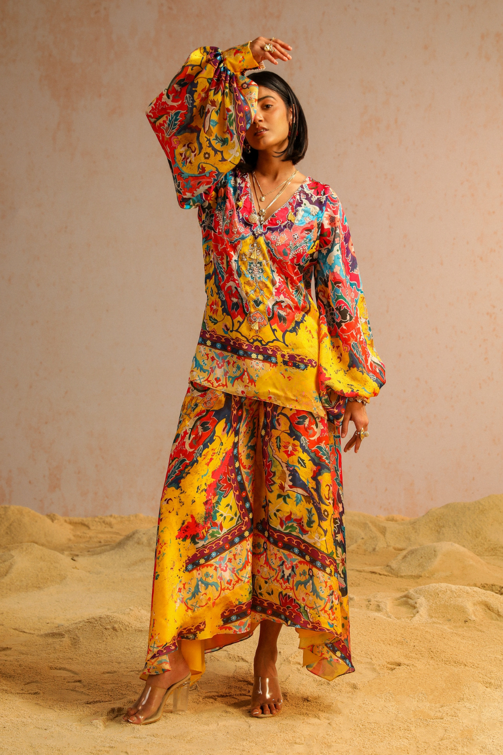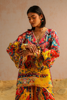 The silhouette of this ensemble showcases the relaxed fit of yellow satin Georgette A-line pants, adorned with an intricate motif print inspired by Jan Kath's erased carpets. Paired with a short kurta in matching tones, the ensemble is further enhanced by the embroidered neckline, both at the front and back, adding a touch of intricacy and detail. The meticulous aari and zardozi work, featuring sequins, pearls, and tassels, brings movement and artistic elegance to the outfit. Vibrant hues reminiscent of macaw plumage create an exotic allure, completing the harmonious blend of sophistication and creativity in this ensemble.