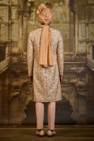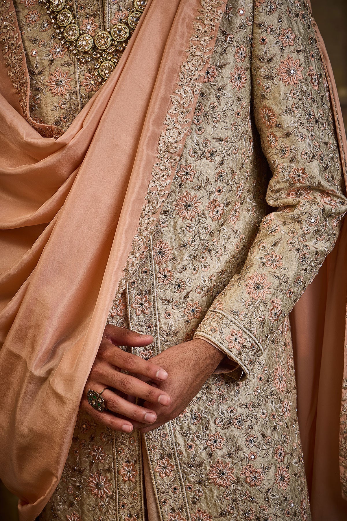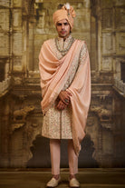 Ivory Brocade Sherwani All Over Embroidered With Tonal Resham Highlighted With Beads, Dabka And Moti Accompained With A Cotton Silk Kurta And Pant. An Optional Gold Tissue Worked Stole, And Worked Jutis Can Be Ordered Additionally.
