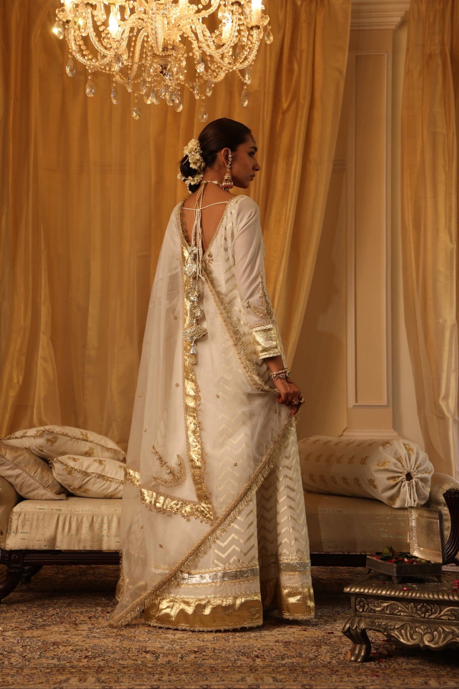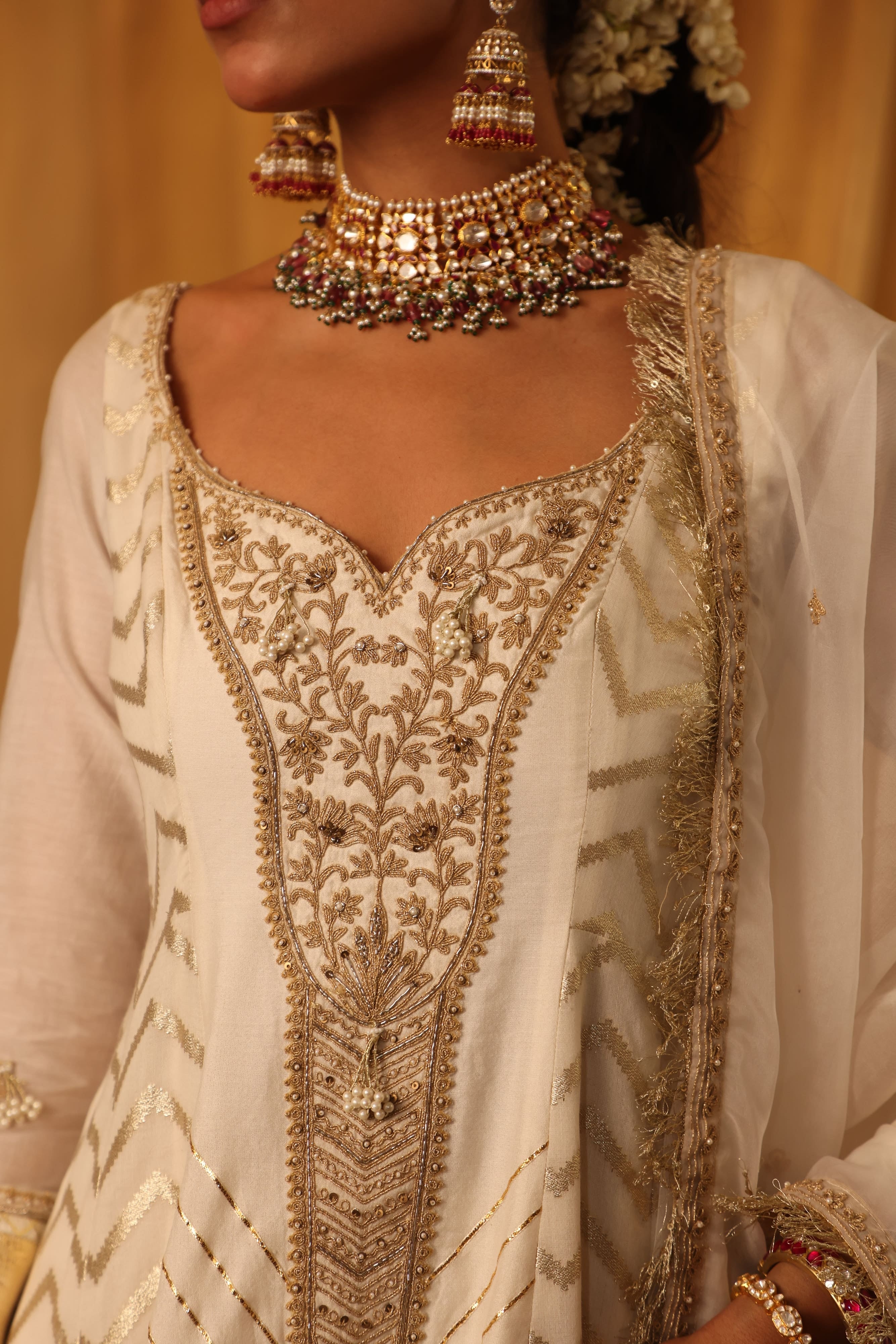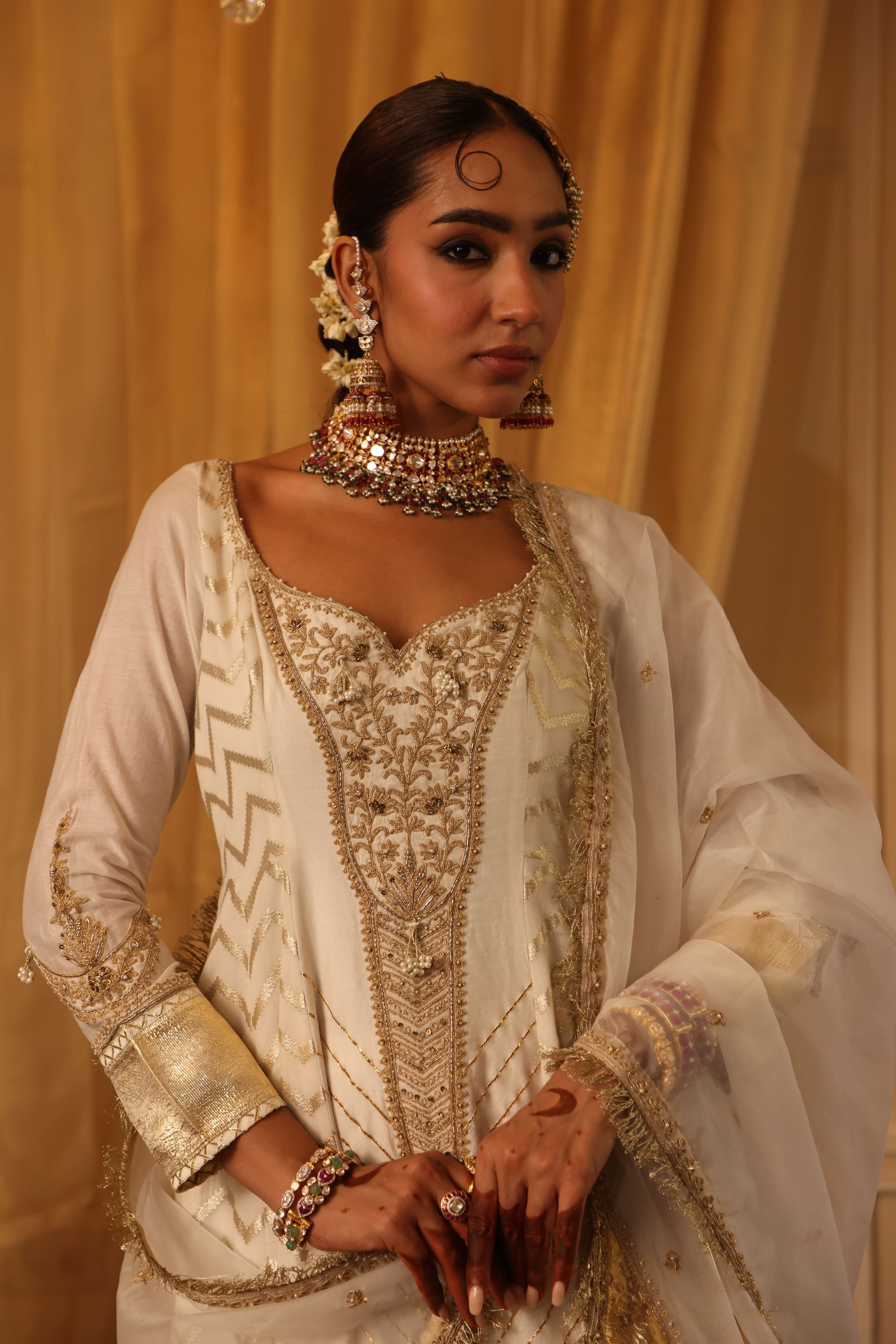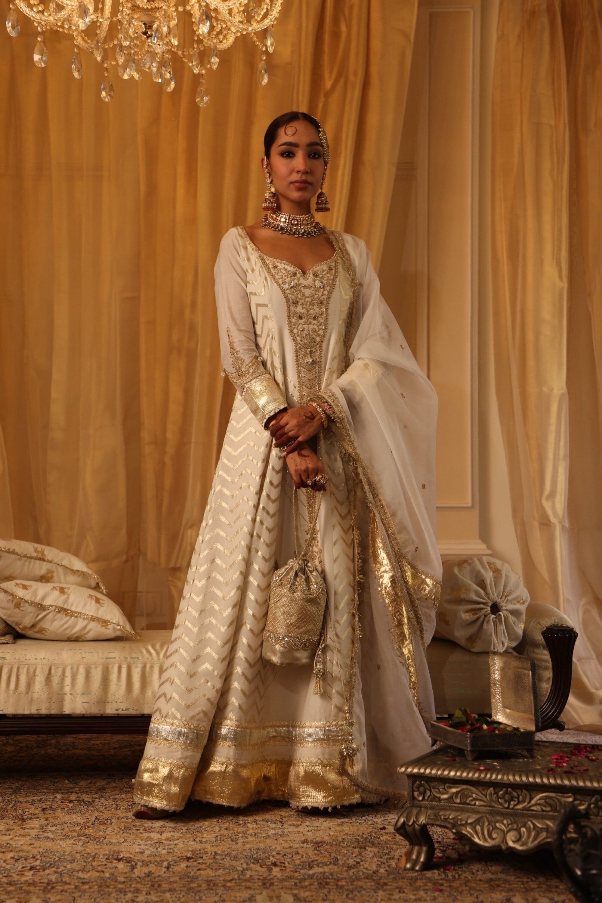 This Ivory Chanderi Silk Anarkali Set is adorned with celestial moon and lotus motifs, intricate dori and zari embroidery, and shimmering gota texturing. The silver and gold lampi borders on the sleeves and hem add a regal touch, while the sheer organza dupatta completes the look with lampi borders and dori embroidery. A perfect blend of ethereal sophistication and heritage craftsmanship. Fabric: Chanderi Silk, Organza |