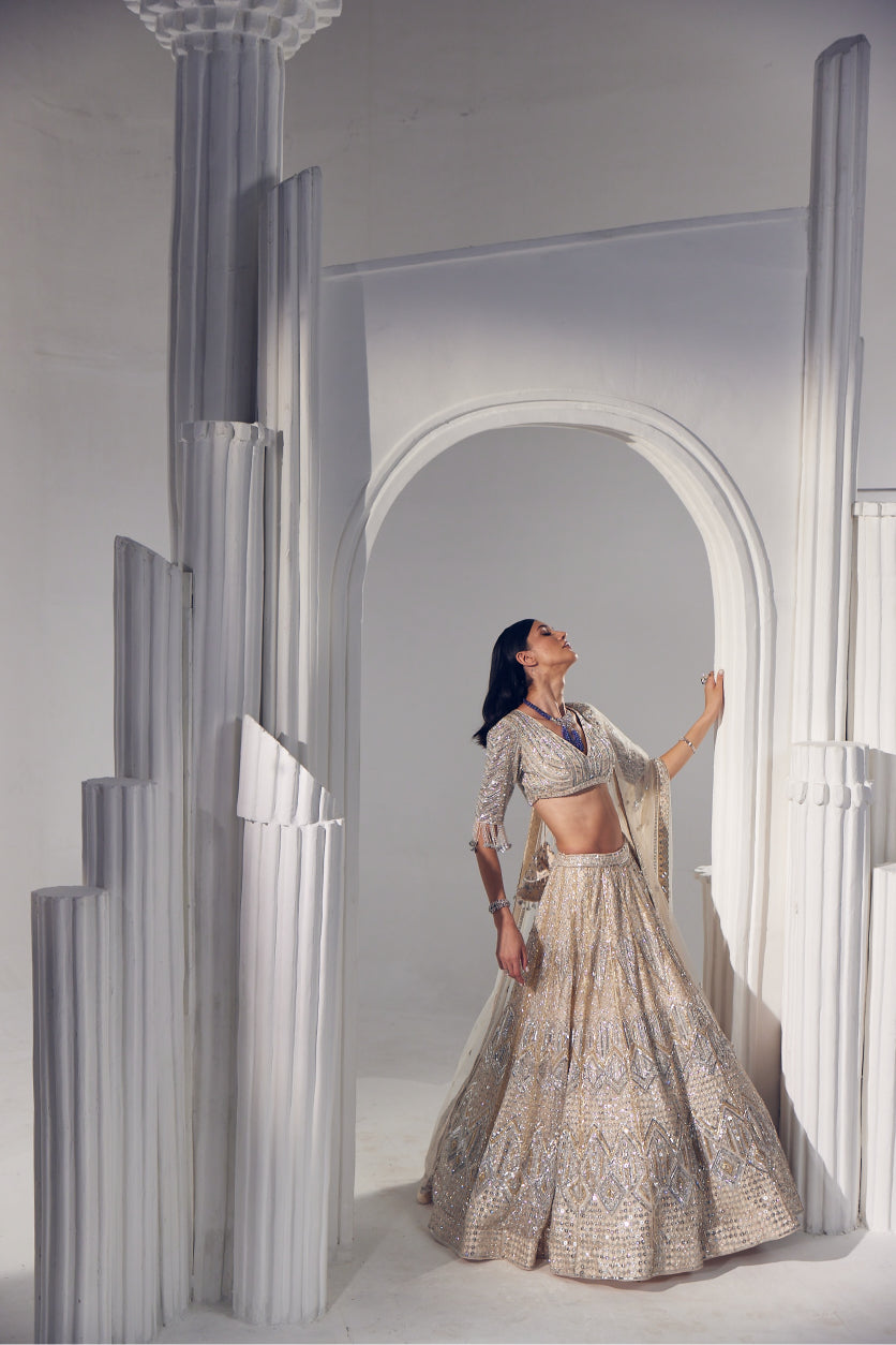 Ivory Color Lehenga set features muted silver work embroidery mixed ruchika hurria statement embroidery elements. The set is paired with beautiful net dupatta with cutwork border and floral scattered Swarovski on the inside.