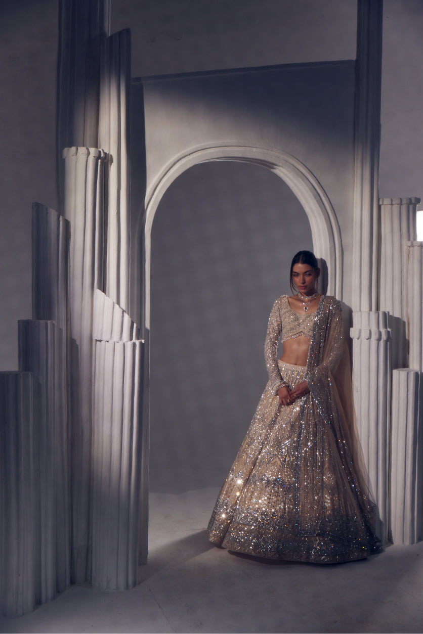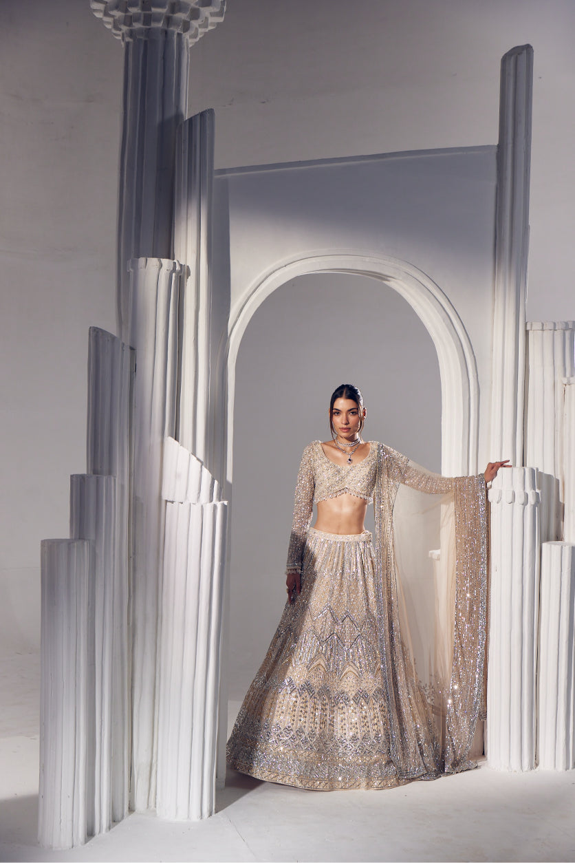 Ivory Silver Embroidery Lehenga Set Features Muted Silver Work Embroidery Mixed Ruchika Hurria Statement Embroidery Elements. The Set Is Paired With Beautiful Net Statement Duppatta