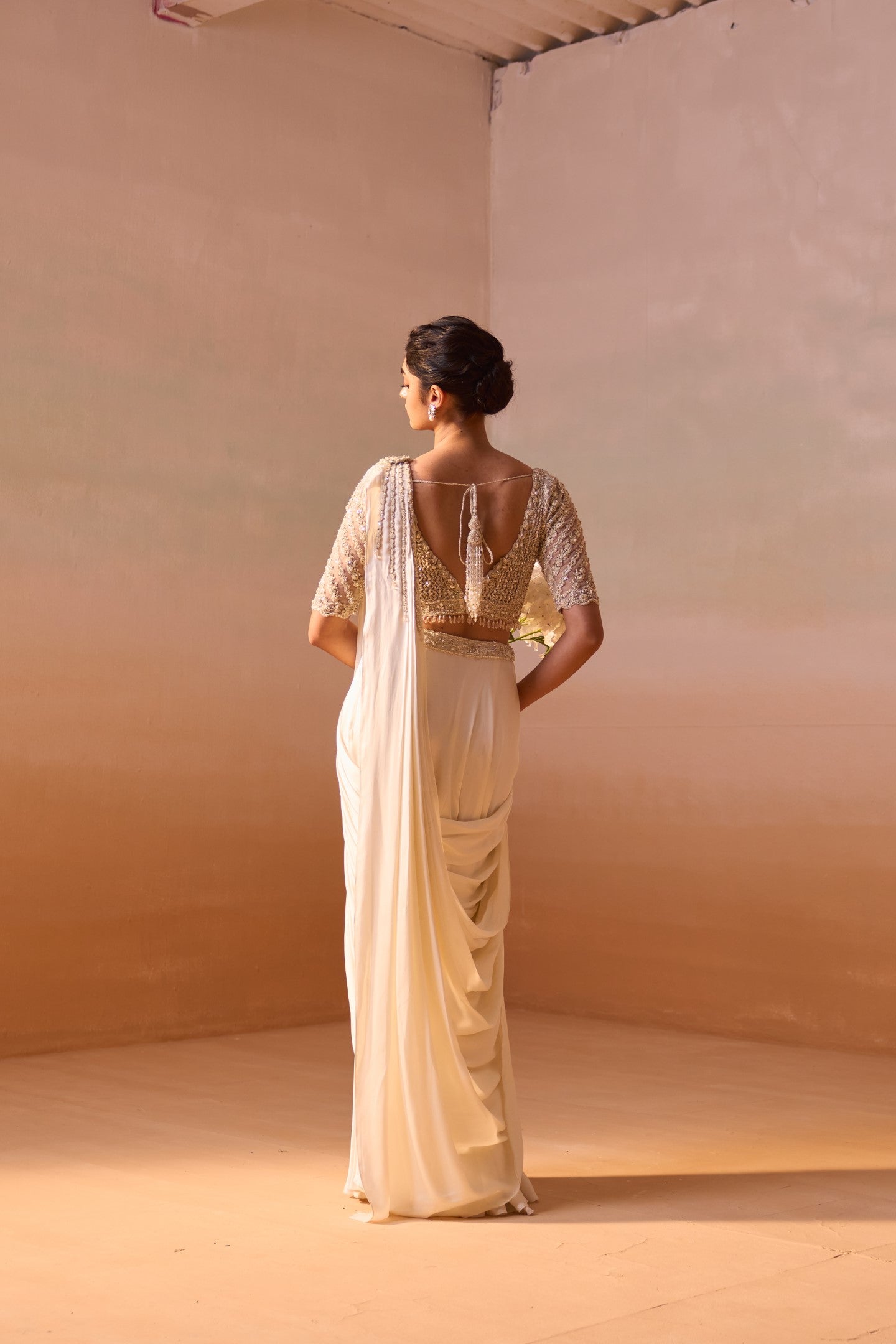 Ivory satin pre-draped saree with a blouse worked in ivory dori enhanced with pearls and beadwork.