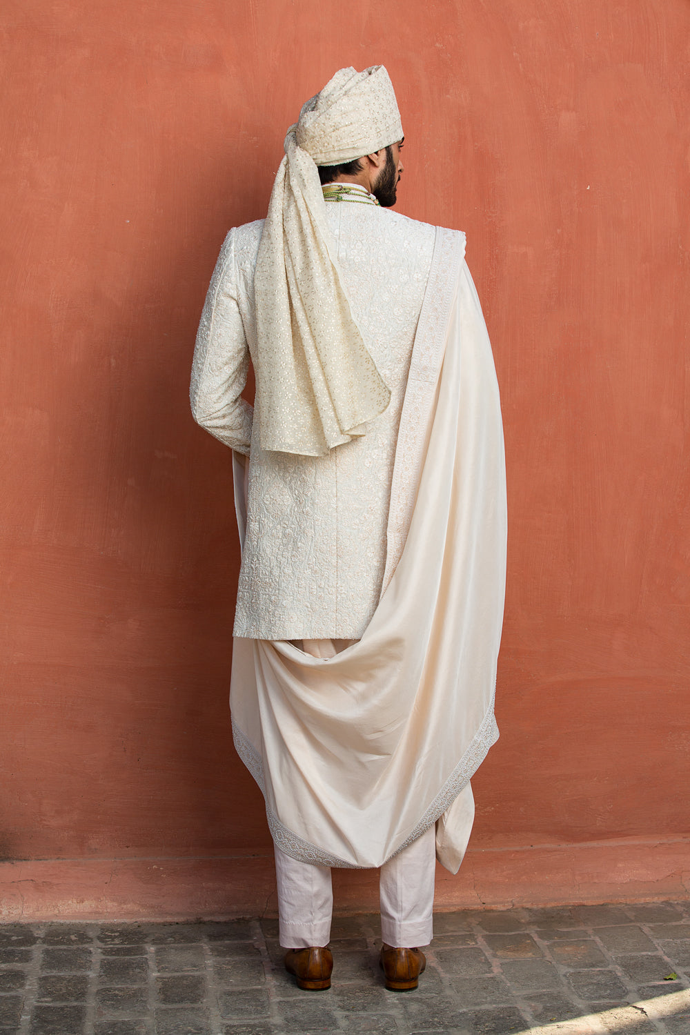 Ivory Embroidered Raw Silk Achkan embroidered all over with resham cutdana and beadwork with tussar kurta and cotton lycra trousers.