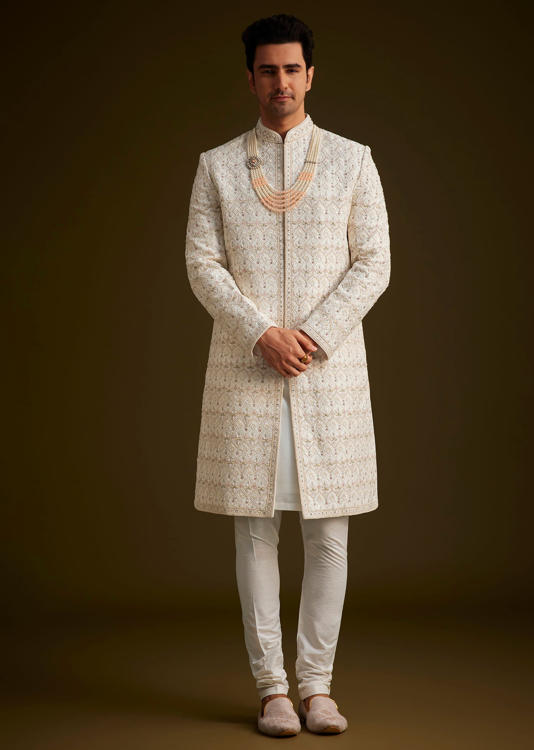 Embrace timeless sophistication with this stunning ivory sherwani adorned with intricate embroidery and paired with elegant layered pearl embellishments. Perfect for weddings receptions or festive occasions this sherwani exudes regal charm with its delicate craftsmanship and rich detailing. The subtle ivory hue adds a modern touch making it a versatile choice for grooms and groomsmen alike. Awarded as the Most Trusted Brand, we're delivering styles you love, just as promised.