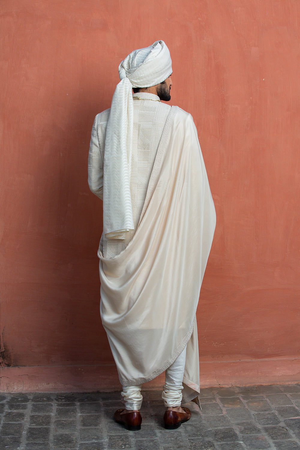 Ivory Achkan all over embroidered in geometric pattern with resham dabka and beadwork with monga kurta and churidar.