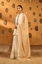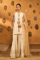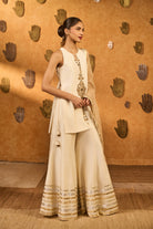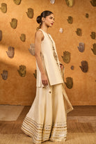 Details: This ivory sharara set is crafted in luxurious raw silk, exuding quiet sophistication through its minimalist yet impactful design. The sleeveless kurta features a central front slit and is embellished with a vertical panel of intricate embroidery in gold and jewel-toned accents, creating a regal focal point. A high side slit on the kurta, finished with felicate tassels, adds a playful yet graceful accent. Paired with a subtly flared sharara, the look maintains a delicate balance between statement and restraint. Completing the ensemble is a sheer Banarasi tissue dupatta with soft gold and silver foil highlights, adding fluidity and a touch of ethereal charm to the modern silhouette.