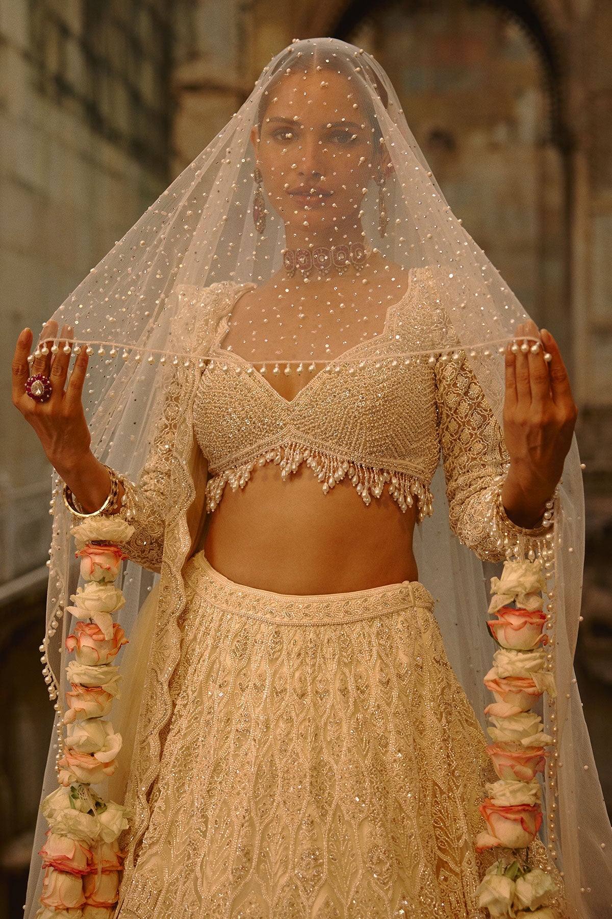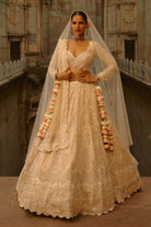 Ivory lehenga set featuring intricate detailing with sequins, cutdana, crystals, and pearls.Can be styled with an optional second dupatta for a more graceful and layered look.