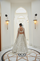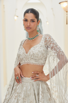Ivory Net Flared Skirt With A Shimmer Leather Underlayer And Blouse With Long Bird Sleeves Embroidered In Silver Beadwork, Sequins And Crystals.