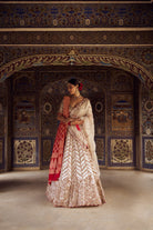 Ivory organza lehenga choli dupatta set embroidered in gold dabka, sequins, beadwork and red resham french knots. It has an optional red bandhej second dupatta that can be ordered separately.